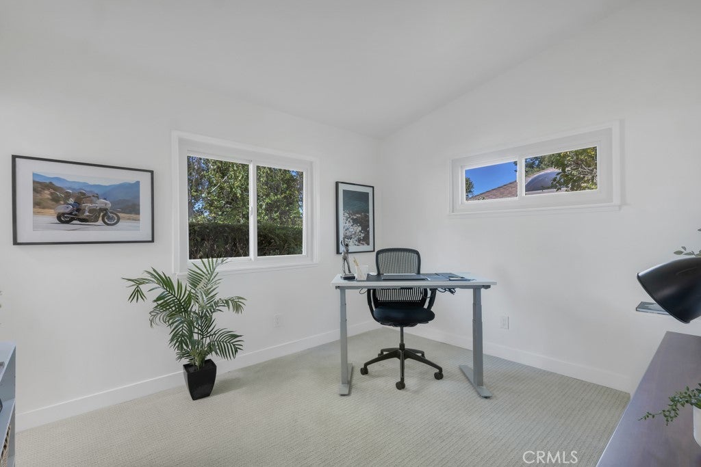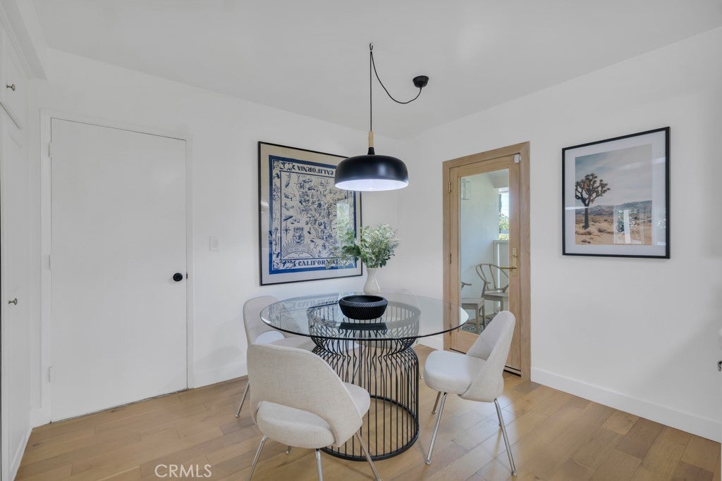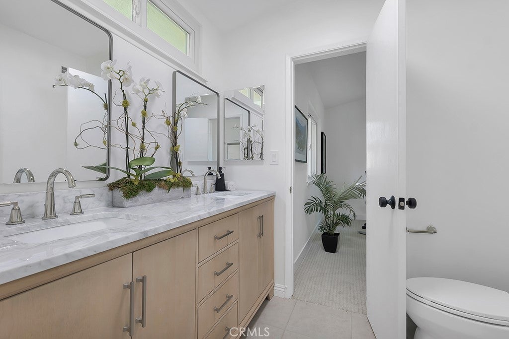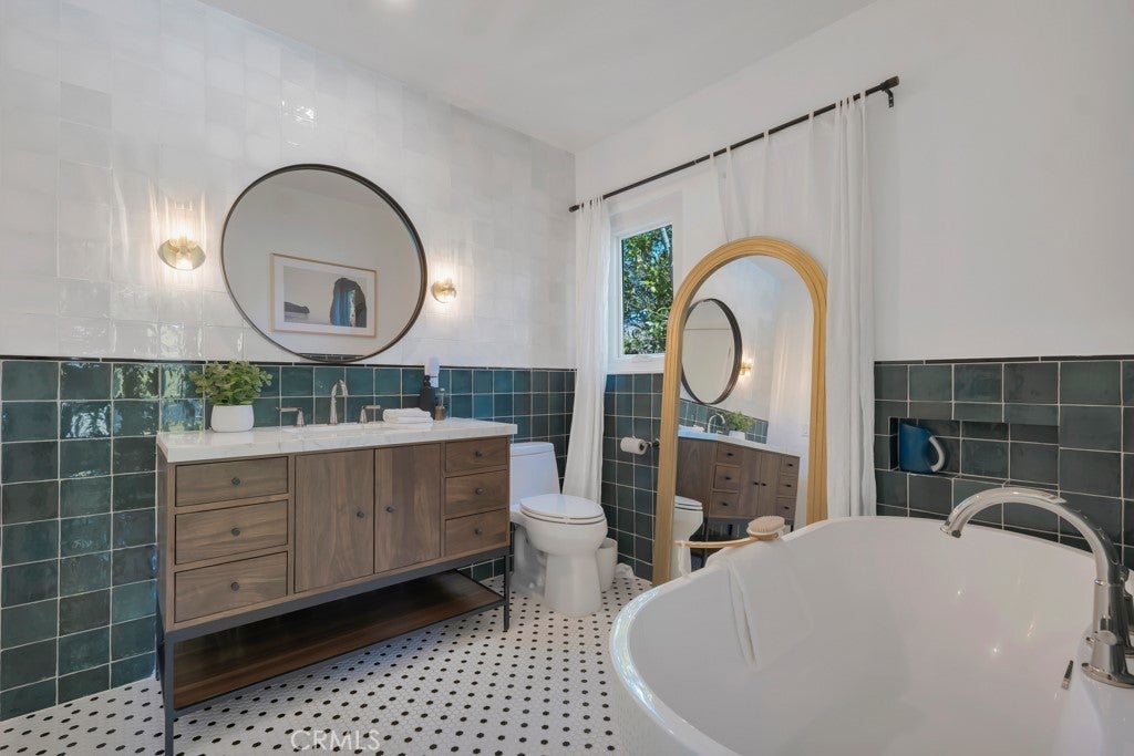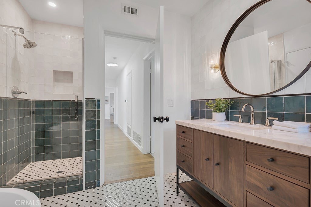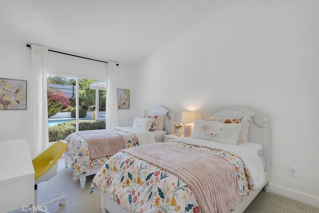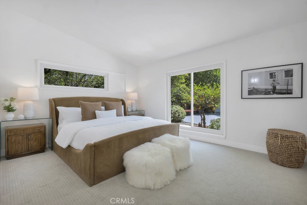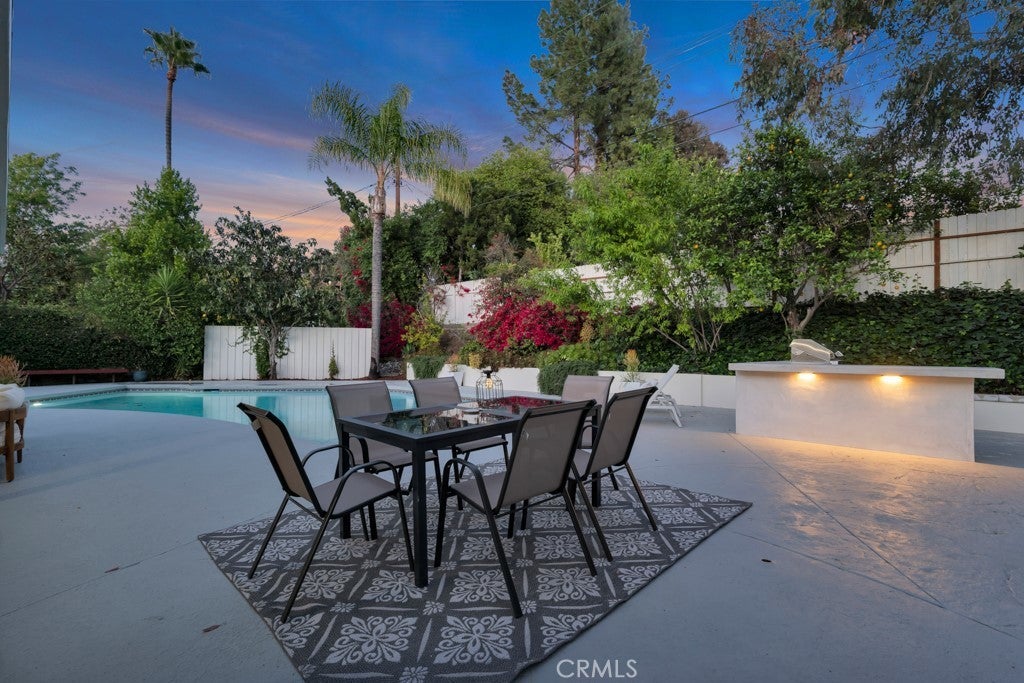 This stunning Charles Du Bois-designed Contemporary Ranch offers 2,115 sq ft of living space on a generous 11,703 sq ft lot in one of Woodland Hills' most sought-after neighborhoods. All the iconic Du Bois signatures are on full display: a striking stone facade, classic double entry doors, a low-pitched roofline with overhanging eaves, and a seamless indoor-outdoor flow that defines the best of mid-century California living. Inside, the sun-drenched open great room is anchored by a dramatic floor-to-ceiling stone fireplace, white-painted wood beam ceilings, and gleaming hardwood floors that connect the living and dining areas with effortless style. The updated kitchen features crisp white cabinetry, a diamond tile backsplash, a gas cooktop, and stainless appliances. The home's two designer bathrooms are showstoppers in their own right, one boasts a freestanding soaking tub, rich deep-green zellige tile, a walnut vanity, and classic penny tile floors, while the other features a dual-sink marble vanity and a glass-enclosed shower. Four well-proportioned bedrooms and a 2-car attached garage round out the interior, while the gated front yard with manicured hedges and lawn provides privacy and outstanding curb appeal. Out back, the resort-worthy yard is an entertainer's dream, a large sparkling pool, an expansive grass area, and a generous covered patio perfect for al fresco dining or relaxed outdoor seating, all framed by vibrant bougainvillea and mature trees for total seclusion. Ideally situated with close proximity to the El Camino Shopping Center, The Commons at Calabasas, easy 101 freeway access, and nearby hiking trails, this is Southern California living at its finest.