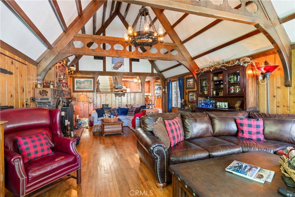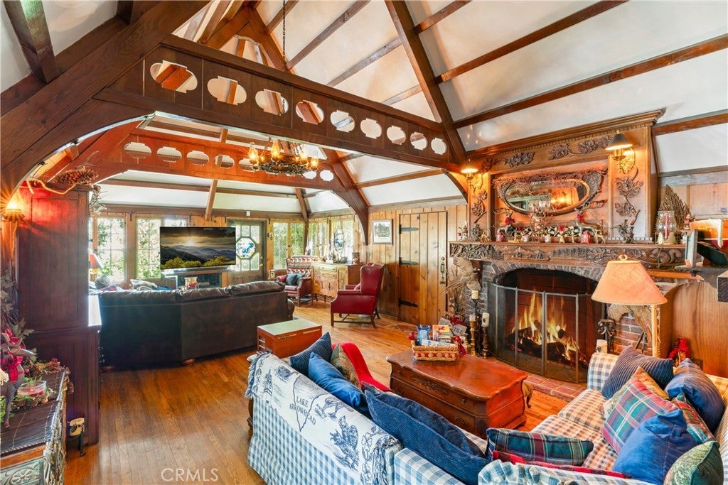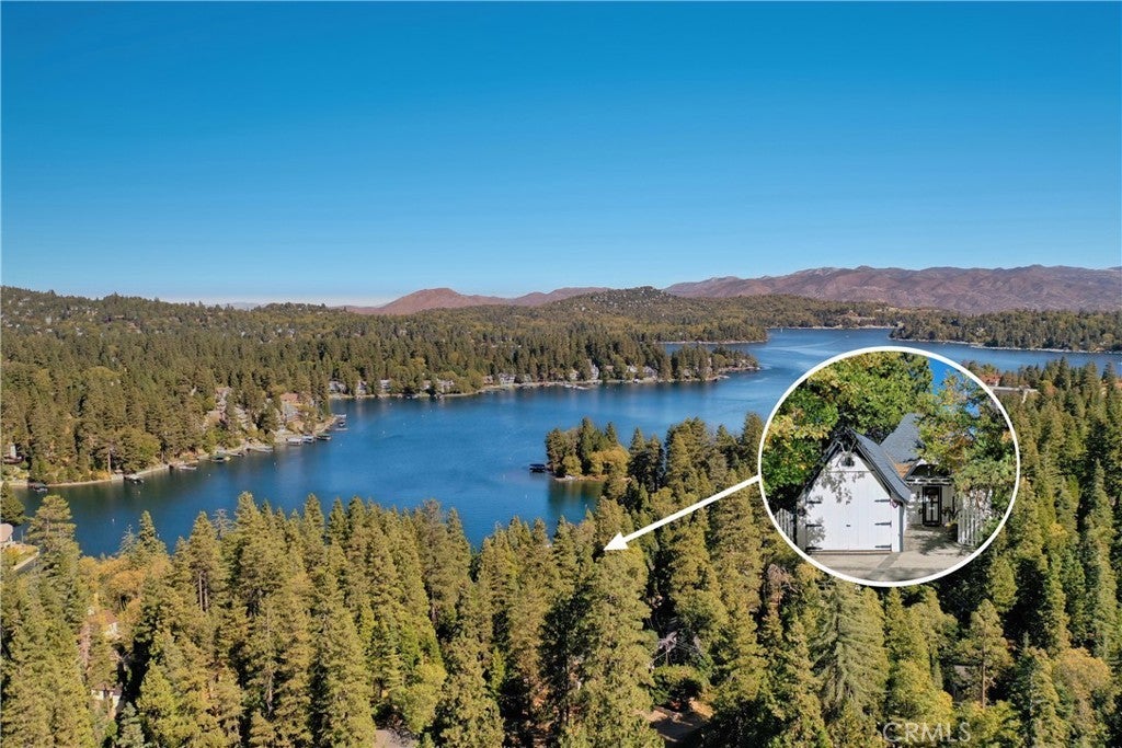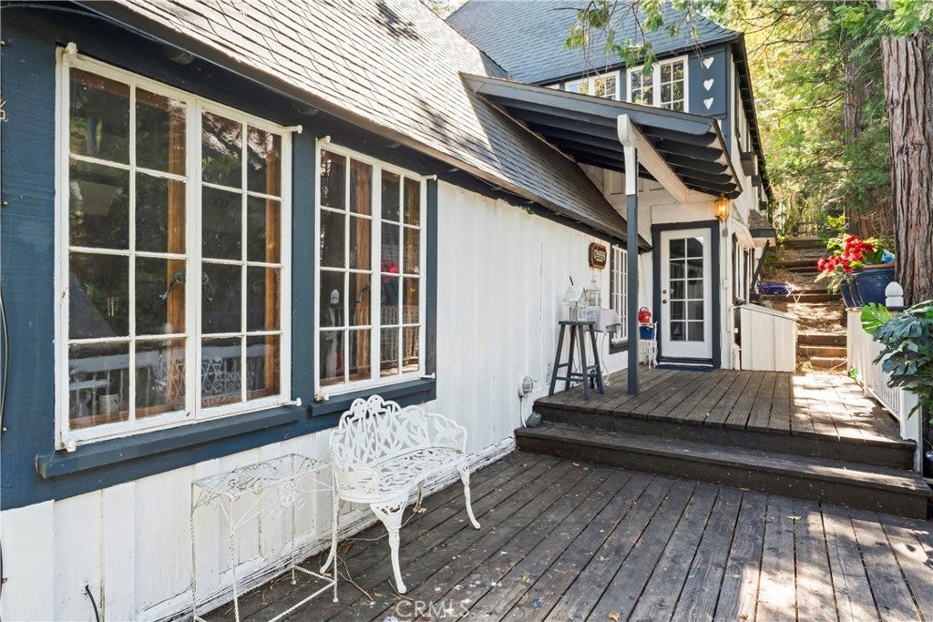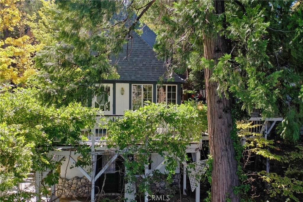 NEW PRICE!!!!! This Historical Classic Vintage Lakefront Home with take you on a magical tour with each room having an Alluring Theme. This enchanting property features three bedrooms, each with its own en suite bath ensuring comfort and privacy. The primary bedroom is conveniently located on the main floor, while two additional bedrooms are on the top floor. This Beauty also won the Lake Arrowhead Home Tour. The Amazing French Normandy ceiling and classic beams adds warmth throughout, complemented by charming French Windows. Stunning Hardwood floors with Hand Carved Mantel over Fireplace. Enjoy the large private deck accessible form both the dining and living rooms, perfect for relaxing or entertaining. Plus there is a small dog run for your furry friends. The downstairs studio offers a full bath and separate entry, with lake views and a short walk away to beautiful landscaping down to your brand new half a double dock. Discover the true Enchantment of Lake Arrowhead on the Water.