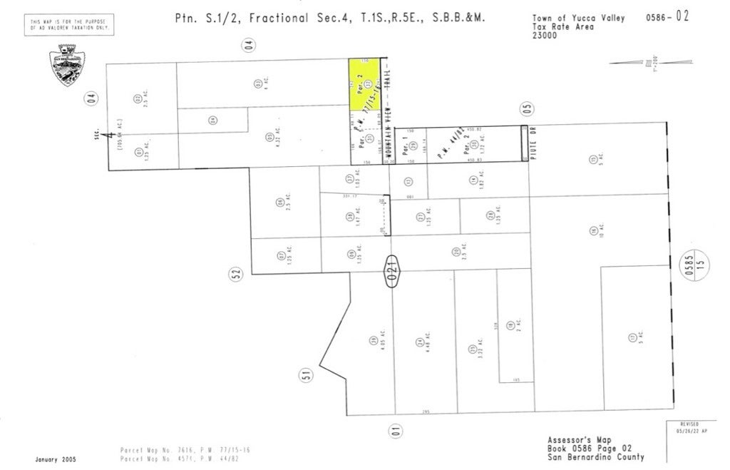 Discover your next opportunity with this expansive 36,300 square foot parcel located on Mountain View Trail in the serene and scenic city of Yucca Valley, California (92284). Nestled in a sought-after desert landscape, this spacious lot offers the perfect blend of privacy and natural beauty. Whether you're envisioning a peaceful retreat or an investment for future development, this prime location presents endless possibilities. With easy access to local amenities, stunning desert views, and the potential to create something truly unique, this parcel (APN: 0586-021-32) is a rare find. Don’t miss the chance to own a piece of Yucca Valley’s charm! ****No soils reports, surveys, etc., have been done. Buyer and buyer's agent to verify all information with the city or county for allowable uses and requirements and rely on their own investigations. **Buyer responsible for checking zoning, utilities, permits and exact property boundaries. ****