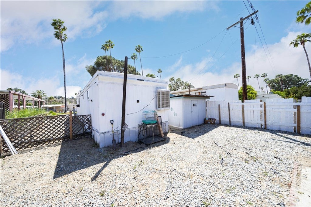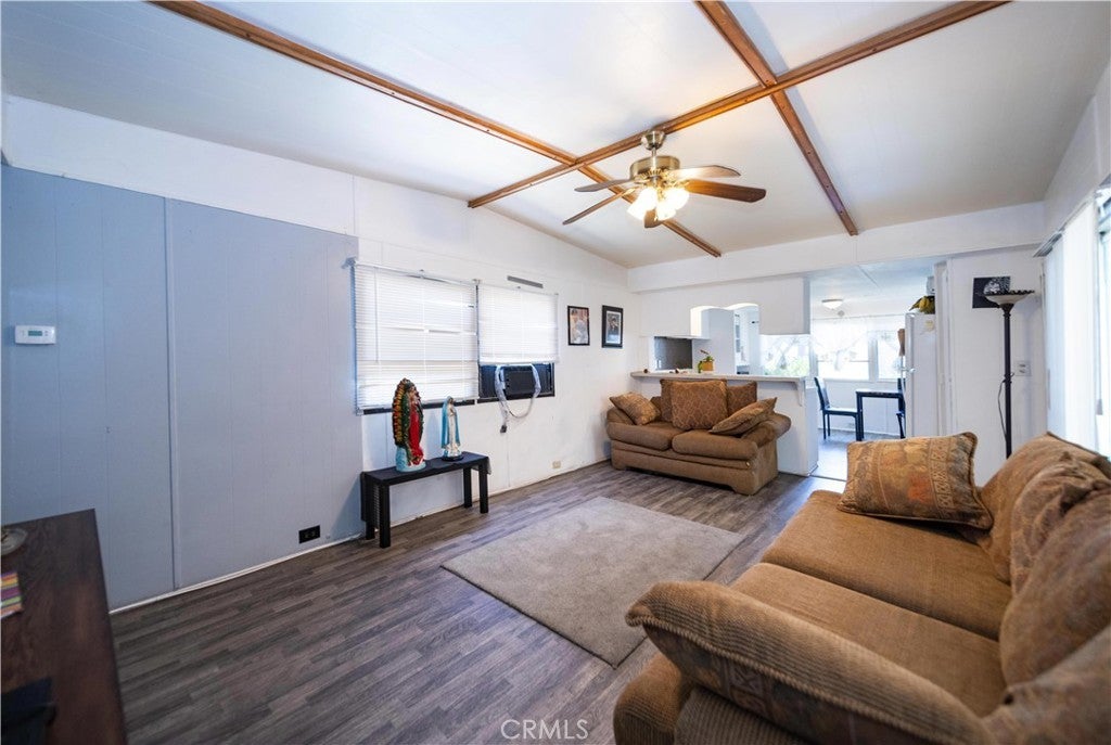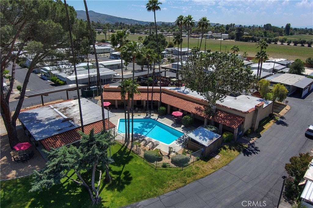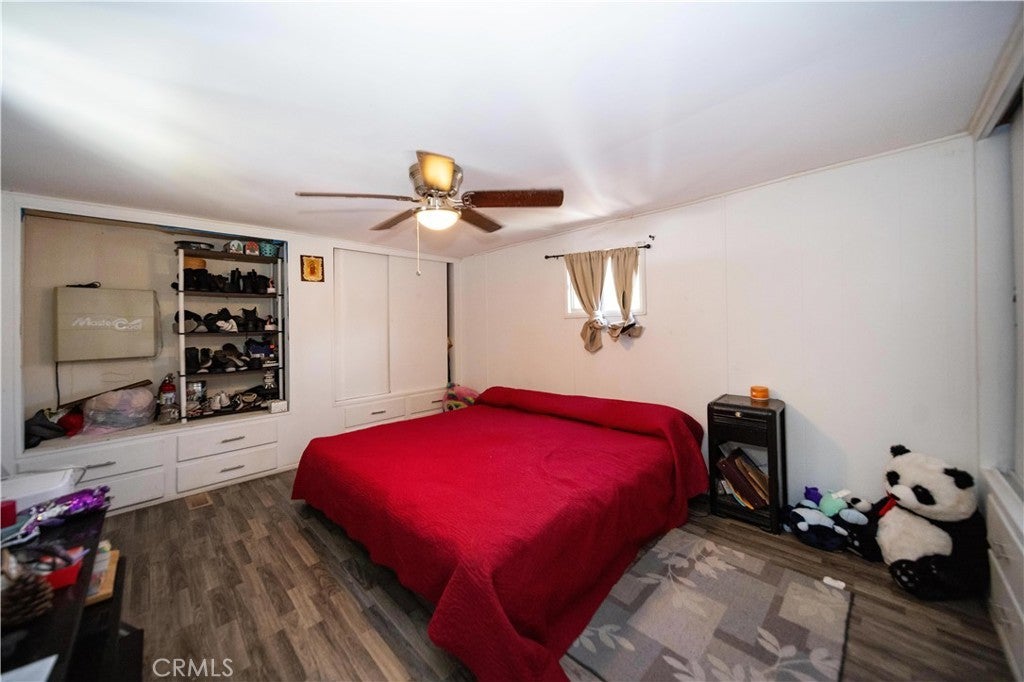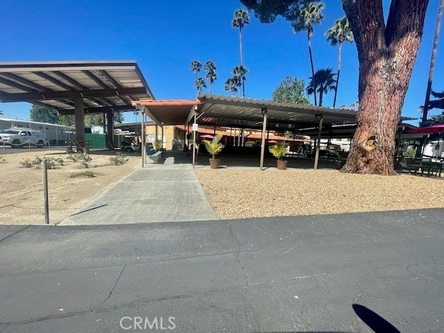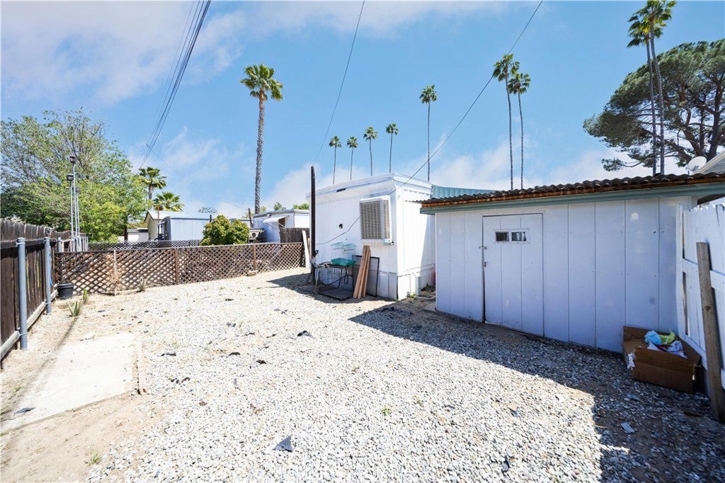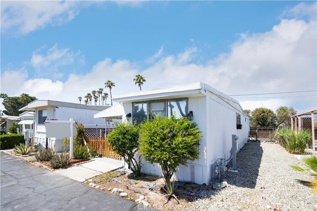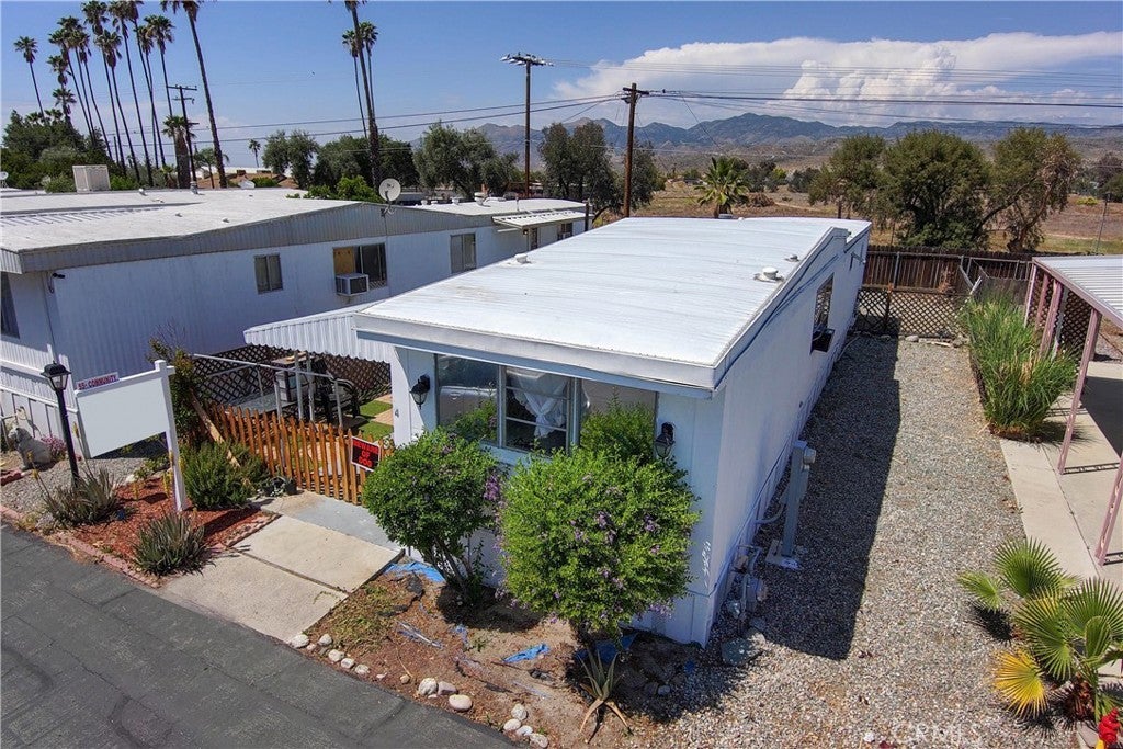 Welcome to this well-kept and charming home located in the desirable 55+ gate community of Pueblo Serrano. This property features spacious living room with laminate flooring throughout, creating a clean and modern feel. The large main bedroom comfortable fits a king-size bed and includes four closets and fourteen built-in drawers, offering exceptional storage. The bathroom is equipped with a vanity, tub, and separate shower. The kitchen provides abundant cabinet space, room for a dining table, and a bar area that can accommodate bar stools-perfect for casual meals. Outside, enjoy a covered patio with turf and tile, ideal for relaxing outdoors. The home is fenced from the side porch to the back of the house, and the washer and dryer are conveniently located under the porch. The large rear lot offers enough space to park a car, and two storage sheds are included with the property. The community is just a short walk to the clubhouse, pool and spa. It's also close to shopping centers and only a scenic drive away from the beautiful town of Idyllwild. Don't miss out on this opportunity to make this your home!