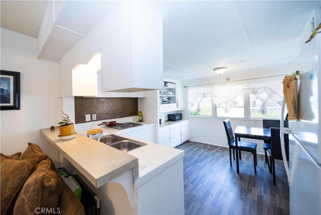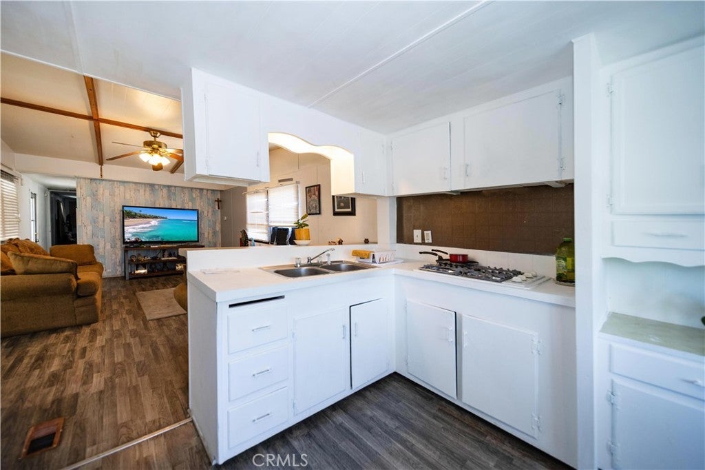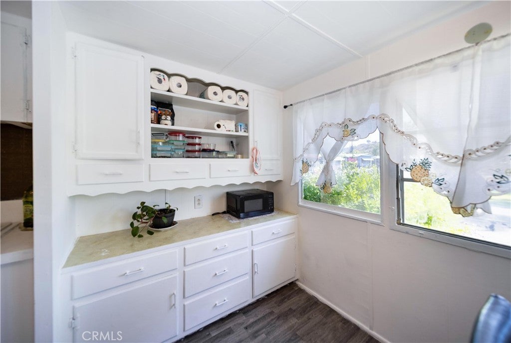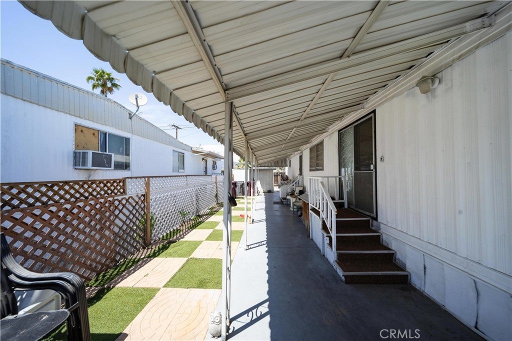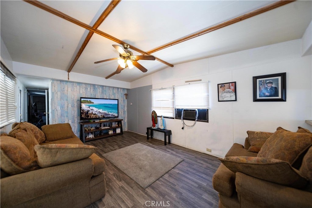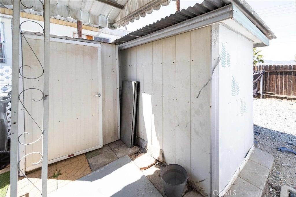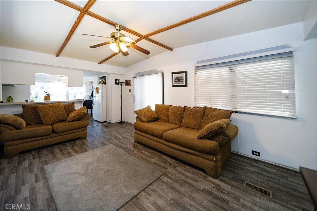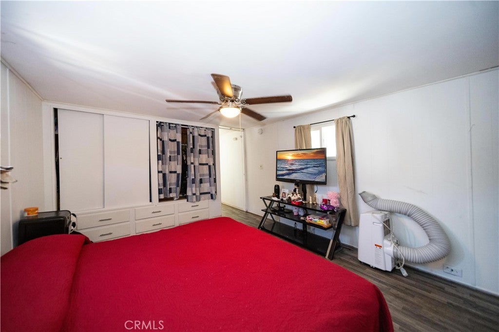 Welcome to this well-kept and charming home located in the desirable 55+ gate community of Pueblo Serrano. This property features spacious living room with laminate flooring throughout, creating a clean and modern feel. The large main bedroom comfortable fits a king-size bed and includes four closets and fourteen built-in drawers, offering exceptional storage. The bathroom is equipped with a vanity, tub, and separate shower. The kitchen provides abundant cabinet space, room for a dining table, and a bar area that can accommodate bar stools-perfect for casual meals. Outside, enjoy a covered patio with turf and tile, ideal for relaxing outdoors. The home is fenced from the side porch to the back of the house, and the washer and dryer are conveniently located under the porch. The large rear lot offers enough space to park a car, and two storage sheds are included with the property. The community is just a short walk to the clubhouse, pool and spa. It's also close to shopping centers and only a scenic drive away from the beautiful town of Idyllwild. Don't miss out on this opportunity to make this your home!
