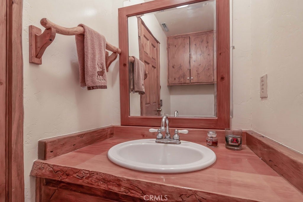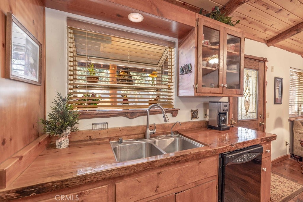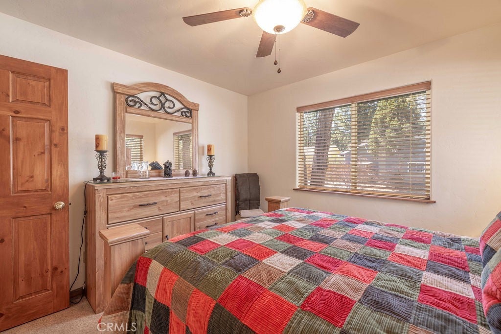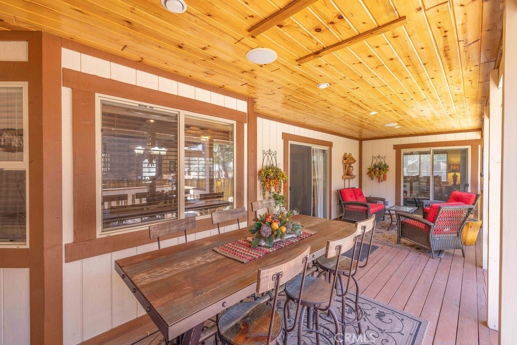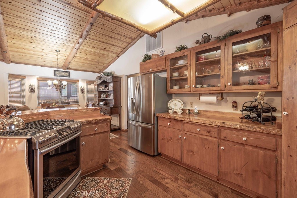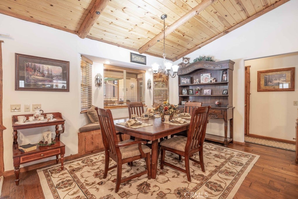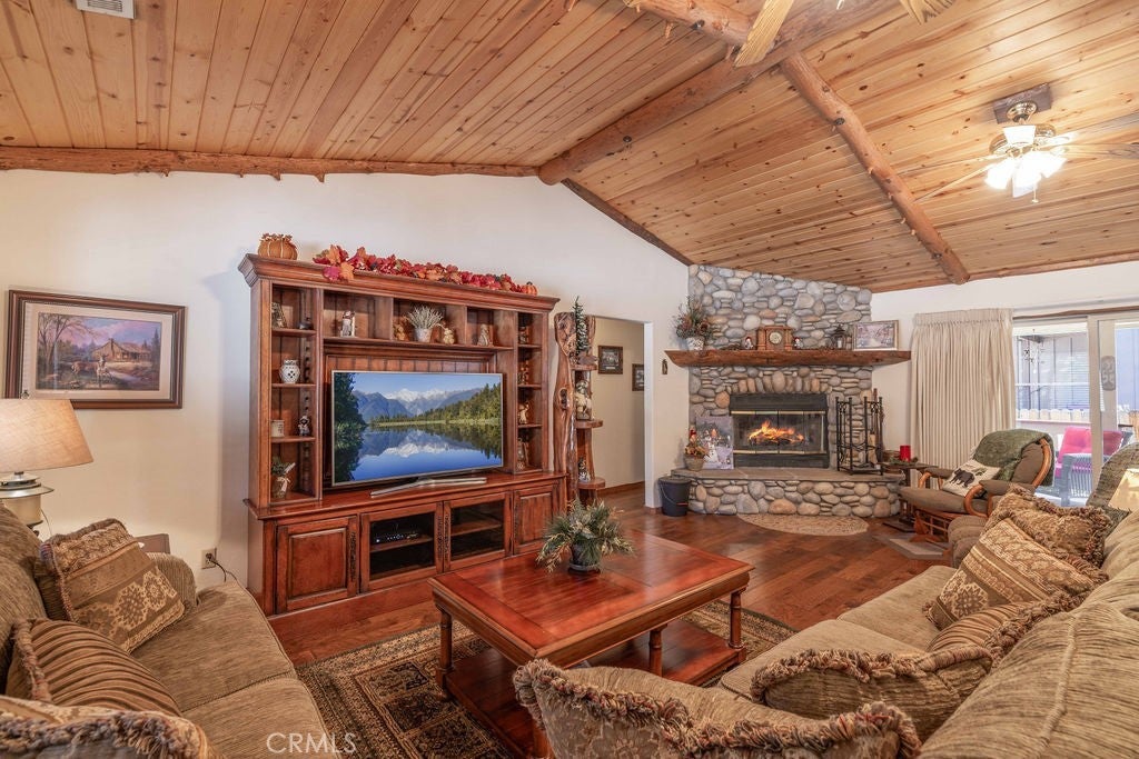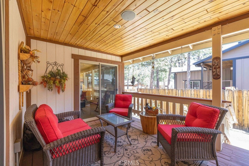 Elegance and Rustic charm meet right in the middle on this gorgeous SINGLE LEVEL 3 bedroom 3 bath log styled home in the heart of Big Bear. Located in one of the most desirable neighborhoods this home sits on a nice sized corner lot fit with RV/Boat Parking and a full garage. A quaint front porch adorns the front door. As you enter the home the interior is sure to dazzle. The ceilings are beautifully vaulted (tongue and groove wood) and you are greeted by a nice sized Great Room with Kitchen. Set up for entertaining the host will not miss out on any fun in this chef sized kitchen adjacent to the living room. The kitchen has granite countertops, a stove set into the island, view of the Stone Fireplace, and is adjacent to the dining area. Out the back slider you'll find a huge finished and covered deck already fitted with spa electrical hookups. Off the back porch you'll find plenty of room for a garden or backyard chickens or whatever your heart desires. Inside you'll find a Master bedroom with a huge walk-in closet an attached master bathroom. There is a desk nook with storage cabinets above off the hallway separate of the living room. The other two bedrooms have their own full bathroom separate from the 3rd bathroom (1/2 bath). The laundry hookups are in the 2 car finished garage. This home is truly turnkey!