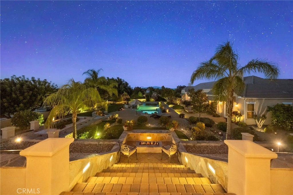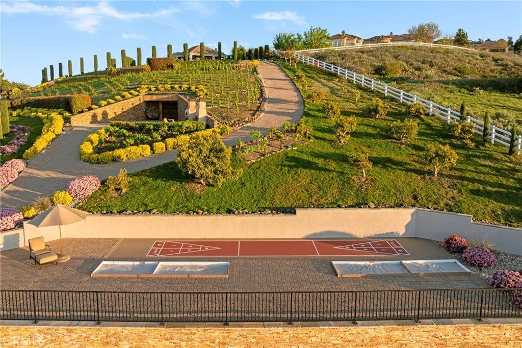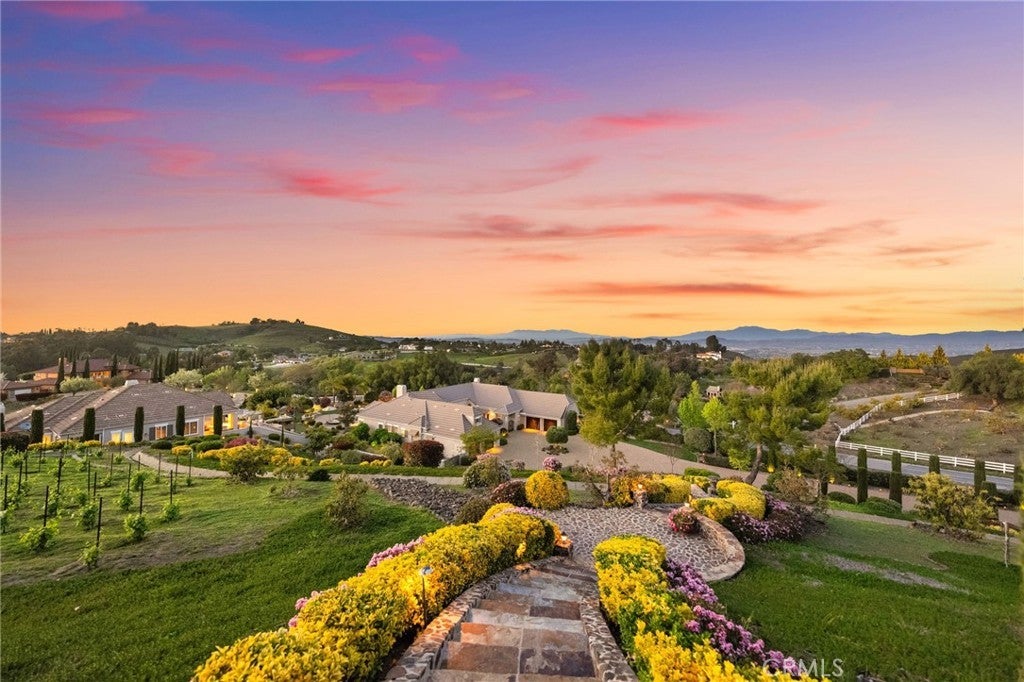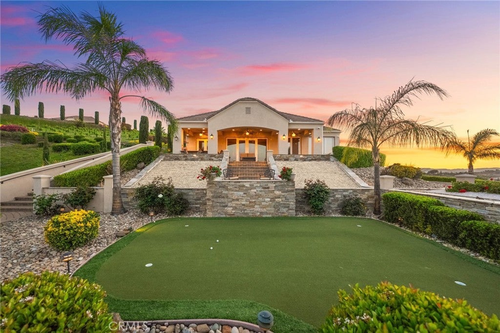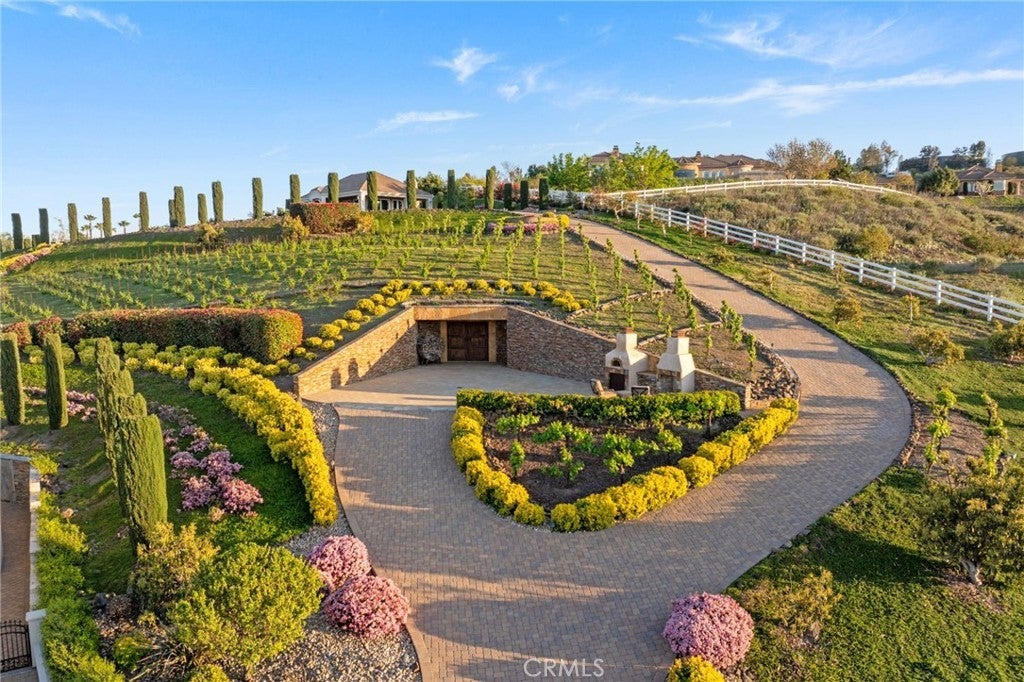 One-of-a-kind estate located just 5 minutes from the charm & culture of Old Town Temecula. Set behind 3 private gated entrances, this sprawling 4.19 acre compound features 3 separate single-story residences & an underground wine cellar all totaling approx. 6100 sq ft, masterfully positioned to capture breathtaking sunset views across rolling hills. The grounds truly set this estate apart; meticulously manicured landscapes framed by stately Italian cypress trees create an outdoor setting unlike any other. A dramatic stone stairway leads from the main home to the elevated studio residence. Entertain w/ ease and elegance w/resort style amenities; sparkling pool, two separate spas, water features, outdoor fireplaces, 2 putting greens, a sports court, & a post-tensioned tennis court w/ breathtaking views. Plus 2 built-in BBQ islands & pizza oven. Approx. 30,000 sq ft of stone pavers weave through the property. The main residence is approx. 3,275 sq ft w/ travertine flooring & architectural arches. It features 3 bedrooms, office, & 3.5 baths. The gourmet kitchen complete with granite countertops, 2 sinks, stainless steel appliances, built-in refrigerator, walk-in pantry, wine fridge, butler's pantry, & bar seating-all flowing seamlessly into the family room w/ views of the pool & gardens. The primary suite offers a private retreat w/ its own fireplace & French doors leading to the amazing pool & spa. The guest house offers approx. 1,600 sq ft of luxury living w/ 2 bdrms, 2 baths, a chef’s kitchen, & fully retractable glass doors opening to commanding views of the surrounding countryside. At the estate's highest point, the studio offers approx. 600 sq ft of open-concept living, complete with an elevated desk area, curved wine bar, a built-in spa, putting green, rooftop lounge, ATV-sized garage, & unmatched panoramic vistas. A 600 sq ft stand-alone reinforced concrete wine cellar is the perfect sanctuary for wine-making enthusiasts - complemented by approx. 1,000 wine grapevines and 21 table grapevines, as well as approx. 100 avocado trees, and various fruit trees. Additional features include upgraded mahogany garage doors, extensive landscape lighting, whole house & outdoor sound systems, multiple whole-house fans for year-round comfort, & a comprehensive security system. Perfect for a multigenerational compound, vineyard retreat, or entertainer's paradise, this Temecula estate redefines California luxury living with a setting that must be seen to be believed.