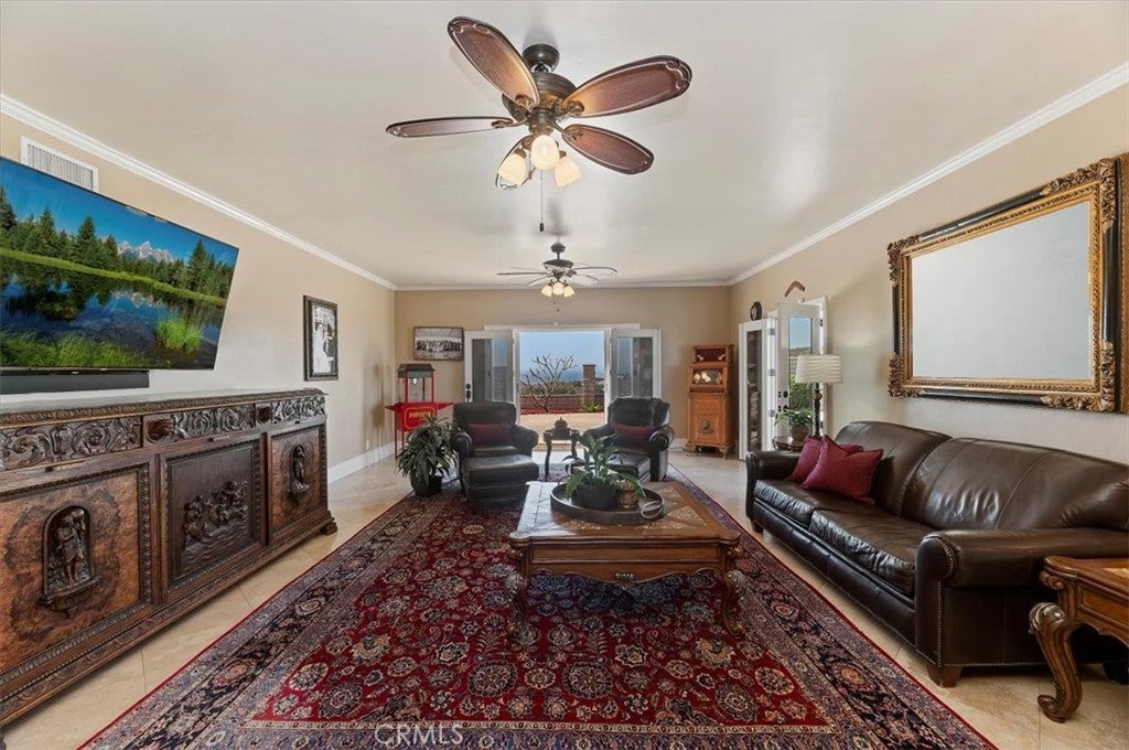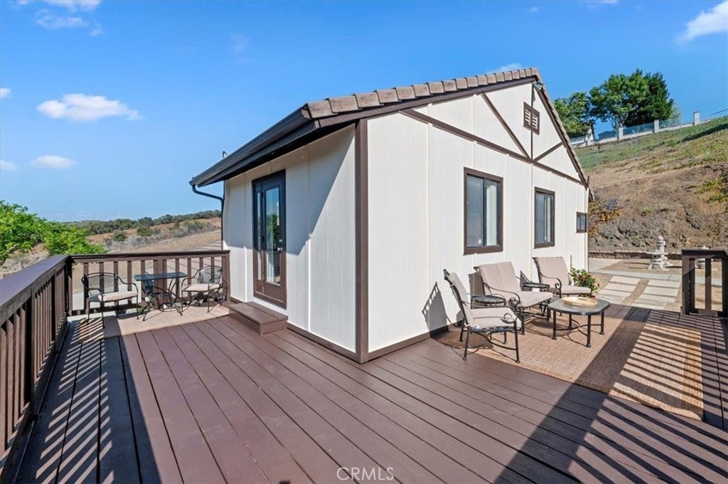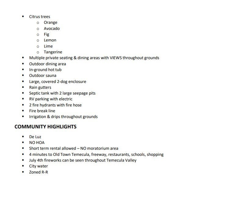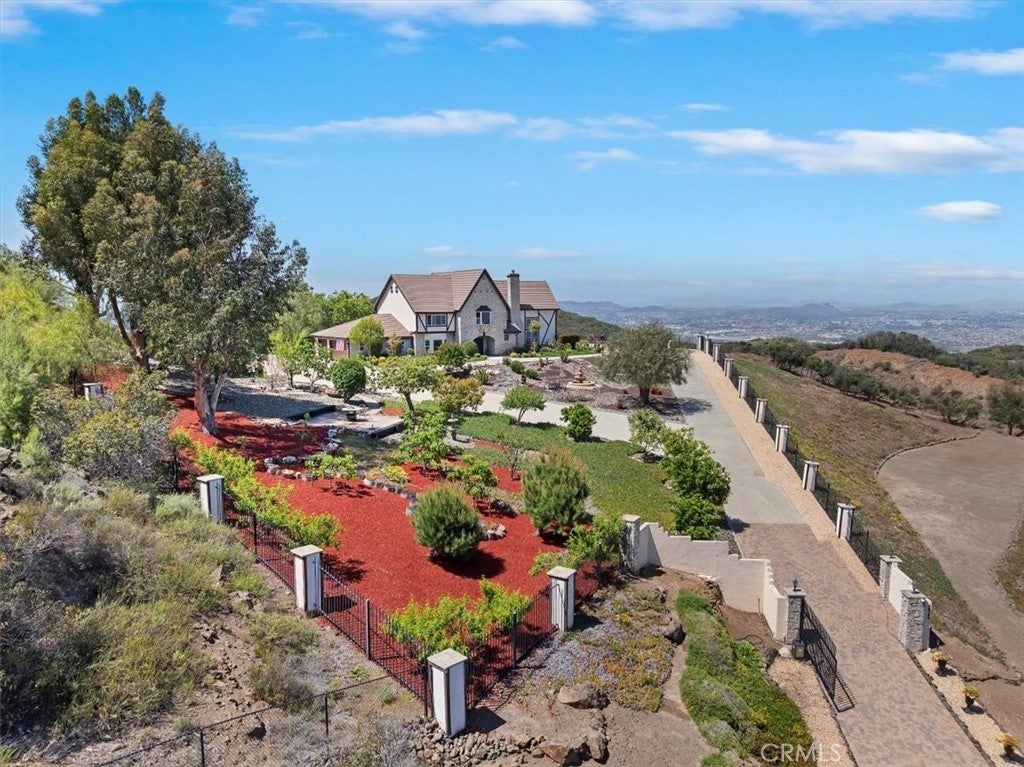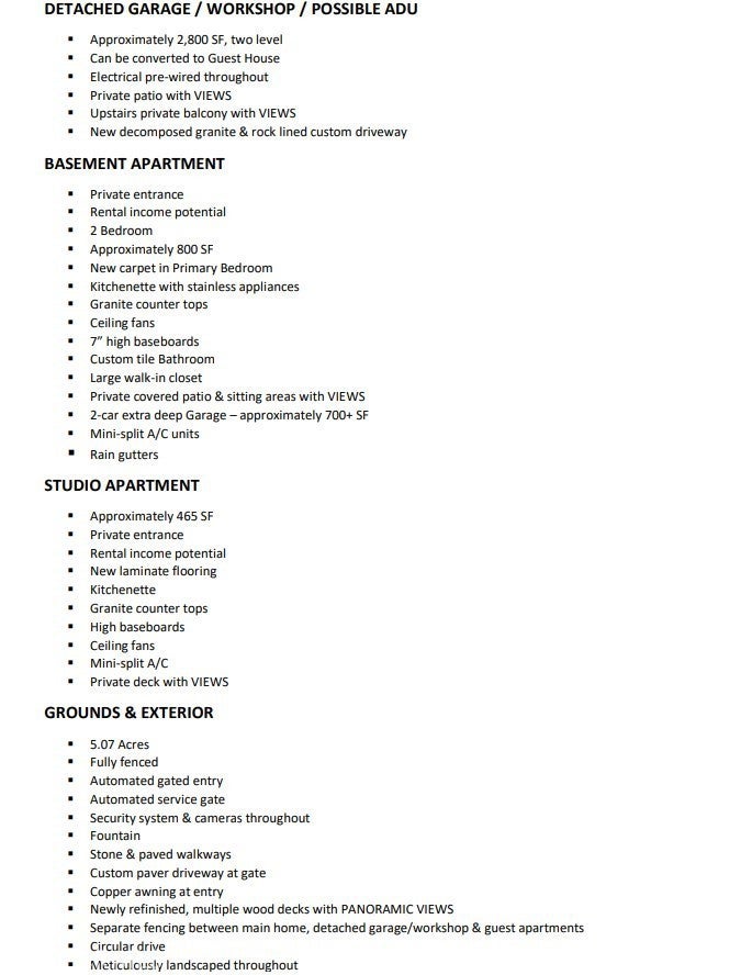 NEW PRICE! $2,499,000-$2,599,000. Nestled in the hills of De Luz, ONLY 4 minutes to Old Town Temecula & freeway. STUNNING 3-RESIDENCE COMPOUND has a combined approximately 5,515 SF LIVING AREA between main home & two separate units + 2,800 SF pre-wired, 2-level DETACHED WORKSHOP / GARAGE offering enormous POTENTIAL AS A THIRD ADU OR LUXURY GUEST HOUSE, with private balcony, patio & scenic views from every angle (a combined total of 8,300+ SF potential living areas). This rare property includes TWO INCOME-PRODUCING UNITS with a 2-bedroom 800 SF BASEMENT APARTMENT with private entrance, 2-car 700+ SF Garage, Kitchenette & covered patio plus a separate 465 SF STUDIO WITH PRIVATE DECK, new flooring & mini-split A/C. Both units are ideal for guests, rentals, or multigenerational living. INVESTORS – SHORT TERM RENTALS ARE ALSO ALLOWED FOR ADDITIONAL RENTAL INCOME POTENTIAL and NO HOA! Separate Garages can hold a total of 9 cars. Fully fenced, dual-gated 5.07 acres offers unmatched privacy, PANORAMIC VIEWS & exceptional versatility. Main grand English Tudor residence spans 4,250 SF with 4 bedrooms, 3 baths, beautiful hardwood and tile flooring, 7” base, crown moulding & high-end finishes throughout. Formal Living Room features 20’ ceilings, stack-stone fireplace, and elegant Kitchen boasts granite counters, stainless appliances, large island & French doors opening to a private patio with SWEEPING CITY AND MOUNTAIN VIEWS. Oversized Primary Suite includes dual French doors to private deck with PANORAMIC VIEWS, a spa-like Bath includes soaking tub & quartz vanities, large travertine shower + custom, walk-in closet with built-ins. Additional features include a Formal Dining Room, Family Room with 3 sets of dual French doors out to private PANORAMIC VIEWING patios and decks, a built-in bar and in-ground hot tub—perfect for relaxing under the stars. Outdoors, enjoy beautifully landscaped grounds, fruit trees (orange, avocado, fig, lemon, lime, tangerine), copper-awning Entry, circular drive, RV parking with electric hookup, and fire safety features include 2 hydrants and fire break. WINDING STONE AND PAVER WALKING PATHS connect multiple private seating and dining areas, each designed to maximize the breathtaking views across Temecula Valley and beyond. This magnificent Estate offers the ultimate combination of space, flexibility, and luxury living in Southern California. Just minutes to Old Town Temecula, Wine Country, restaurants, golf, Pechanga, shopping and freeway.