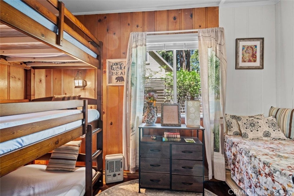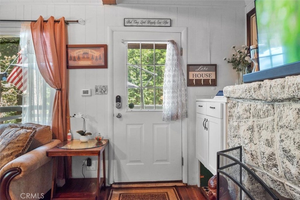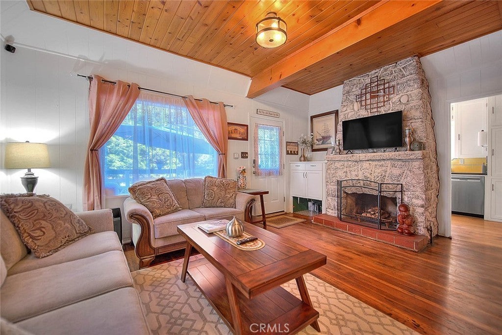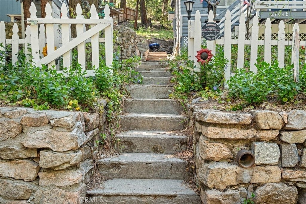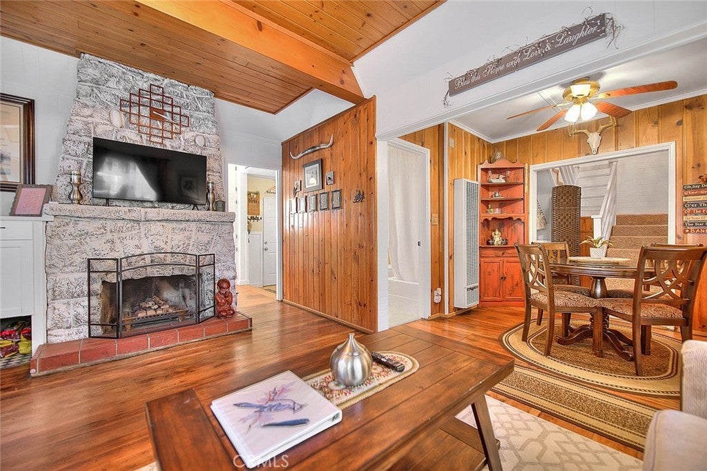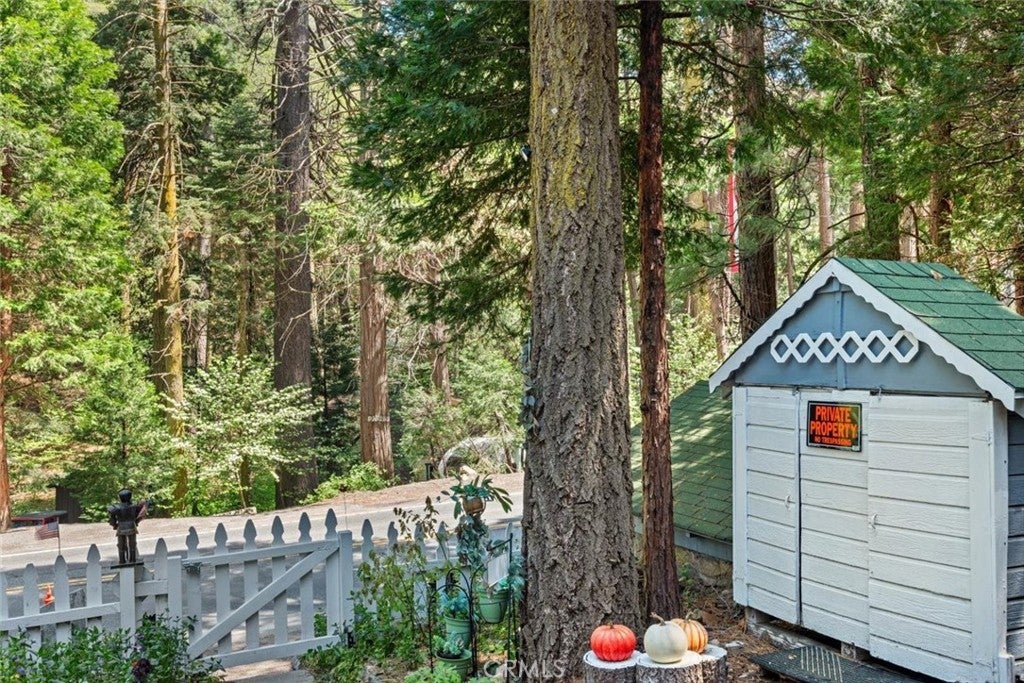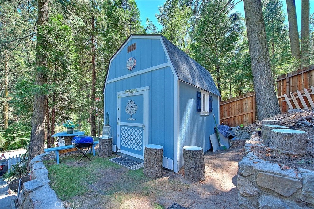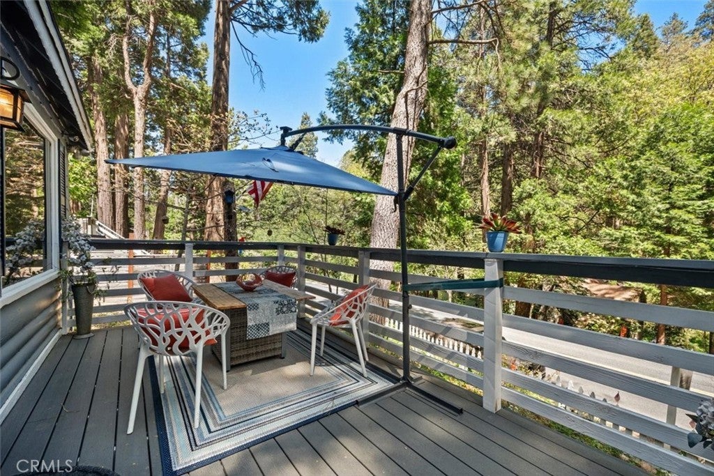 NEW PRICING Own a piece of Blue Jay/Lake Arrowhead history. This 1923 built vintage cabin embodies its original charm, and features unique upgrades! Sitting on a quarter acre lot that backs up to acres of protected forest, you will experience what the Arrowhead area offered when it first began. This three bedroom cabin features an updated kitchen with Bosch dishwasher, updated full bath including the original bath tub, along with updated plumbing, and updated electrical, refurbished 1923 stone fireplace and original refinished hardwood floors. The downstairs bedroom was expanded and now accommodates a a triple bunk bed and a single bed. The other two bedrooms are upstairs. New blinds, freshly painted inside and out about two years ago with replaced light fixtures from the past to continue the history of this loved cabin. Added corner cabinets for charm and storage. Detached original single car, deep garage with stone walls makes a great storage area! New Trex patio on front with umbrella solar lights and firepit to extend your outdoor living space. The outdoor space is home to age old cedar and pine trees and local blue jay birds. Also, less than a quarter of a mile from the restaurants and shops of Blue Jay! You can walk to the village, just 12 cabins away and only a half a mile walk to the lake as well. This property backs up hundreds of acres with hiking trails. The plateau on the side of the cabin has a new guest house to accommodate 3 more guest or use as a large shed for even more storage if so desired. Maybe a great Air B & B? This comes fully furnished as shown. Street side parking for 3-4 cars.