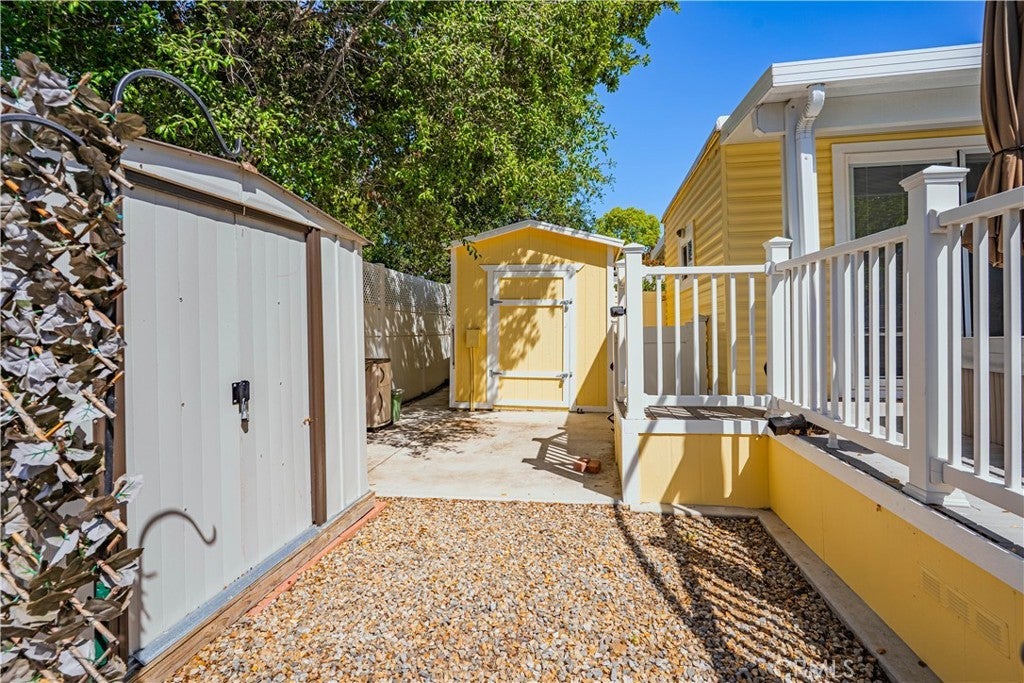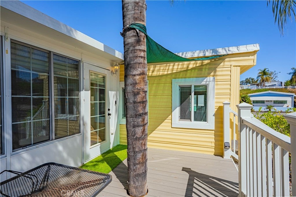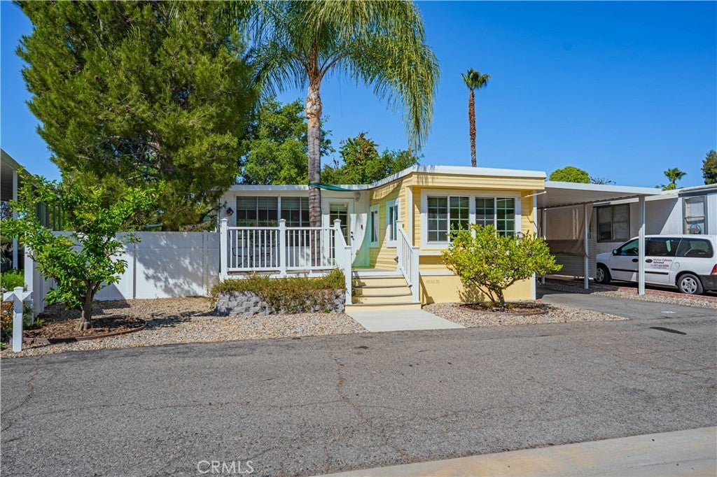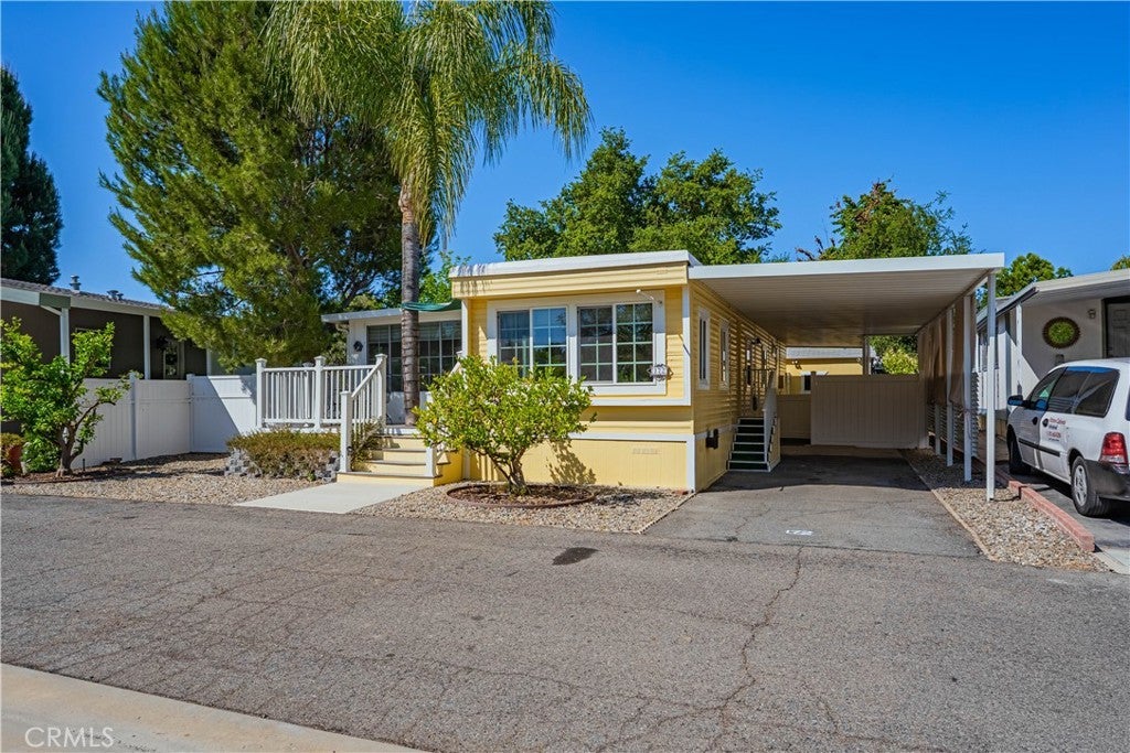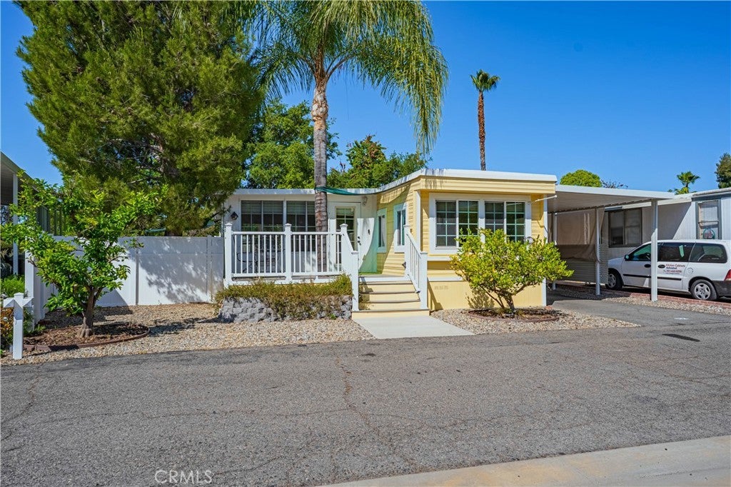 Welcome to the stunning Heritage Mobile home park in Temecula! As you approach the front entrance you'll be greeted by an inviting patio, perfect for morning coffee. This super cute 2 bedroom 1 bath has a warm and inviting atmosphere with cozy front room that is perfect for entertaining, featuring large windows that flood the space with natural light. The modern kitchen boasts stainless steel appliances and generous granite countertops, dinning area ideal for gatherings with family & friends. Washer & Dryer is conveniently located between the 2 bedrooms, walk-in shower featuring sliding glass doors, and dual vanities offering comfort and style. Venture outside to your private backyard oasis complete with a private hot tub built into the deck for easy access, artificial turf for low maintenance & mature trees, newer vinyl fencing, 2 storage sheds for additional storage!! Minutes to shopping, entertainment, golfing, wineries and FWY! The beautiful Heritage community offers an expansive pool & spa, bbq area, clubhouse, miniature golf & lots of fun activities for all residence.