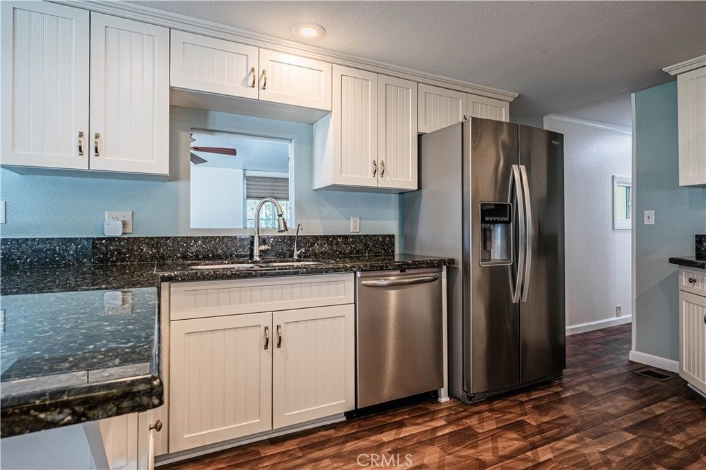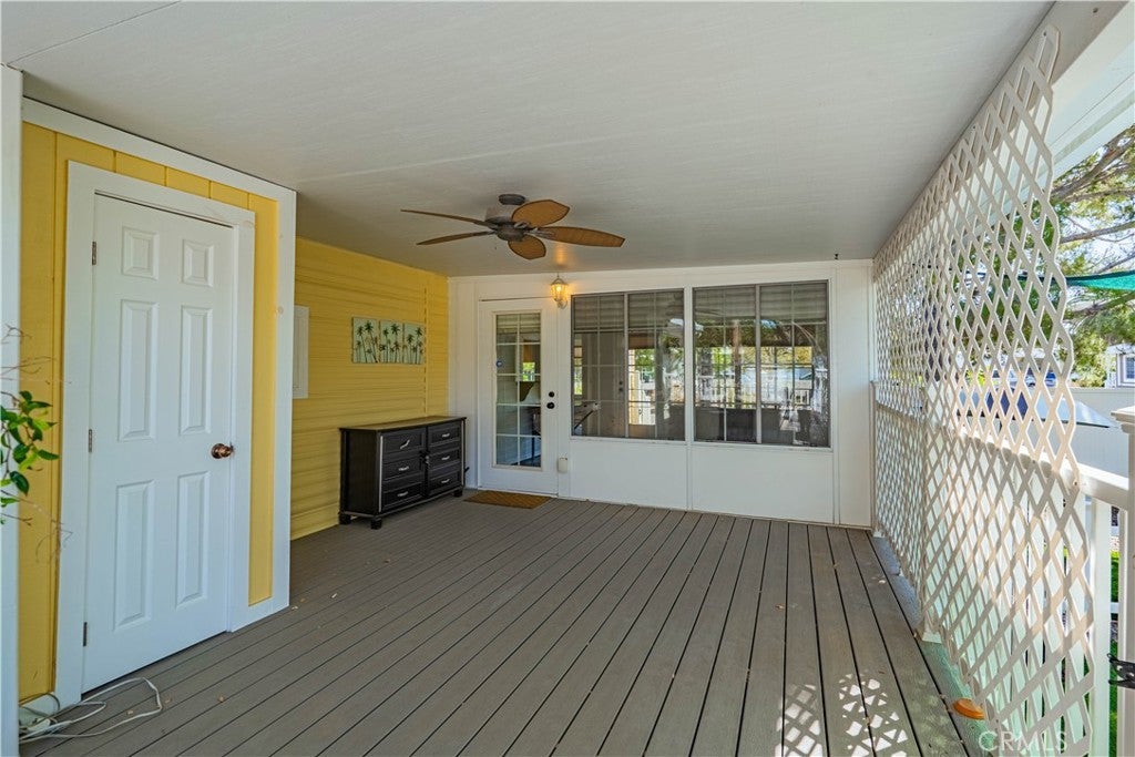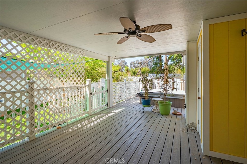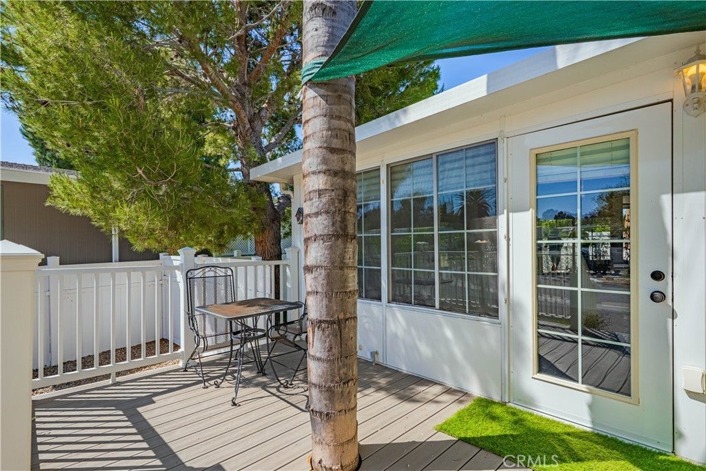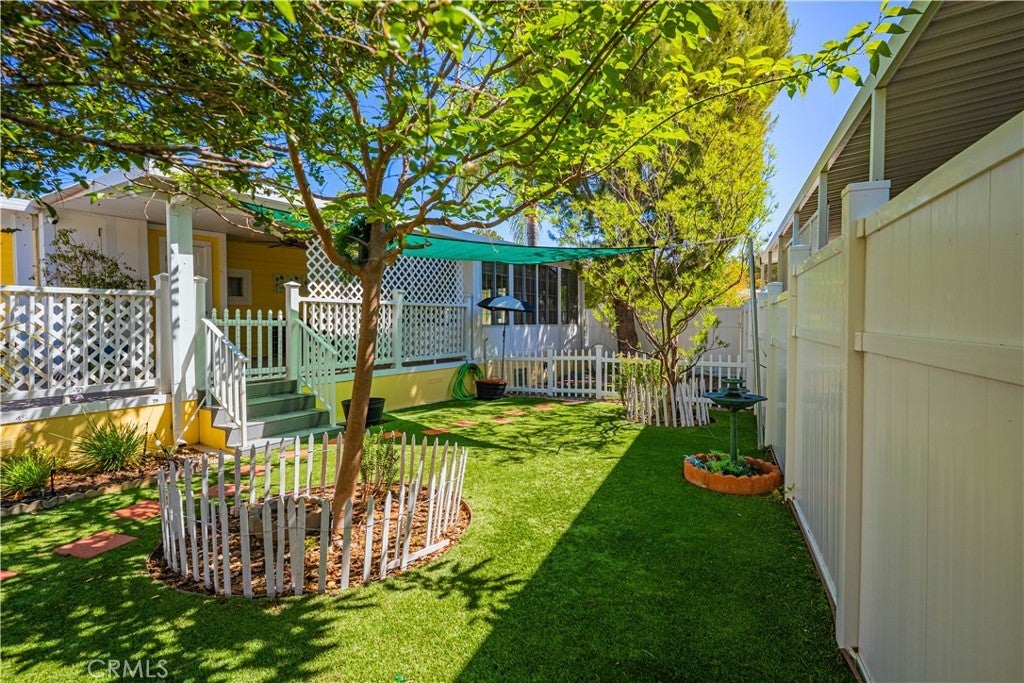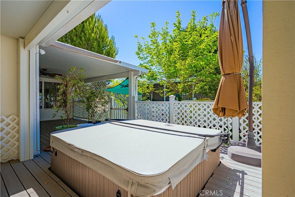 Welcome to the stunning Heritage Mobile home park in Temecula! As you approach the front entrance you'll be greeted by an inviting patio, perfect for morning coffee. This super cute 2 bedroom 1 bath has a warm and inviting atmosphere with cozy front room that is perfect for entertaining, featuring large windows that flood the space with natural light. The modern kitchen boasts stainless steel appliances and generous granite countertops, dinning area ideal for gatherings with family & friends. Washer & Dryer is conveniently located between the 2 bedrooms, walk-in shower featuring sliding glass doors, and dual vanities offering comfort and style. Venture outside to your private backyard oasis complete with a private hot tub built into the deck for easy access, artificial turf for low maintenance & mature trees, newer vinyl fencing, 2 storage sheds for additional storage!! Minutes to shopping, entertainment, golfing, wineries and FWY! The beautiful Heritage community offers an expansive pool & spa, bbq area, clubhouse, miniature golf & lots of fun activities for all residence.