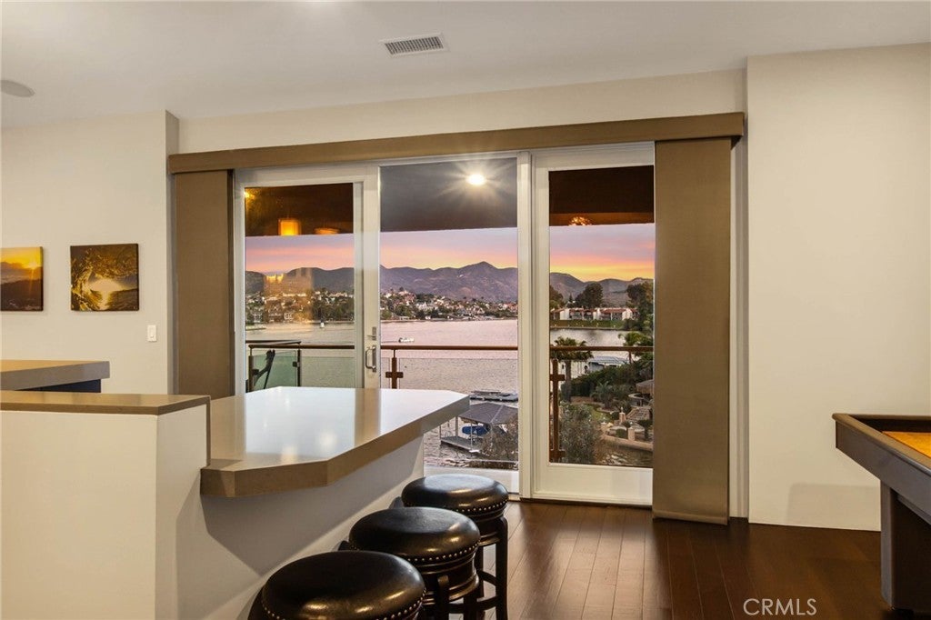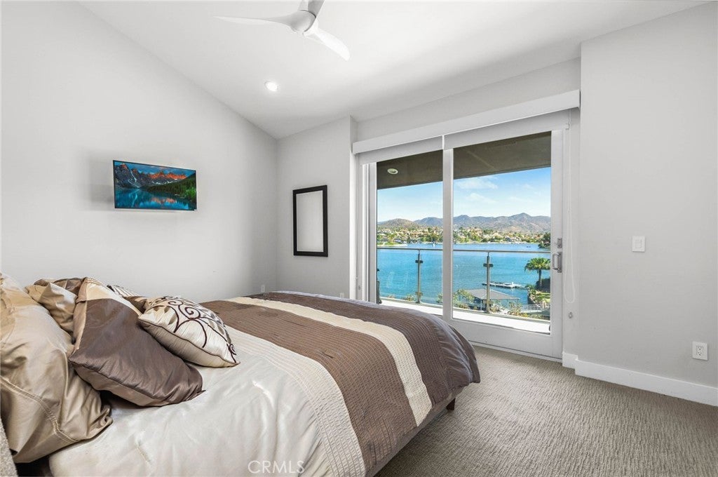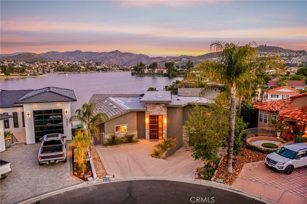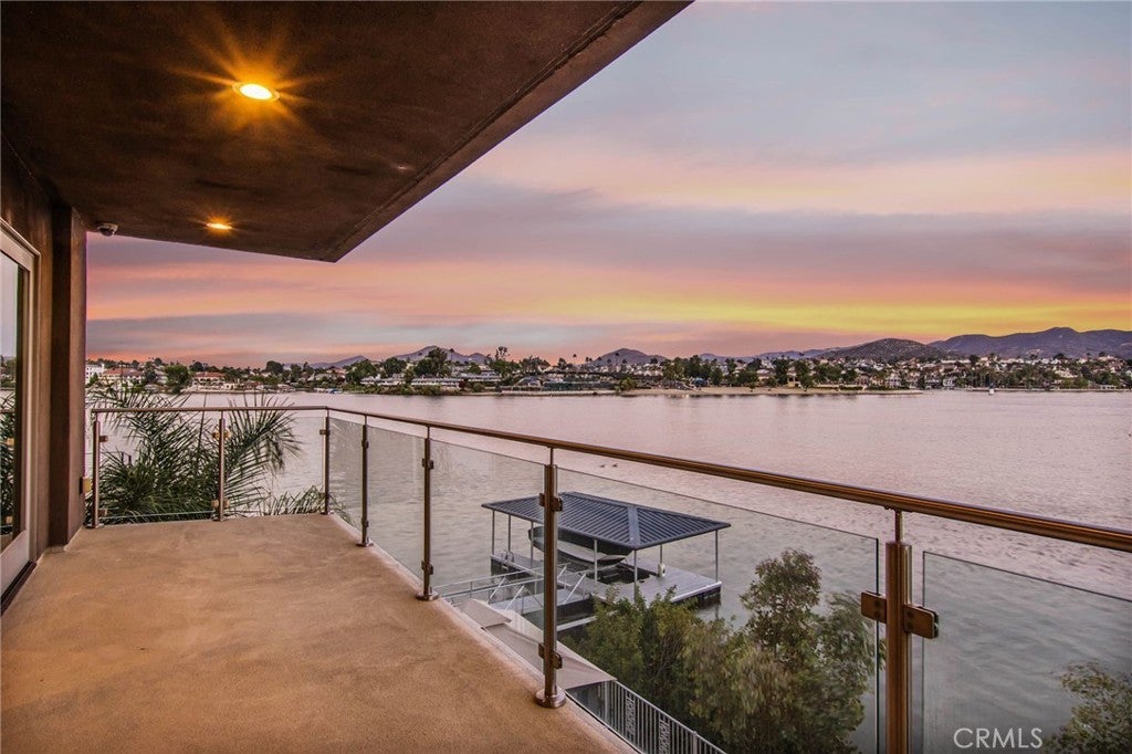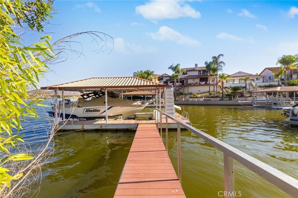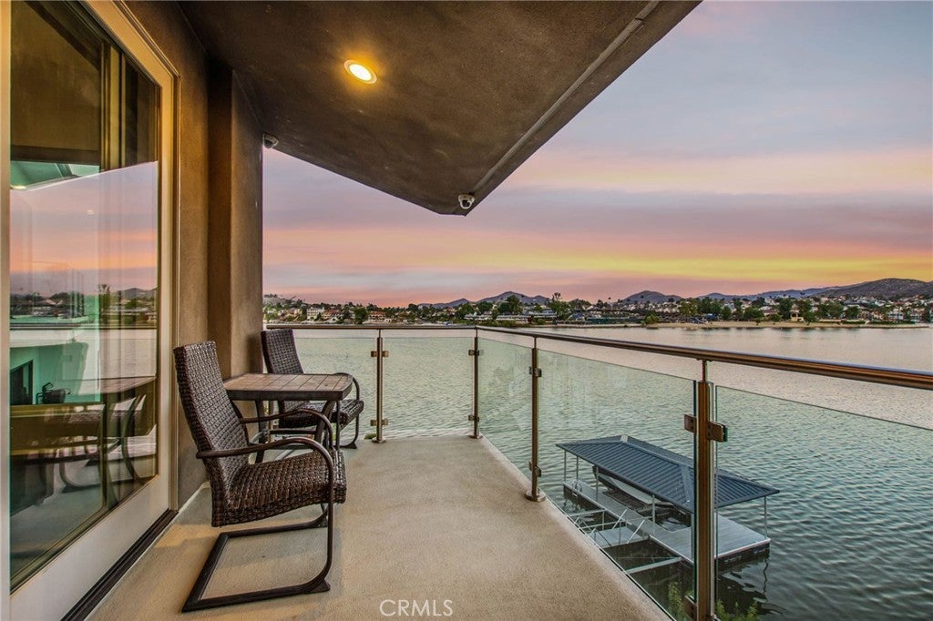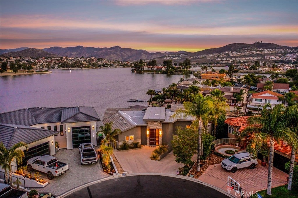 Experience contemporary waterfront living at its finest in this stunning 5,171 sq. ft. home, perfectly positioned on a premium ¼-acre main lake lot offering some of the most panoramic views in the entire community. From the moment you enter through the grand 10-foot solid mahogany door with stainless steel accents, you're welcomed by a dramatic foyer and a breathtaking wall of windows framing unobstructed views of the lake, beach, and surrounding hills. The main level offers an expansive open-concept design ideal for entertaining, with elegant lighting fixtures, chandeliers, blackout shades, and a built-in bar complete with a dumbwaiter to the lower level. Enjoy multiple flexible living areas for dining, relaxing, games, and media, all enhanced by a floor-to-ceiling stacked stone fireplace and a central theatre-quality whole-home audio and intercom system. The chef’s kitchen boasts custom hardwood cabinetry, quartz countertops, stainless steel appliances, and abundant storage. Two bedrooms and two full bathrooms complete the main level, along with a nearly full-width deck—perfect for taking in breathtaking SoCal sunrises and sunsets. The mid level hosts the luxurious primary suite with lake views directly from bed, oversized sliders opening to a private balcony, and a spa-like bath with dual vanities, soaking tub, walk-in shower with custom tile, and a spacious walk-in closet with built-ins. Two additional bedrooms with vaulted ceilings and walk-in closets offer more lake views, along with a full guest bath, a laundry room, and a versatile flex space currently used as an Escape Room. There is also direct access to an oversized 2+ car garage. Outdoor living is where this property truly shines, offering a lakeside putting green, pebble-tech pool and spa, a fully equipped outdoor kitchen with BBQ, sink, and concrete bar island, a private cabana, cozy firepit lounge, and a detached ¾ bath with an additional guest bedroom. Your private boat dock includes a hydrolift and fun waterslide—all tucked into a beautifully landscaped space designed for privacy and year-round enjoyment. This is lakefront luxury living at its best. Canyon Lake living offers a 400 acre waterski/fishing lake, 16 parks most with beaches and playsets, basketball, baseball, pickle ball, equestrian center, 18 hole golf course, pools, dog park, BMX pump track, golf cart friendly streets, slalom course, ski jump, restaurants, miles of hiking/biking/horse trails, community events and so much more!