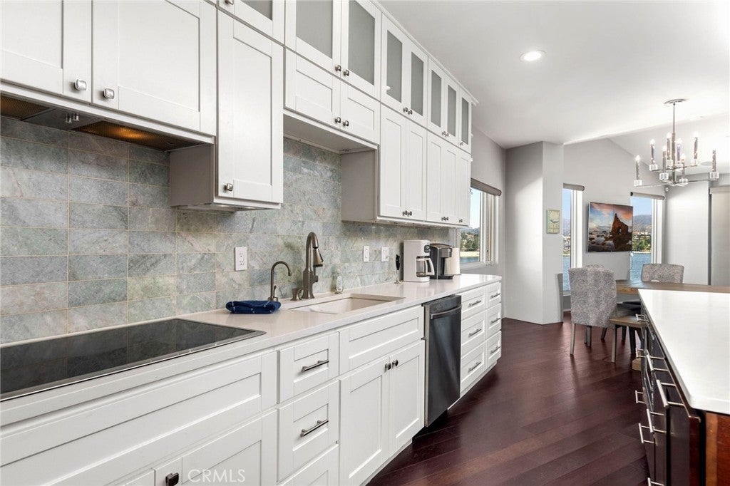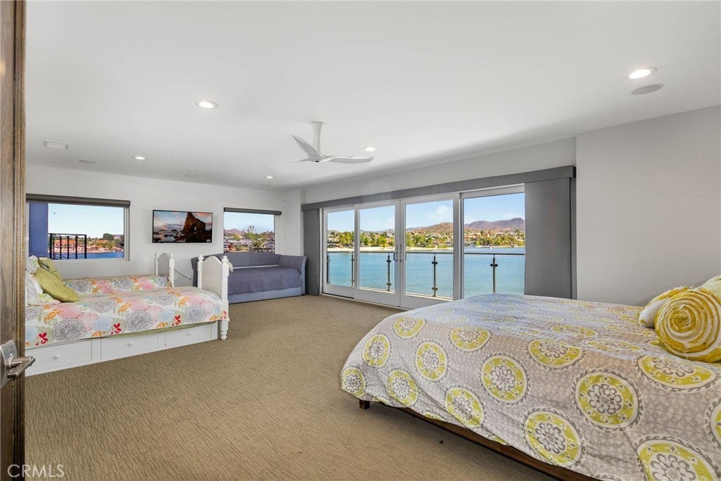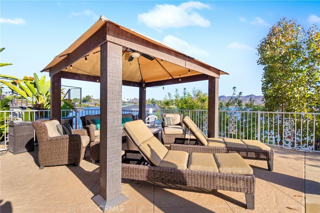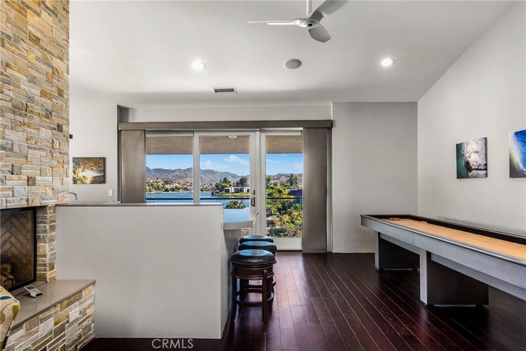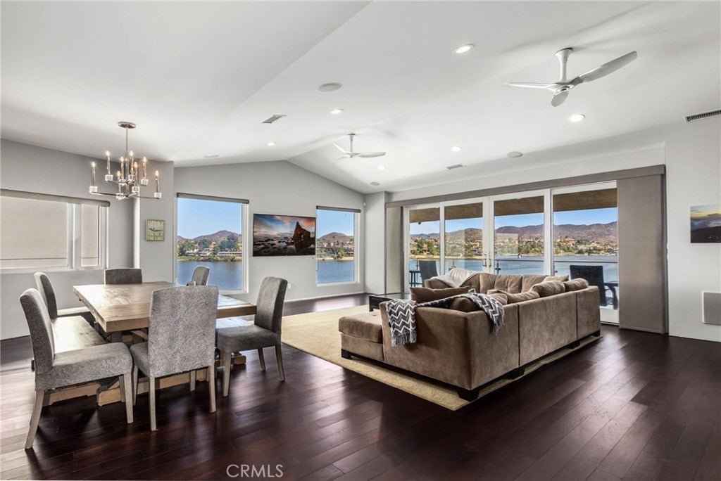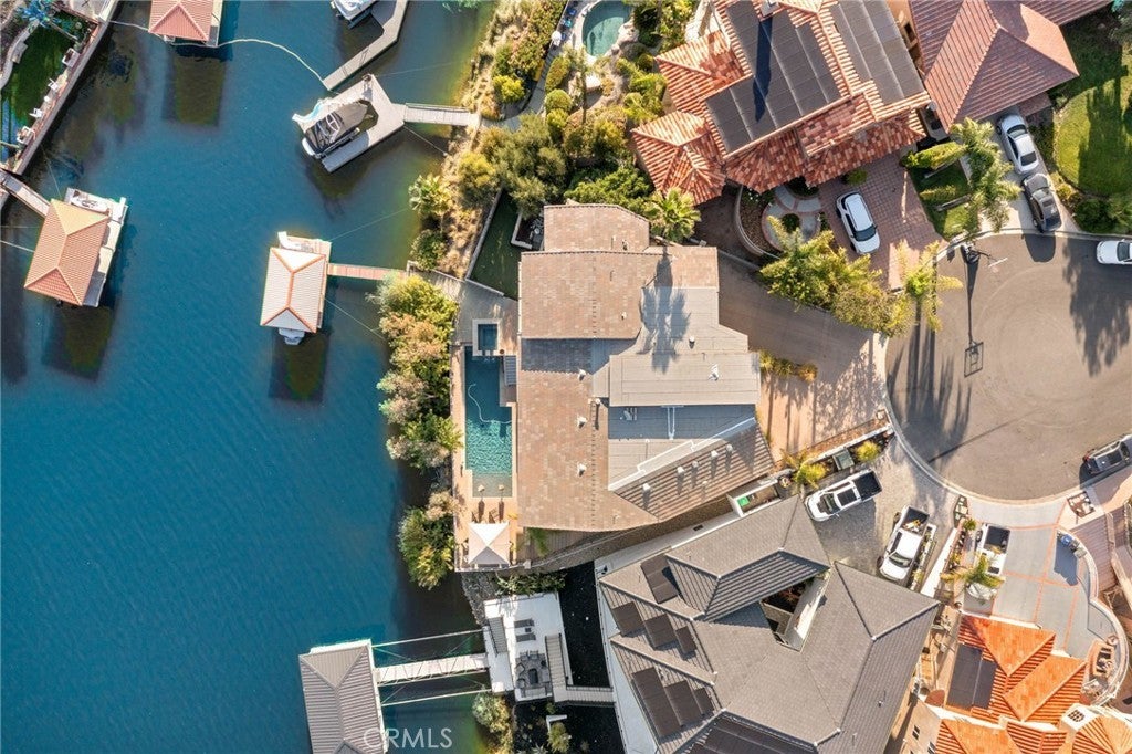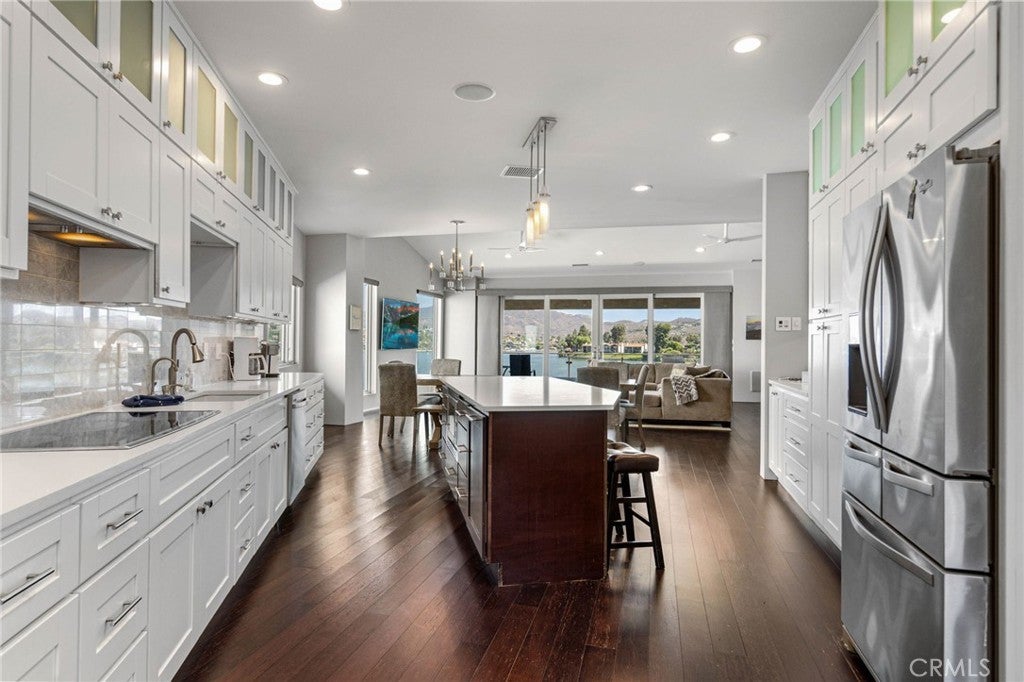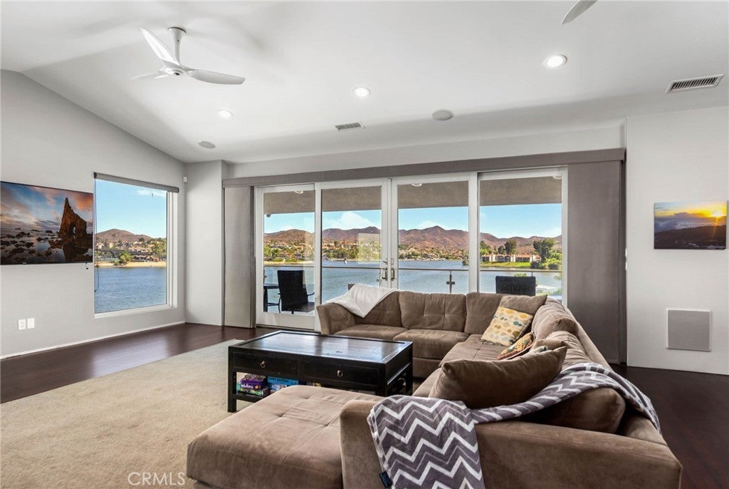 Experience contemporary waterfront living at its finest in this stunning 5,171 sq. ft. home, perfectly positioned on a premium ¼-acre main lake lot offering some of the most panoramic views in the entire community. From the moment you enter through the grand 10-foot solid mahogany door with stainless steel accents, you're welcomed by a dramatic foyer and a breathtaking wall of windows framing unobstructed views of the lake, beach, and surrounding hills. The main level offers an expansive open-concept design ideal for entertaining, with elegant lighting fixtures, chandeliers, blackout shades, and a built-in bar complete with a dumbwaiter to the lower level. Enjoy multiple flexible living areas for dining, relaxing, games, and media, all enhanced by a floor-to-ceiling stacked stone fireplace and a central theatre-quality whole-home audio and intercom system. The chef’s kitchen boasts custom hardwood cabinetry, quartz countertops, stainless steel appliances, and abundant storage. Two bedrooms and two full bathrooms complete the main level, along with a nearly full-width deck—perfect for taking in breathtaking SoCal sunrises and sunsets. The mid level hosts the luxurious primary suite with lake views directly from bed, oversized sliders opening to a private balcony, and a spa-like bath with dual vanities, soaking tub, walk-in shower with custom tile, and a spacious walk-in closet with built-ins. Two additional bedrooms with vaulted ceilings and walk-in closets offer more lake views, along with a full guest bath, a laundry room, and a versatile flex space currently used as an Escape Room. There is also direct access to an oversized 2+ car garage. Outdoor living is where this property truly shines, offering a lakeside putting green, pebble-tech pool and spa, a fully equipped outdoor kitchen with BBQ, sink, and concrete bar island, a private cabana, cozy firepit lounge, and a detached ¾ bath with an additional guest bedroom. Your private boat dock includes a hydrolift and fun waterslide—all tucked into a beautifully landscaped space designed for privacy and year-round enjoyment. This is lakefront luxury living at its best. Canyon Lake living offers a 400 acre waterski/fishing lake, 16 parks most with beaches and playsets, basketball, baseball, pickle ball, equestrian center, 18 hole golf course, pools, dog park, BMX pump track, golf cart friendly streets, slalom course, ski jump, restaurants, miles of hiking/biking/horse trails, community events and so much more!