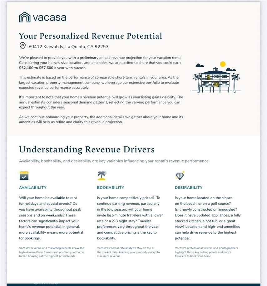 STVR APPROVED BY HOA!!!!!! Permit required through City of La Quinta! Experience the best of guard-gated resort living at this 2023 fully furnished home at La Quinta's exclusive Signature PGA West. The open-concept home features three bedrooms, 2.5 baths, a versatile bonus room/loft/flex space and a suite of premium upgrades throughout approx. 1,960 s.f. Solar power enhances the turnkey home, and wood-look luxury vinyl plank flooring, custom window treatments, three HDTVs, upgraded bedroom carpet, and a custom dry bar with built-in beverage refrigerator in the bonus room are enviable upgrades. The living and dining room flow effortlessly into a kitchen with dual-waterfall island, access to the side patio and gas BBQ, upgraded pendant lighting, white cabinetry, a pantry, full tile backsplash, and top-level stainless steel KitchenAid appliances. An oversized laundry room with sink, cabinets and washer and dryer is located just off the kitchen. An attached two-car garage faces the rear of the two-level design. Convenience and style are elevated in a main-level primary suite with walk-in closet, walk-in rain shower with built-in seat, two sinks, and upgraded tile finishes. The upper-level bath also showcases custom penny tile and upgraded surrounds. Grounds are fully landscaped and feature a gated front patio with stylish furnishings, an open-air fireplace, and paver-finished decking. Community includes pool, gym, bbq, and clubhouse with your HOA. With opportunity as a resident to join the tennis/golf club to include pickleball. BTVAI.