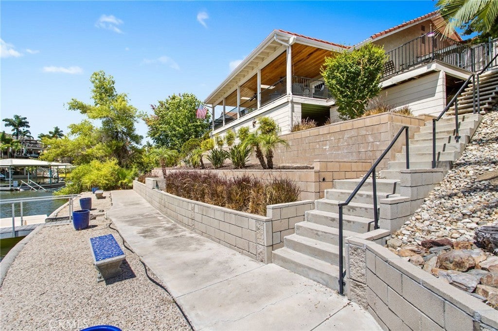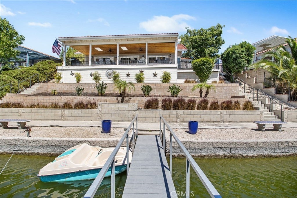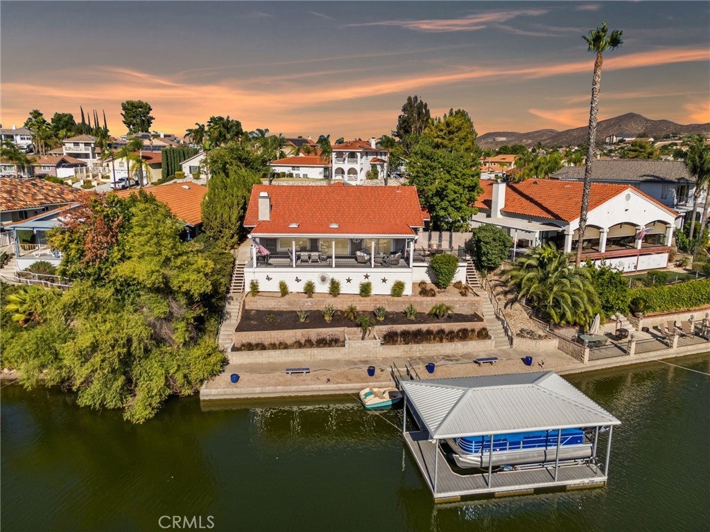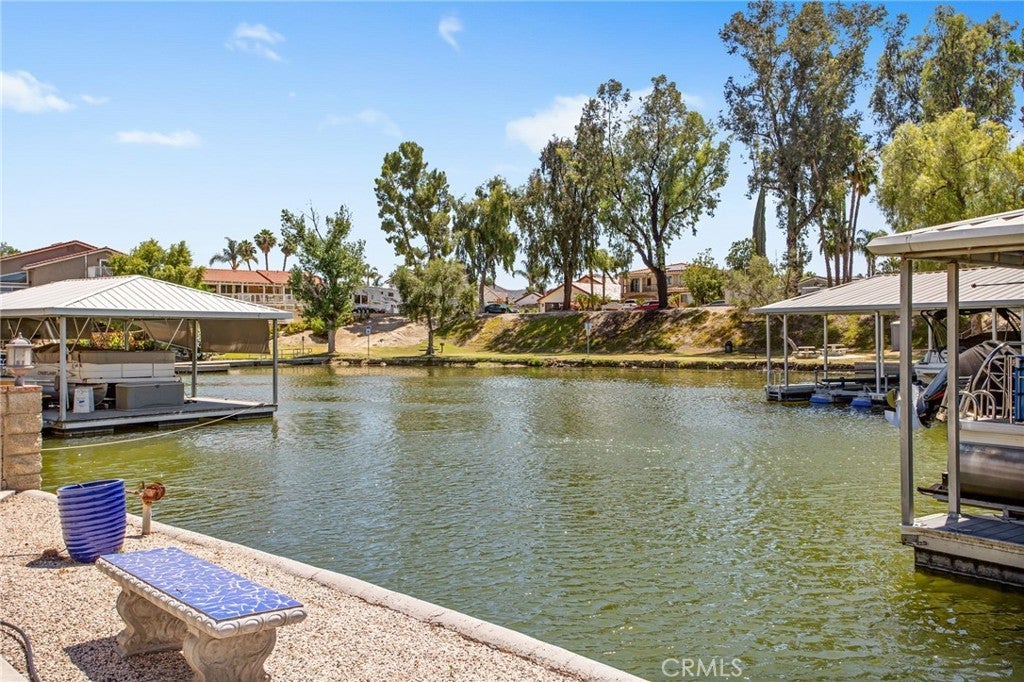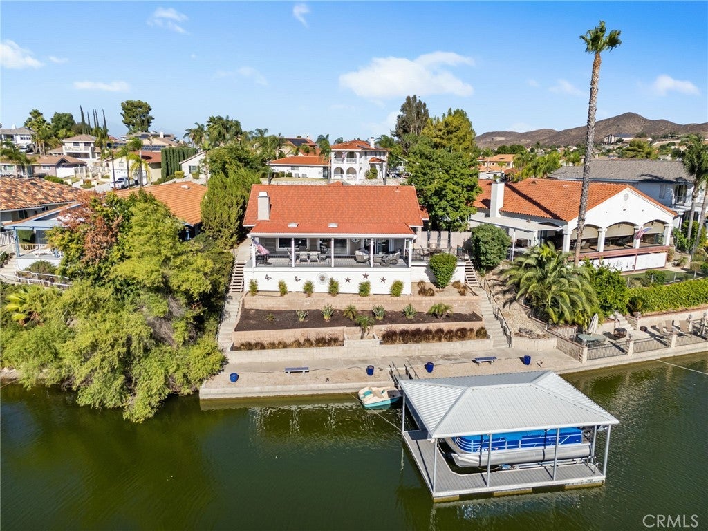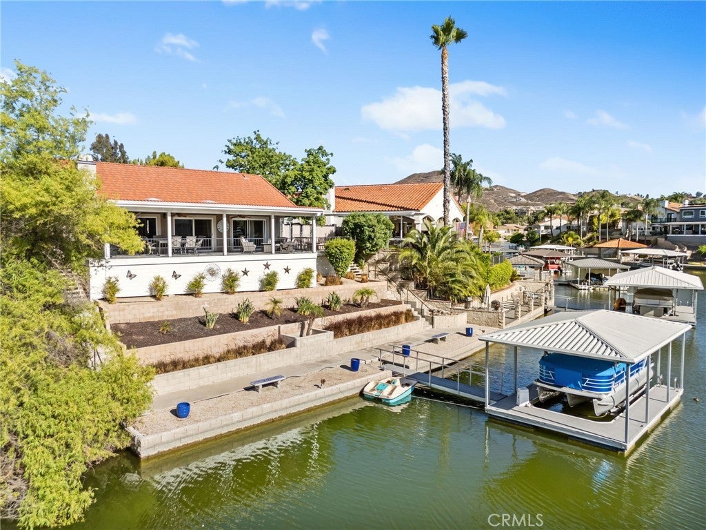 WOW, PRICE REDUCTION! Welcome to this meticulously maintained, FULLY REMODELED WATERFRONT home offering 3 bedrooms, 2 bathrooms, and 2,339 sq ft of beautifully upgraded living space. From the moment you step inside, you’ll appreciate the open layout, vaulted ceilings, wood-look porcelain tile throughout the main living areas, custom designer paint, crown molding, dual-pane windows and sliders, and ceiling fans throughout. This home was almost completely redone in 2021 by Tutt renovations. The family room boasts vaulted ceilings, a custom built in cabinet with media storage, a wood burning fireplace with a stylish quartz and shiplap back wall and mantle. Both roomy secondary bedrooms and have ample closet space. The front room is light and bright featuring a pop out window, perfect for reading, and a small desk nook. The shared bathroom is delightful, with dual sinks and a modern step in shower. The spacious primary suite has a water view and is conveniently located away from the other bedrooms, 3 closets, a slider leading to the patio and the spa-like bathroom features a wet room shower, soaking tub and dual sinks. The home also includes a laundry room with a sink, granite countertops and abundant storage. The kitchen was fully remodeled down to the studs in 2014 and features soft-close cabinetry, a large island with power, quartz countertops, and a brand new built-in microwave. Outside, enjoy an expansive covered patio with a firepit and four retractable sunshades, multiple seating areas, cemented side yard and dog run, tiered planters, and a private dock with hydro hoist that can accommodate a Pontoon or Tritoon boat, steel canopy, TREX decking and day/night solar lights. Additional upgrades include paver driveway and walkways (2024), NEW turf lawn, 26 solar panels (2024 PPA) with 19.5kWh backup battery, NEW electric panel, 220 installed for EV charging, fiber optic internet and extra storage and cabinet space in the garage. Situated on a tranquil part of the lake with peaceful views across to Lion’s Park and mature landscaping, this move-in-ready home is a rare gem! Canyon Lake is a 24 hour guard gated community with a private 525 acre lake, premiere wakeboarding and waterskiing, 18 hole SCGA rated golf course, Lakefront pool and clubhouse, Lakefront RV park, Equestrian center, tennis, basketball & pickleball courts, baseball fields, 4 beaches, 9 parks, an amphitheater, docks, a bicycle pump track, Senior Center, over 40 clubs to join and so much more!