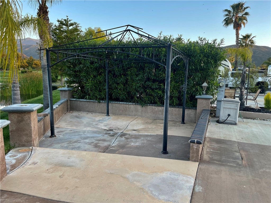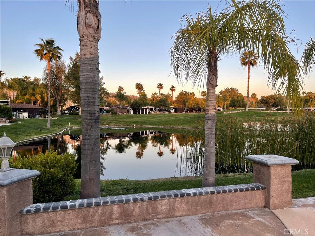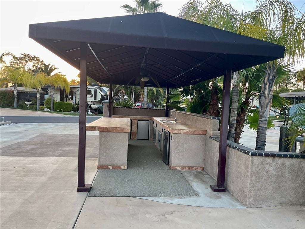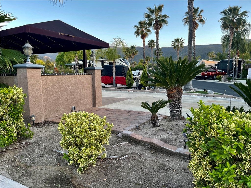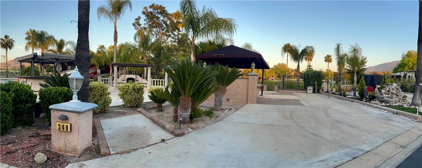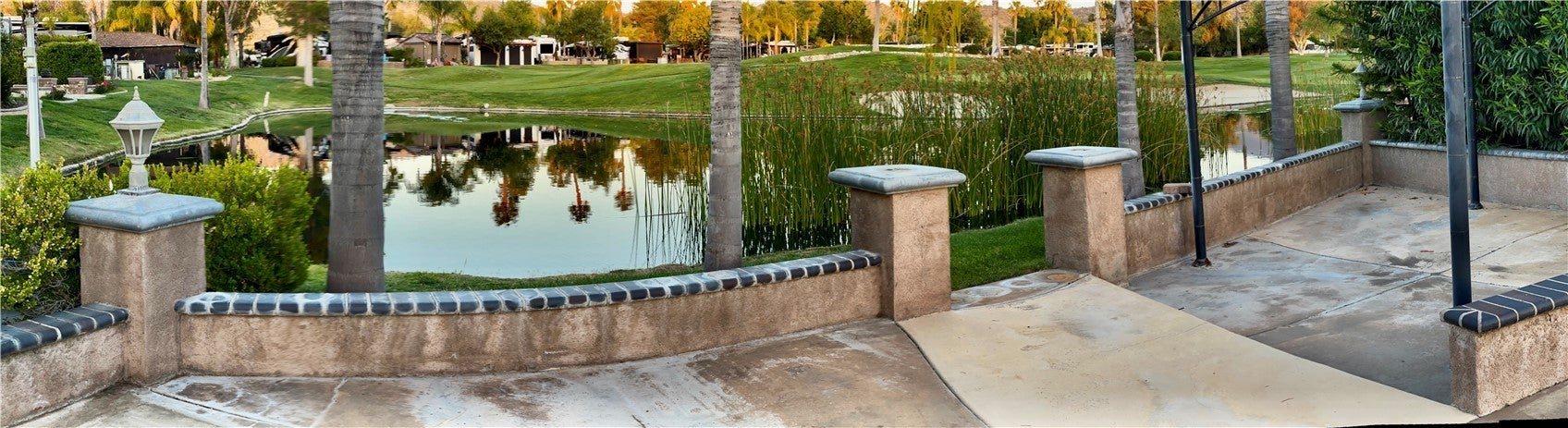 Site 349 is a great location, just two sites away from the largest club house. The largest pool in the resort along with a jacuzzi is to the back side of the club house. This club house has a ping pong table and pool table inside along with other amenities. There are tennis courts and pickle ball courts near by. The best feature of this location is the amazing view of a golf course lake and the beautiful golf green just on the other side of the lake.While sitting on the patio at this site you can look down the long Fairway out to the beautiful green Palomar mountains. The front of the property has a well landscaped side yard. Parking for a golf cart is nestled in this area amongst the lush green tropical plants. Just beyond is a large kitchen. Here you will find considerable counter space and a kitchen island with seating on one side and considerable storage cabinets underneath. There are two refrigerators, a separate freezer and additional storage cabinets under the counter. The double sided stainless steel sink with hot and cold water has a garbage disposal. In addition to a smaller brick patio on the front side of the property, there is a large patio area just outside the kitchen. A low seating wall runs across the entire back side of this patio area.There is a step down section in this area covered by a gazebo.