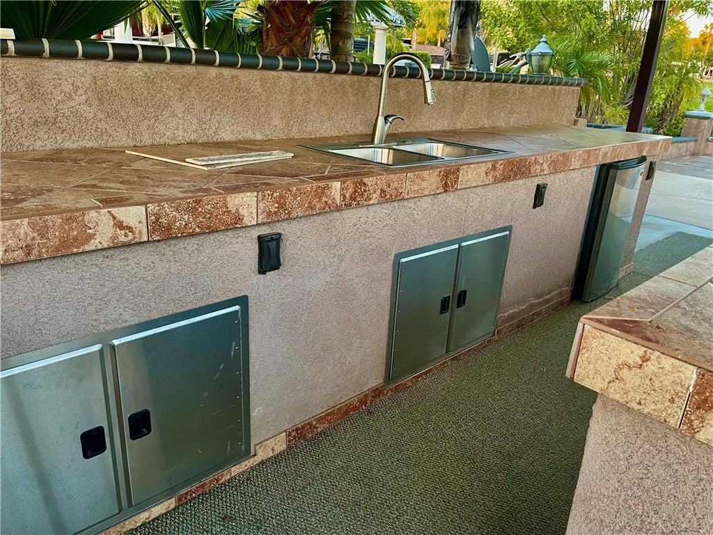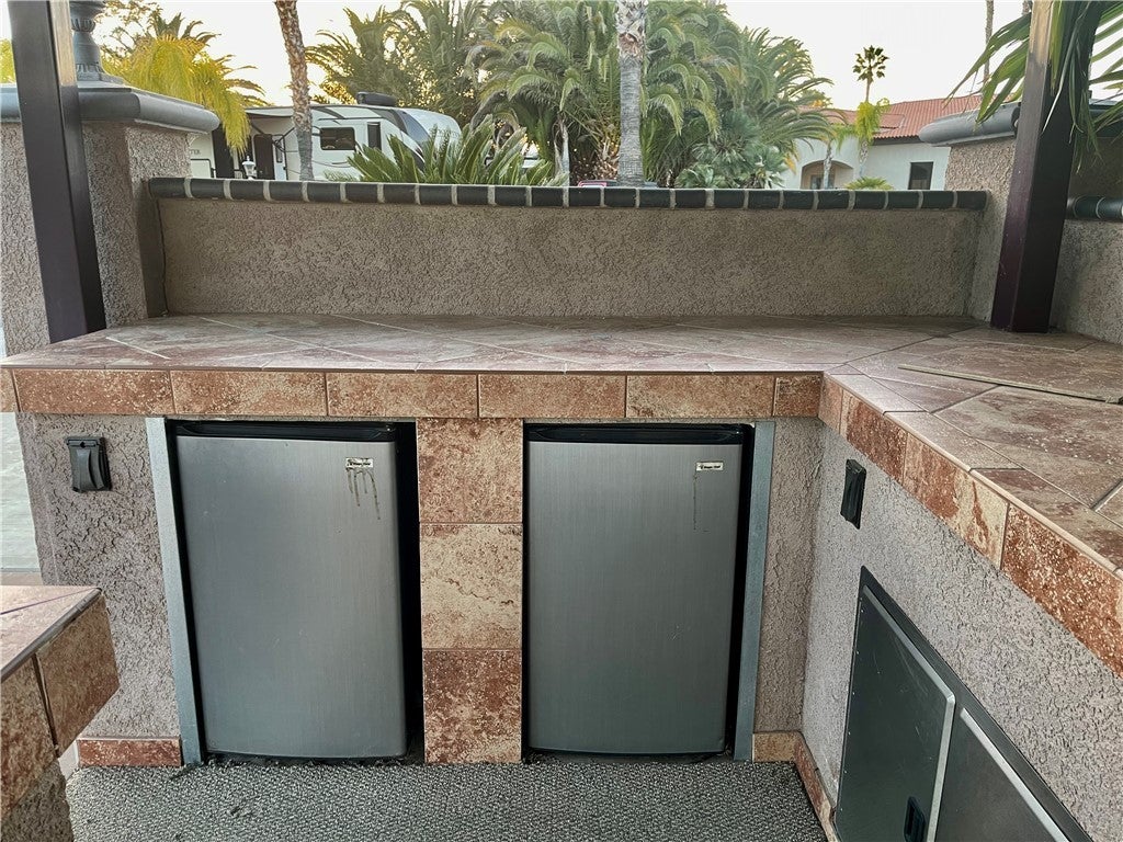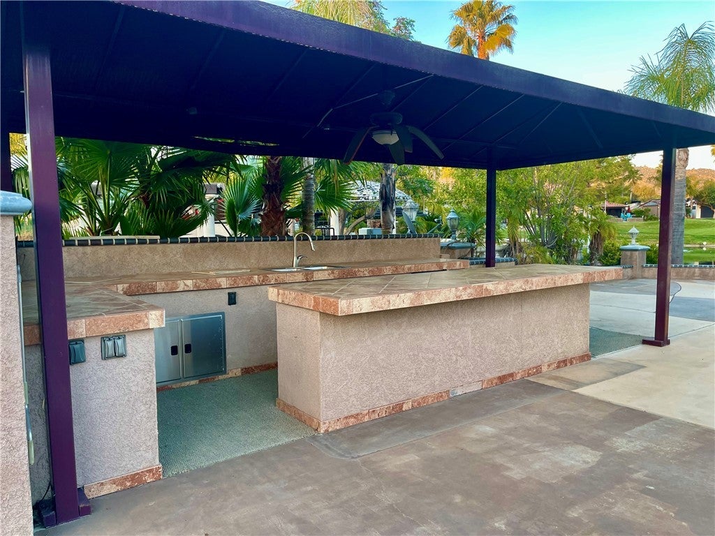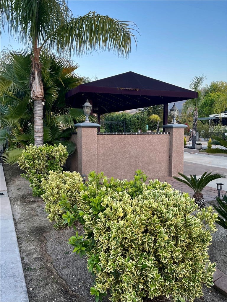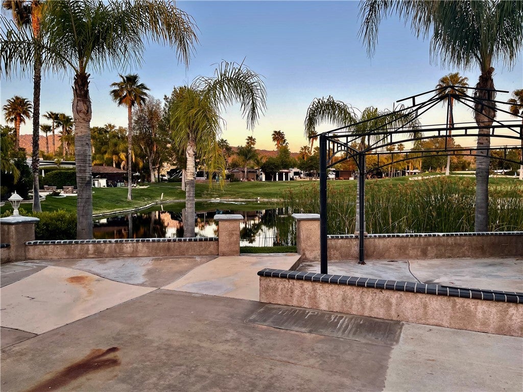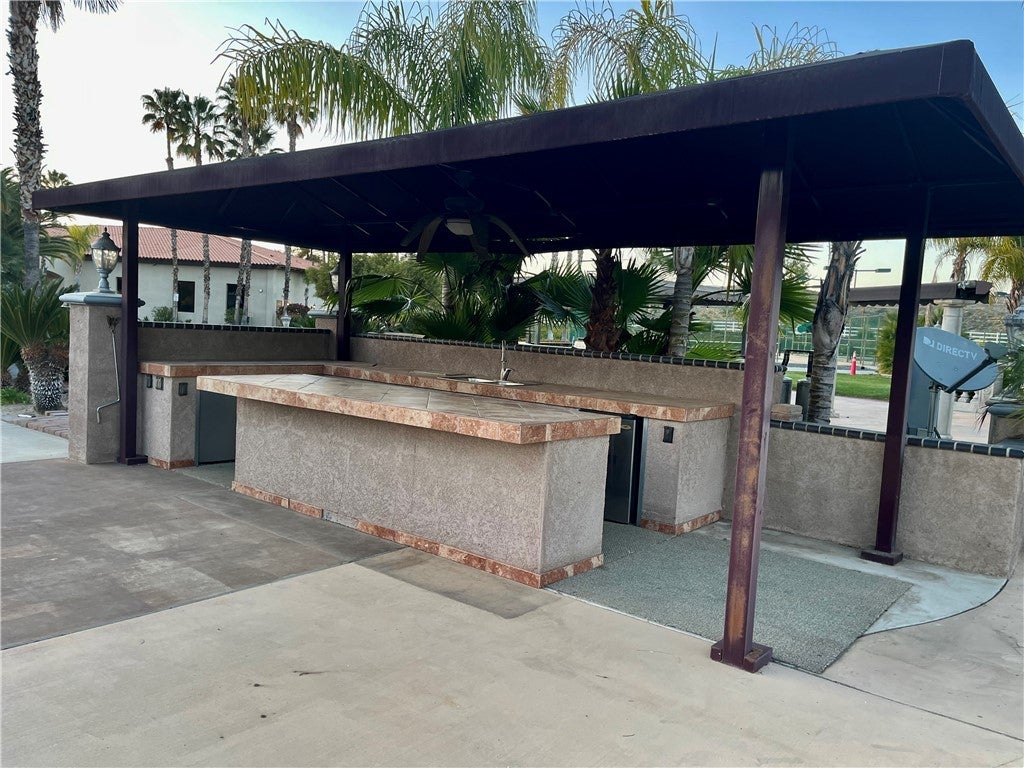 Site 349 is a great location, just two sites away from the largest club house. The largest pool in the resort along with a jacuzzi is to the back side of the club house. This club house has a ping pong table and pool table inside along with other amenities. There are tennis courts and pickle ball courts near by. The best feature of this location is the amazing view of a golf course lake and the beautiful golf green just on the other side of the lake.While sitting on the patio at this site you can look down the long Fairway out to the beautiful green Palomar mountains. The front of the property has a well landscaped side yard. Parking for a golf cart is nestled in this area amongst the lush green tropical plants. Just beyond is a large kitchen. Here you will find considerable counter space and a kitchen island with seating on one side and considerable storage cabinets underneath. There are two refrigerators, a separate freezer and additional storage cabinets under the counter. The double sided stainless steel sink with hot and cold water has a garbage disposal. In addition to a smaller brick patio on the front side of the property, there is a large patio area just outside the kitchen. A low seating wall runs across the entire back side of this patio area.There is a step down section in this area covered by a gazebo.