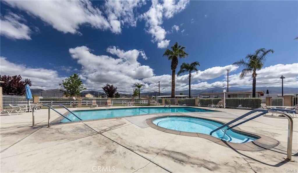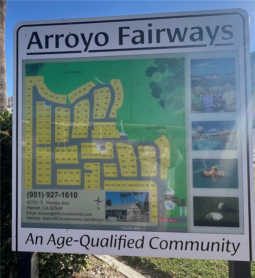 PRICE REDUCED! Welcome to Arroyo Fairways, a 55+ golf course community offering a peaceful, amenity-rich retirement lifestyle. This well-maintained home features a covered front entrance with stunning views of the Idyllwild Mountains, vaulted ceilings, tinted privacy windows on the neighbor's side, dual-pane windows with custom blinds throughout, central heating, newer interior paint and flooring, and a recently replaced hot water heater. The kitchen flows seamlessly into the dining area, while the spacious living room is filled with natural light from large picture windows that frame beautiful evening sunsets. The primary bedroom includes a wardrobe closet and ceiling fan, and the adjoining bathroom offers a step-in shower with built-in seating. The additional bedroom is generously sized, and the entire home features laminate wood flooring. Included with the home are a refrigerator, washer and dryer, two large flat-screen TVs, and a security camera system. Outside, you'll find a two-car covered carport, a large lot with fruit-bearing orange and avocado trees, and plenty of outdoor space to enjoy. Residents of Arroyo Fairways enjoy access to a clubhouse with a newly remodeled kitchen and TV room, billiards, covered shuffleboard courts, a swimming pool, a jacuzzi, and unlimited free golf—all set in a tranquil and scenic community perfect for embracing the retirement lifestyle.