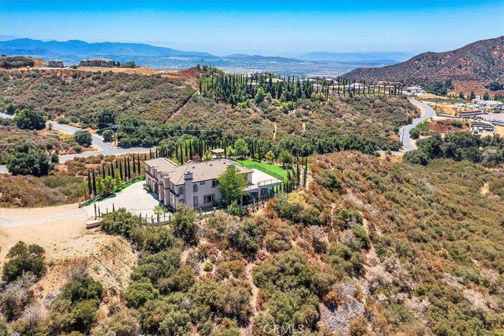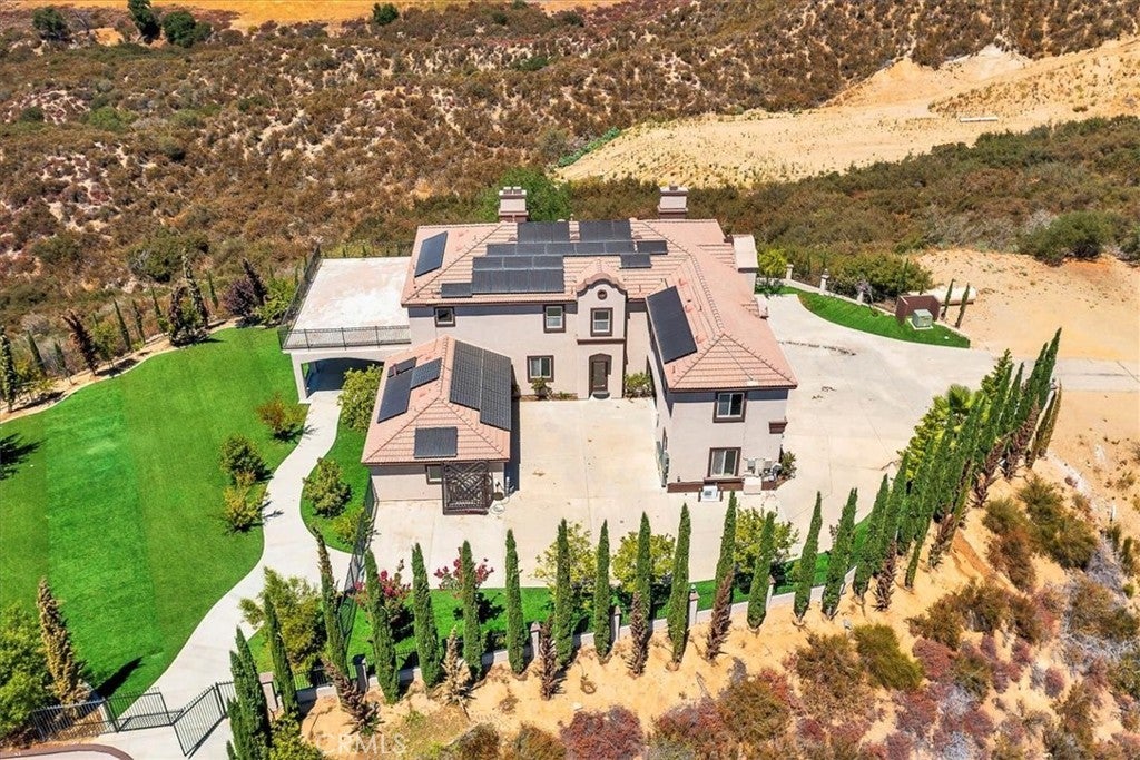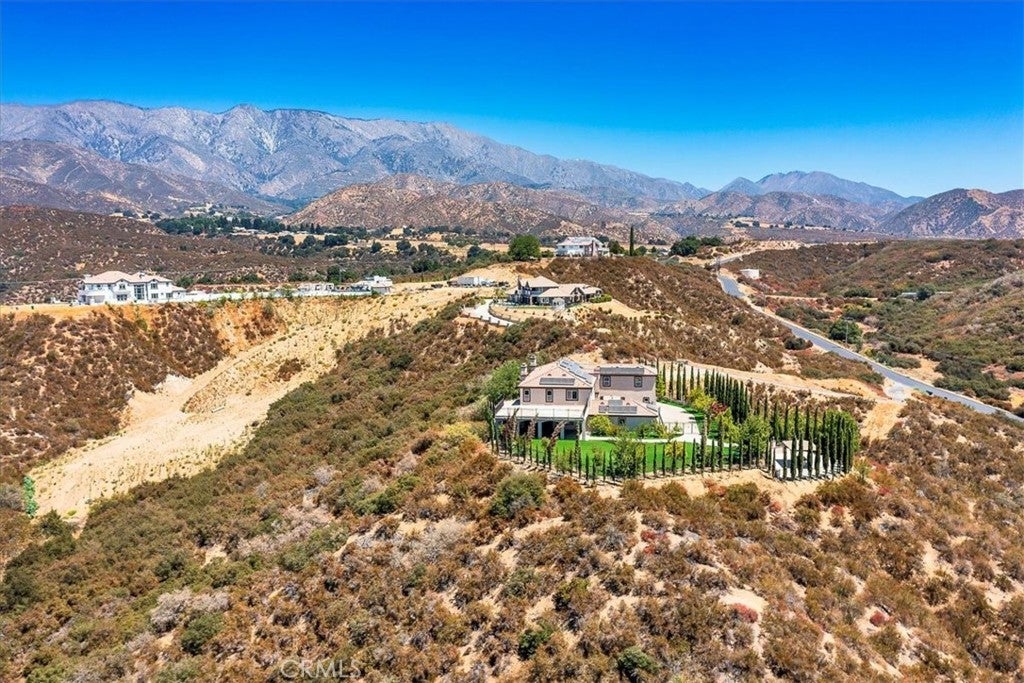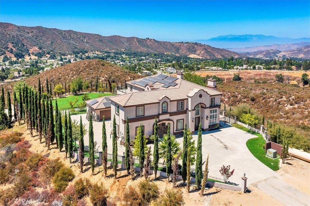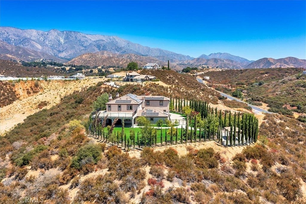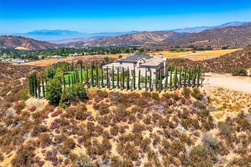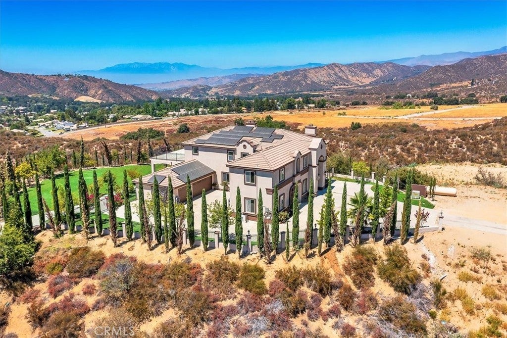 Welcome to 39292 Butterfly Drive, a custom estate perched on nearly 5 acres in the prestigious gated community of Wildwood Highlands. Nestled near Wildwood State Park and just minutes from Oak Glen’s wineries and apple orchards, this home combines timeless elegance with breathtaking surroundings. A grand porte cochere and double-door entry set the stage for the dramatic foyer, complete with soaring ceilings and a dazzling crystal chandelier. Real wood floors flow throughout the main level, where you’ll find an office, 1/2 bath, convenient laundry room with sink, and a detached guest room with its own private full bath, ideal for extended family, guests, or future ADU conversion. Upstairs, discover 4 bedrooms and 3 bathrooms, including the luxurious primary suite, a retreat featuring a private sitting area with fireplace, spa-like bath with soaking tub and glass shower, and an expansive deck showcasing panoramic valley views framed by snowcapped mountains. The gourmet kitchen is a chef’s dream with a large island, granite counters, GE Monogram appliances, six-burner gas range with hood, double ovens, trash compactor, and a spacious walk-in pantry. Three fireplaces add warmth throughout, while the finished 3-car garage impresses with epoxy flooring and insulated doors. Outdoors, enjoy the fully fenced yard lined with Italian Cypress, mature fruit trees, low-maintenance artificial turf, and a large covered patio with ceiling fans. A private covered observation area is perfect for gatherings or a future outdoor kitchen. Energy efficiency abounds with 61 paid-off solar panels, 3 Tesla chargers, and 2 backup batteries—no leases, loans, or PPAs. With stunning views from nearly every window, this home offers sophistication, comfort, and sustainability in an unmatched setting.