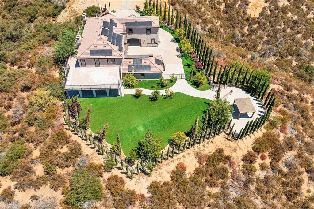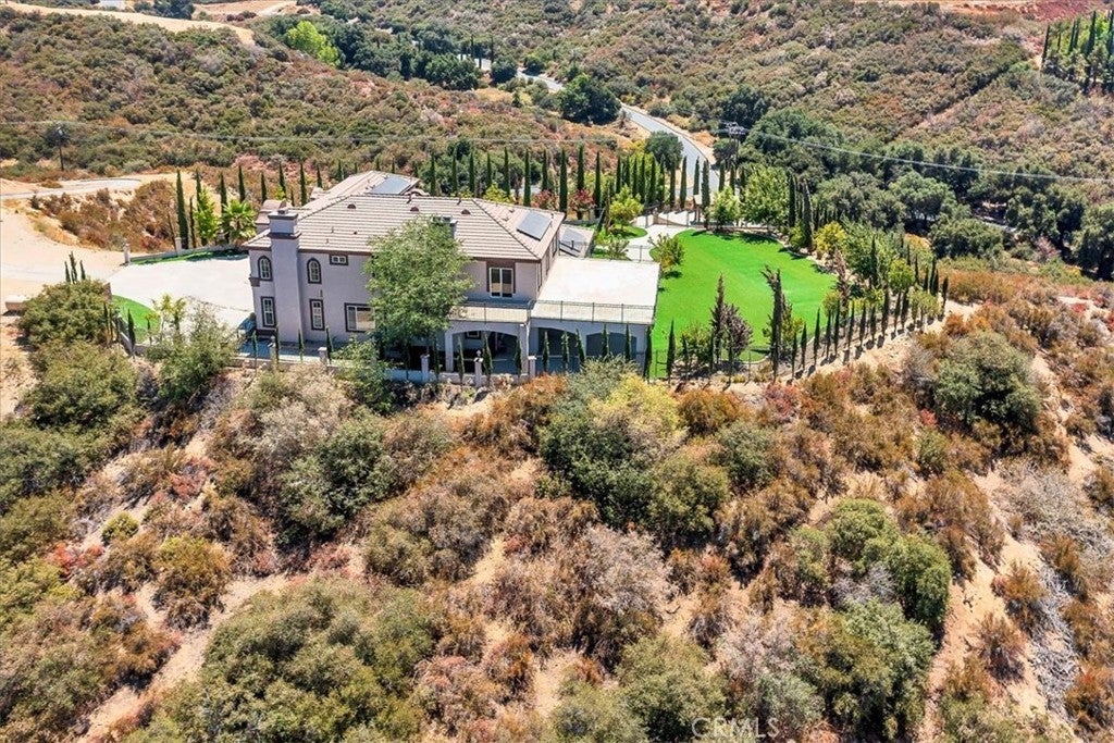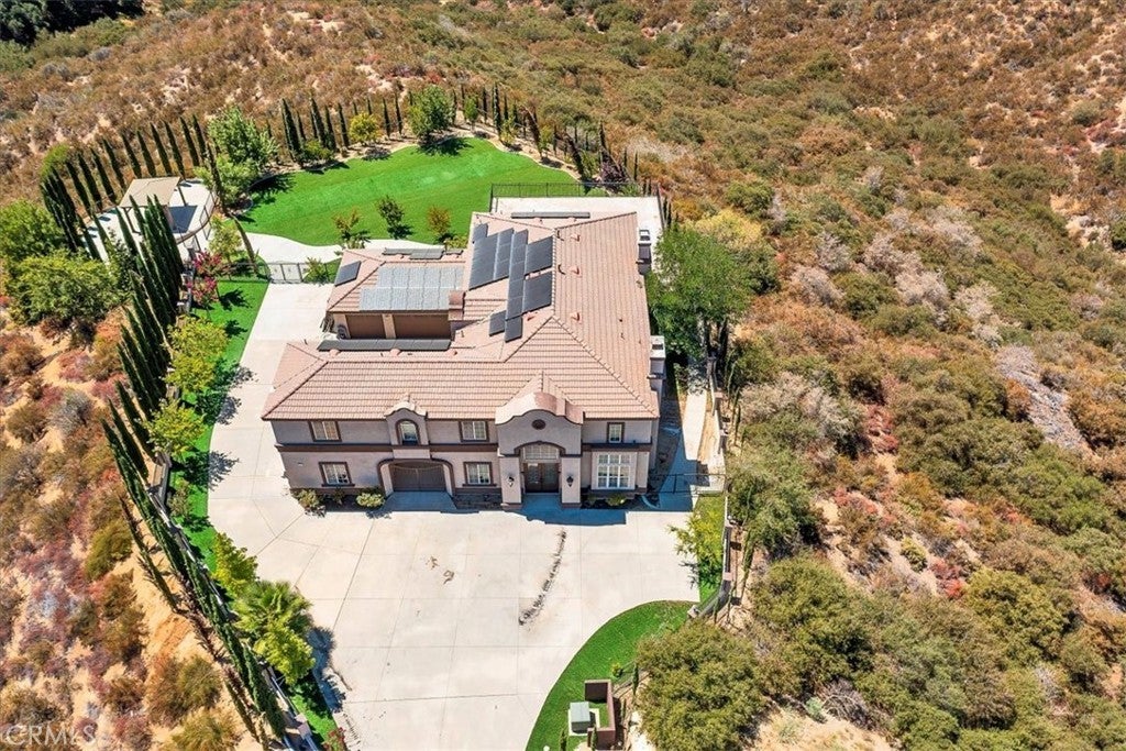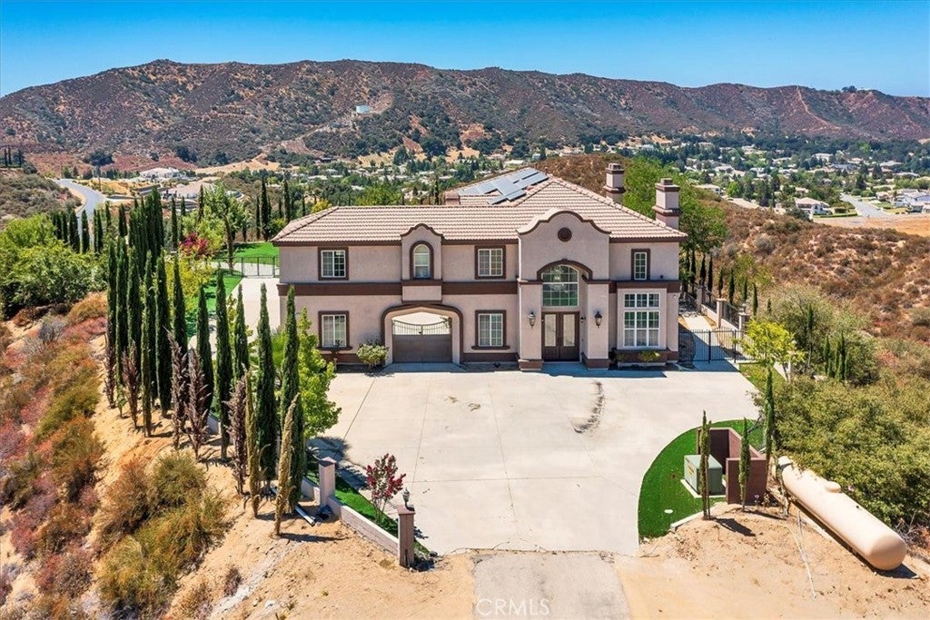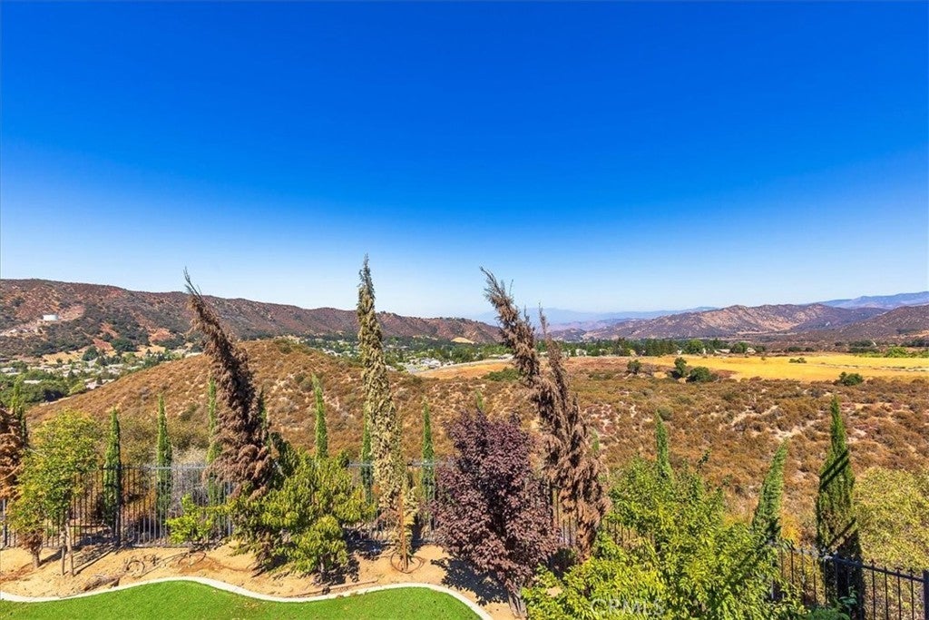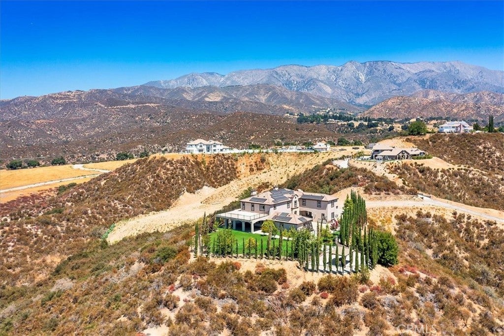 Welcome to 39292 Butterfly Drive, a custom estate perched on nearly 5 acres in the prestigious gated community of Wildwood Highlands. Nestled near Wildwood State Park and just minutes from Oak Glen’s wineries and apple orchards, this home combines timeless elegance with breathtaking surroundings. A grand porte cochere and double-door entry set the stage for the dramatic foyer, complete with soaring ceilings and a dazzling crystal chandelier. Real wood floors flow throughout the main level, where you’ll find an office, 1/2 bath, convenient laundry room with sink, and a detached guest room with its own private full bath, ideal for extended family, guests, or future ADU conversion. Upstairs, discover 4 bedrooms and 3 bathrooms, including the luxurious primary suite, a retreat featuring a private sitting area with fireplace, spa-like bath with soaking tub and glass shower, and an expansive deck showcasing panoramic valley views framed by snowcapped mountains. The gourmet kitchen is a chef’s dream with a large island, granite counters, GE Monogram appliances, six-burner gas range with hood, double ovens, trash compactor, and a spacious walk-in pantry. Three fireplaces add warmth throughout, while the finished 3-car garage impresses with epoxy flooring and insulated doors. Outdoors, enjoy the fully fenced yard lined with Italian Cypress, mature fruit trees, low-maintenance artificial turf, and a large covered patio with ceiling fans. A private covered observation area is perfect for gatherings or a future outdoor kitchen. Energy efficiency abounds with 61 paid-off solar panels, 3 Tesla chargers, and 2 backup batteries—no leases, loans, or PPAs. With stunning views from nearly every window, this home offers sophistication, comfort, and sustainability in an unmatched setting.