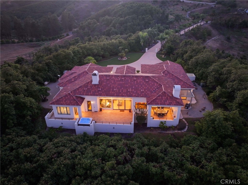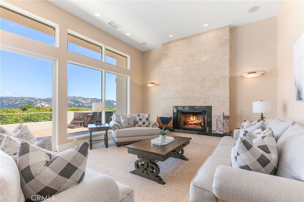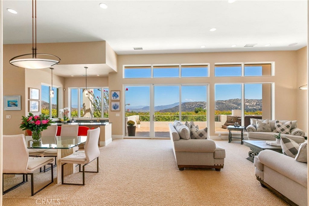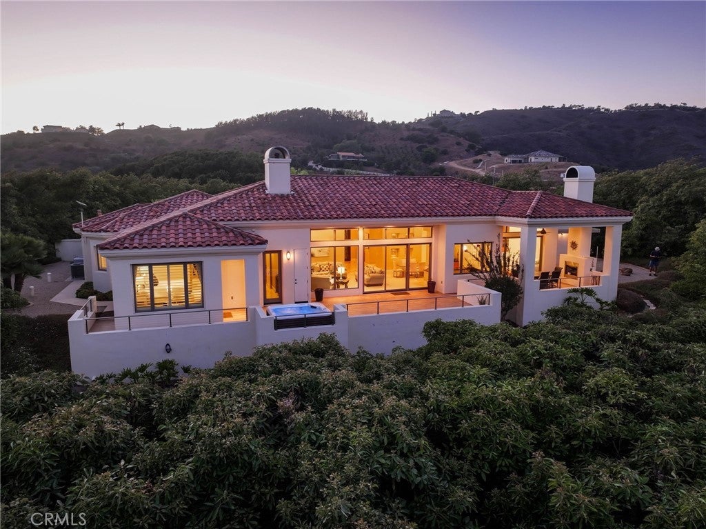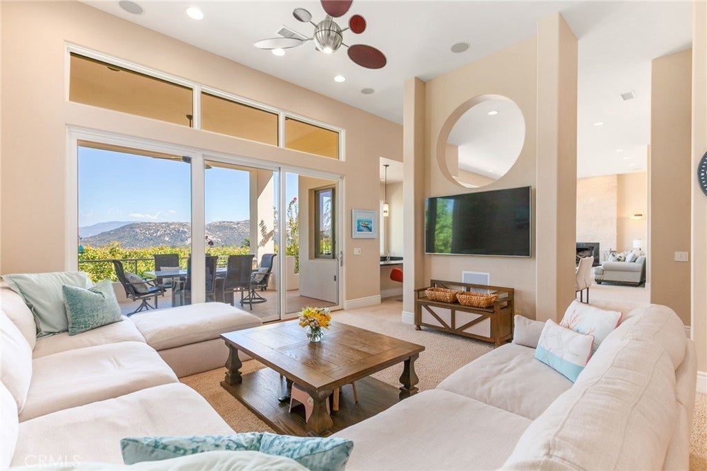 Situated on nearly 14 pristine acres, this custom-built De Luz estate offers unmatched privacy, elegance, and panoramic views of rolling hills and twinkling city lights. Beyond the private electronic gate, every detail reflects thoughtful design and superior craftsmanship. Constructed with insulated concrete form (ICF) technology, the home boasts 12-inch exterior walls for durability and efficiency, sound-insulated interiors, Marvin windows and doors, a whole-house Life Source water system, two Noritz tankless water heaters, zoned heating and cooling, Lutron lighting, and a genuine two-piece clay tile roof. The interior features soaring 12-foot ceilings in the main living areas, a sunken bar with sink, refrigerator, and wine cooler, plus custom cabinetry throughout. The chef’s kitchen is equipped with a new built-in stainless steel KitchenAid refrigerator, dual Miele dishwashers, and a warming drawer. Electric retractable screens in the living and family rooms add comfort and convenience. The primary suite offers breathtaking views, a sitting area, private deck access, dual vanities, a jetted shower, and an oversized soaking tub. Two additional bedrooms feature en-suite baths. The garage is fully upgraded with custom cabinetry, granite countertops, a butcher block workbench, and a Martin insulated garage door with low-noise openers. Outdoor living is exceptional with a full-length deck, wood-burning fireplace dining area, remote-controlled pergola, hot tub, and multiple lounge spaces ideal for entertaining. Just three miles from Old Town Temecula, this estate blends tranquility with convenience.