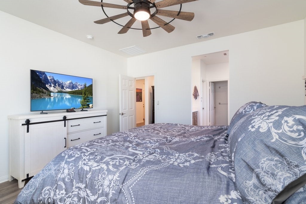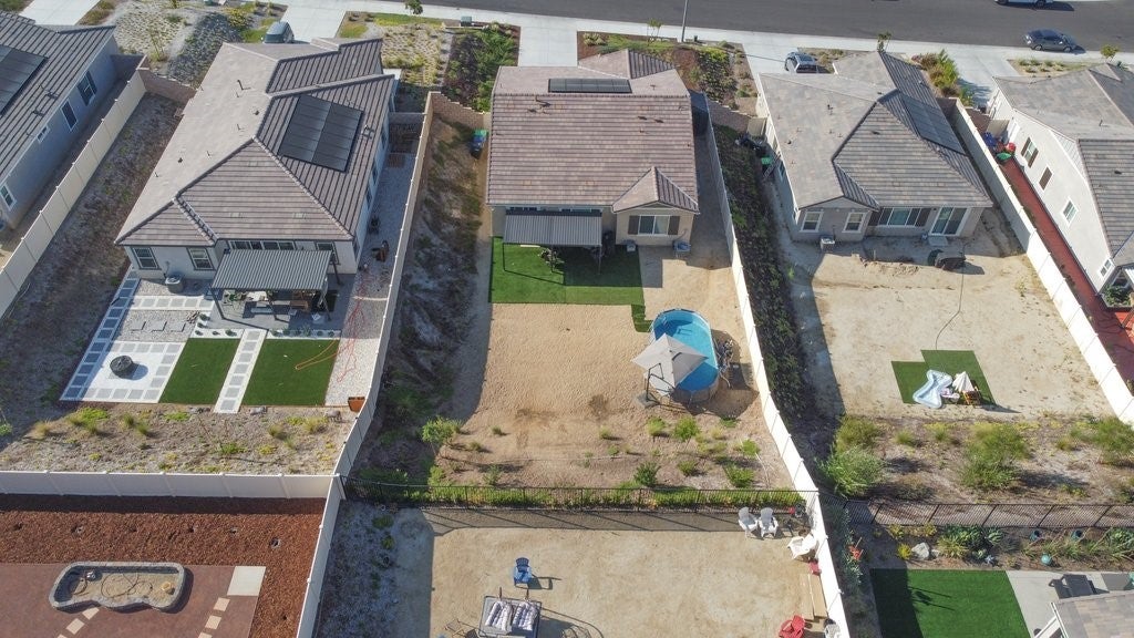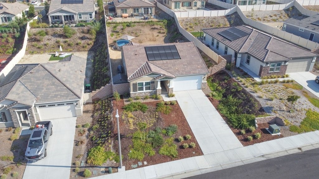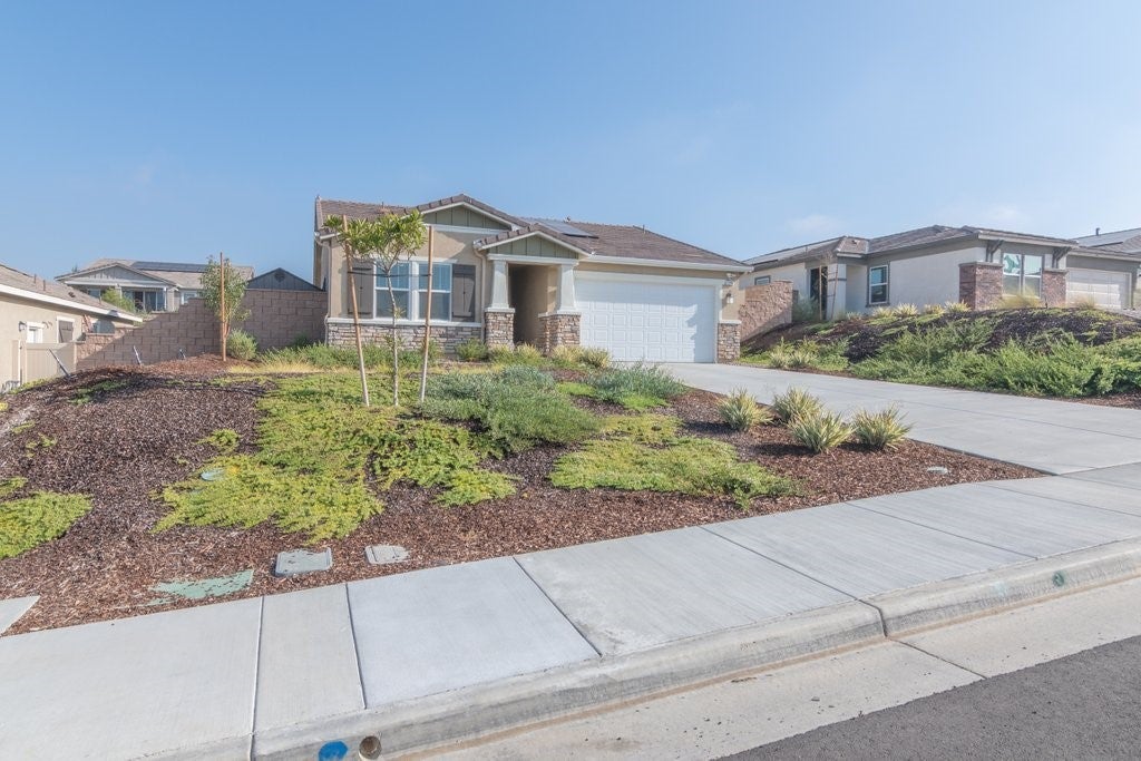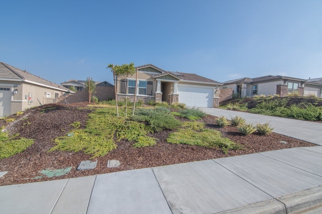Gorgeous newer KB build single story 3 bedroom 2 bath home on a large 10,497 sf lot. Tall ceilings with ceiling fans in all bedrooms. Luxury vinyl plank flooring throughout the home. Kitchen boasts quarts counters, stainless appliances, soft close cabinets, upgraded quiet dishwasher,window over single basin sink, spacious walk in pantry. Yard has plenty of space for a pool and potential RV parking on side. Rain gutters, fire sprinklers, tankless water heater, Christmas light outlet package. 10 paid off solar panels. Minutes from freeway access.