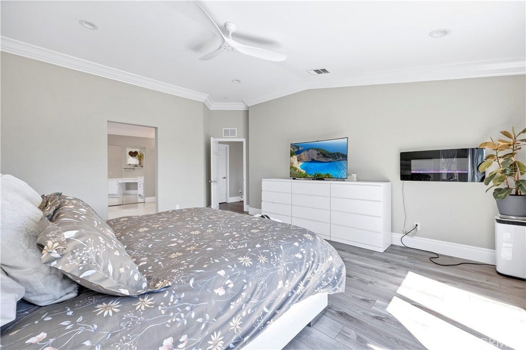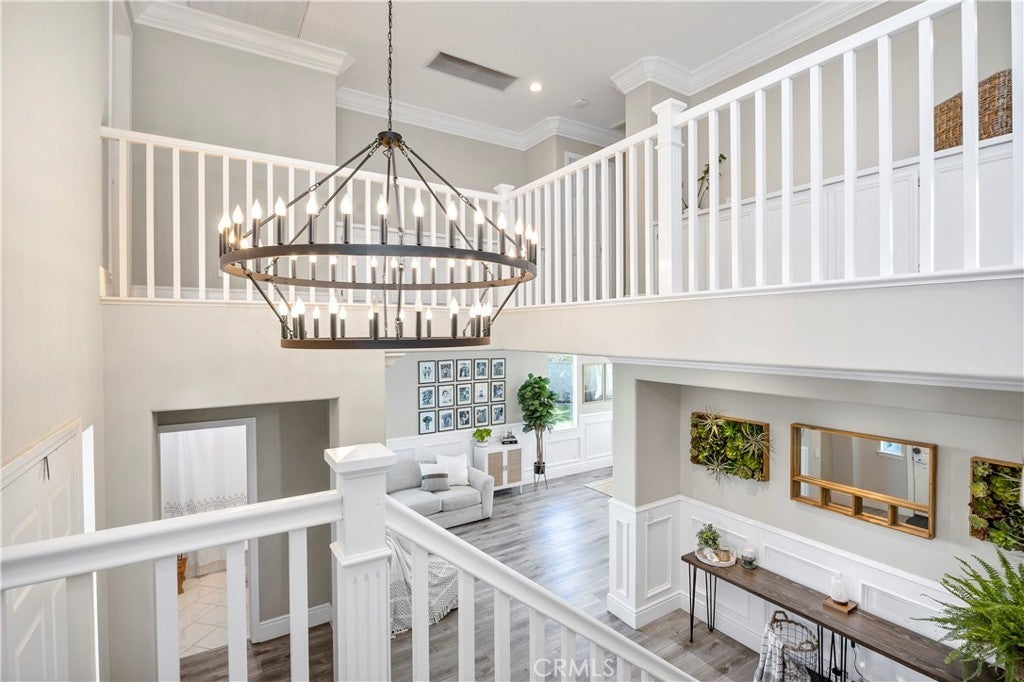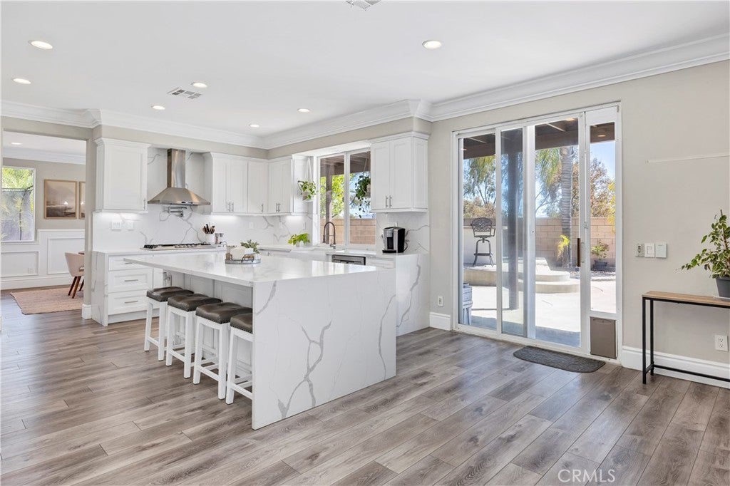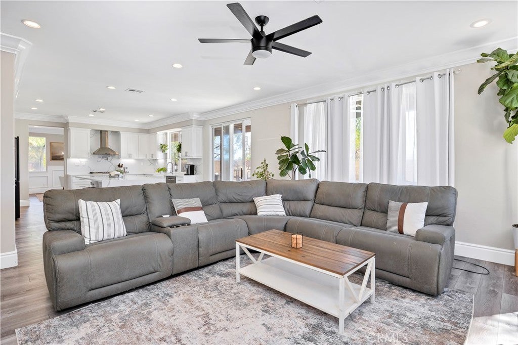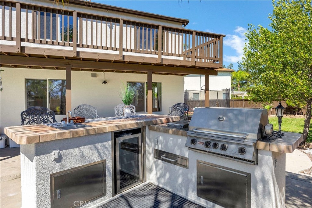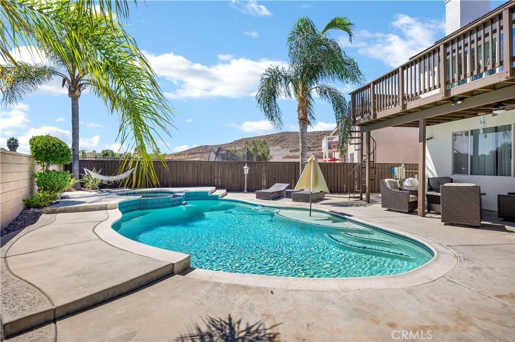 This stunning Rancho Bella Vista Pool Home awaits you! This beautifully remodeled 3,468 Sq. Ft. residence, cul-de-sac, corner lot exudes sophistication with striking curb appeal, fresh exterior paint, and high-end upgrades throughout. From the moment you arrive, you’ll notice the attention to detail and timeless designer finishes that make this home truly stand out! Step inside and be welcomed by a dramatic two-story entry showcasing an oversized chandelier, custom wainscoting, picture-frame molding, and a striking stone fireplace. The chef-inspired kitchen is the centerpiece of the home, featuring a massive quartz island, quartz backsplash, sleek new cabinetry, pot filler, wine fridge, double ovens, under-cabinet lighting, and a walk-in pantry, perfect for entertaining or everyday living. A refined downstairs office with custom French doors and an adjacent full-bath offers versatility and the ideal setup for multi-generational living or a private guest suite. Upstairs, retreat to the expansive primary suite with mirrored closet doors, a double-sided walk-in closet, and a spa-like bath with dual vanities, soaking tub, and separate shower. The suite opens to the impressive 100 Ft. full-length deck, perfect for morning coffee or sunset gatherings. A versatile loft/playroom also opens to the deck, capturing sweeping views with no rear neighbors. A graceful spiral staircase connects the upper deck to the pool level, creating seamless indoor-outdoor flow. Outdoors, your private backyard oasis awaits! Enjoy resort-style amenities including a sparkling saltwater pool and spa, firepit, BBQ island, and multiple seating areas for entertaining under the stars. Additional luxury features include Quiet Cool whole-house fans with auto window opener, EV charger, solar heated pool and spa, My Smart LED color-changing lighting system inside and out, 9-inch crown molding, 8-inch baseboards, smooth-finish walls, and designer tile. Located near community parks, amenities, and top-rated schools, this exceptional home combines elegance, comfort, and convenience. Truly a one-of-a-kind Rancho Bella Vista retreat, schedule your private showing today!