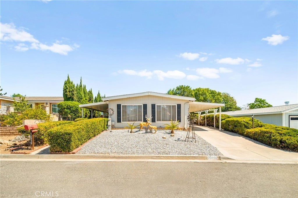 Welcome to The Farm in Wildomar. This single-story home offers an open and spacious floor plan with no-stairs entry. Inside features 2 bedrooms, 2 baths with a bright and airy layout, a super cute wet bar and plenty of space to gather. Relax on the covered front porch with your morning coffee or unwind in the enclosed sunroom patio. The Primary bedroom has 2 closets. The backyard is perfect for entertaining and provides direct access to the community orchard where you can pick your fill of fresh oranges, grapefruits, and other citrus fruits right from the trees. A detached 2-car garage and extra-long driveway offer abundant parking and storage options. Recent updates include a new AC system, newer flooring, and new water heater. Conveniently located between the 215 and 15 freeways, this home has plenty of room for expansion. This community offers plenty of amazing panoramic views as you drive around throughout. As a resident of The Farm, you’ll have access to unmatched amenities: 600 acres of open space & walking trails, 38 acres of citrus groves, 3 sparkling pools & 2 relaxing spas, Catch-and-release fishing pond, Amphitheater, a library, sports fields, basketball & tennis courts, vollyball courts 2 RV storage areas, picnic spots, playgrounds and a small community hall for rental use for the owners only. This is more than just a home—it’s a lifestyle filled with nature, recreation, and community. Low HOA and Low Taxes