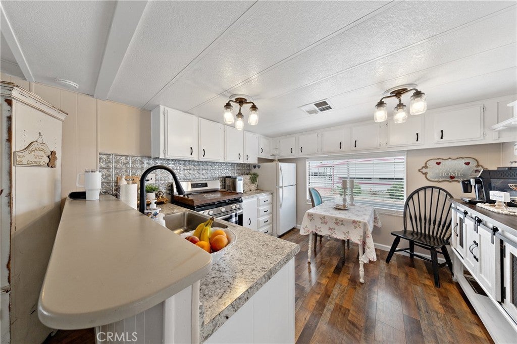 Absolutely turn-key-adorable mobile home in Colonial Country Club senior rental park. Cozy living area with laminated wood flooring and sliding glass door to raised front porch. Re-plumbed and freshly painted inside and out. New interior panel doors, hardware, upgraded light fixtures, and 2" blinds. Upgraded kitchen with 4-burner gas stove, granite-look Formica counter tops, decorative tin patterned backsplash, stainless sink, and refrigerator. Main bedroom has sliding barn-style closet door. Second bedroom is perfect for home office or hobby room with open closet and built-in storage. Remodeled bathroom boasts enlarged shower stall, vanity, and space for stackable washer and dryer. Colonial Country club is conveniently located near major shopping centers, restaurants, and services and offers loads of recreational options for residents including pool, pickle ball courts, and on-site golf course!