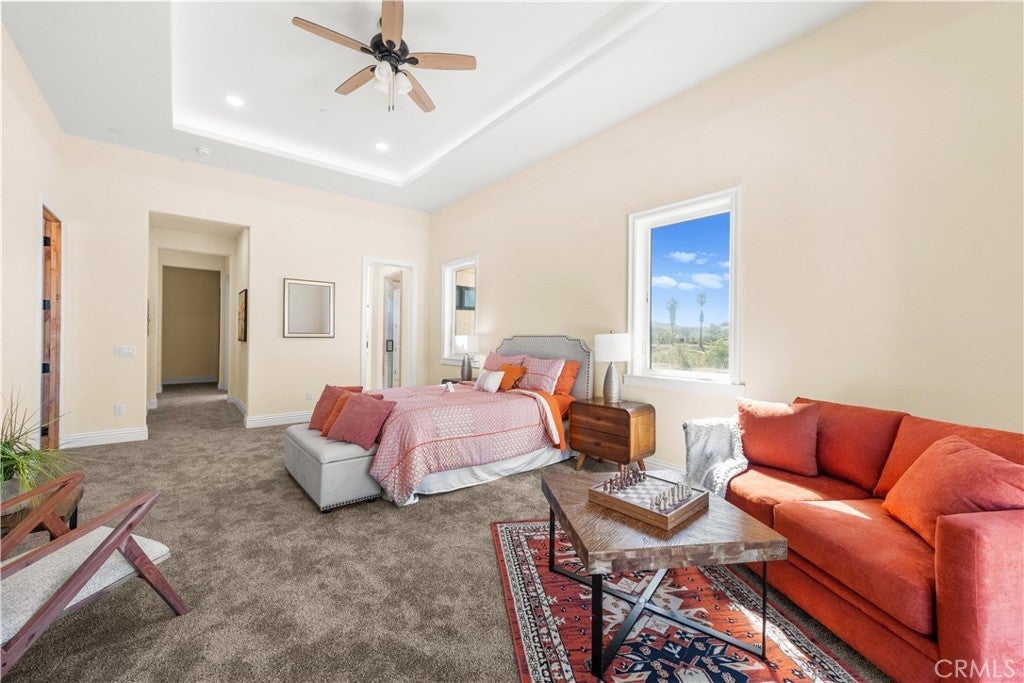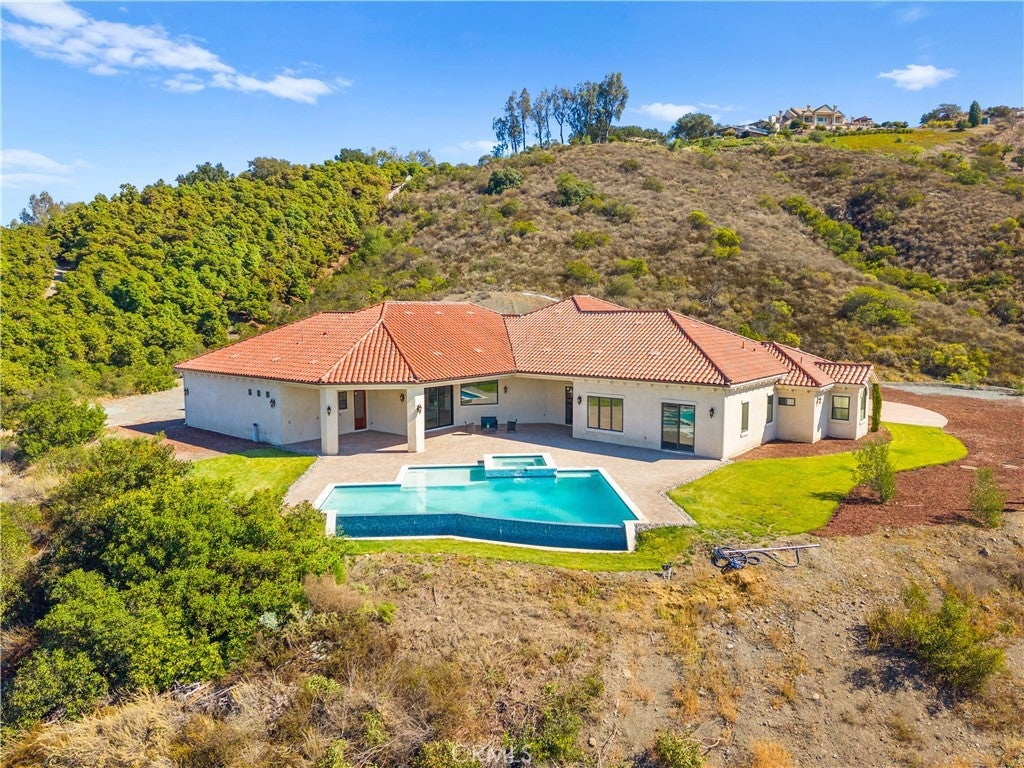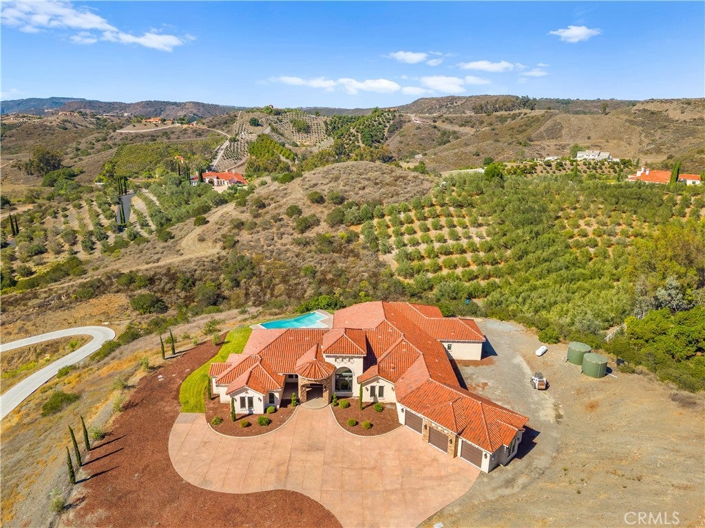Perched high above Cross Creek Golf Course in the prestigious De Luz community, this extraordinary single-level estate offers the ultimate in luxury, privacy, and panoramic views. Situated on 10 pristine acres with a long private gated drive, this residence combines refined architecture with resort-style amenities. Inside, the home boasts six bedrooms and six-and-a-half bathrooms, with every bedroom featuring its own en-suite bath for unparalleled comfort and privacy. The main suite is a true retreat, offering two oversized walk-in closets and spa-inspired finishes. Designed for both elegance and functionality, the home is filled with 12-foot ceilings throughout, with select areas soaring to 16 feet, creating a sense of grandeur and openness. At the heart of the home lies the chef’s kitchen, featuring custom cabinetry, double pantries, oversized center island, and premium finishes including soft-close drawers and shelving. Flowing seamlessly from the kitchen, the family room’s oversized windows frame breathtaking hillside and golf course views, filling the space with natural light. Entertainment abounds with a state-of-the-art theater room offering elevated stadium seating and an oversized projection screen, as well as a spacious exercise room for wellness at home. Outdoors, the property transforms into a private resort with a stunning infinity-edge pool, expansive covered patios, and outdoor entertaining areas surrounded by custom hand-laid pavers. From sunrise to sunset, enjoy sweeping views of the surrounding valleys, mountains, and the rolling greens below. Additional highlights include: Private fire protection system, including a dedicated fire hydrant and a dual 5000 gallon water tank (10,000 gallons) located conveniently next to the home. Luxury craftsmanship with custom finishes throughout. Oversized motor court with ample parking and RV potential. Space below the main pad for a workshop, additional vehicles, or animals. Elevated, private hilltop setting offering unmatched serenity. This remarkable estate is more than a home—it’s a lifestyle of luxury, privacy, and unforgettable views. Only 11 minute drive into Temecula Old Town.