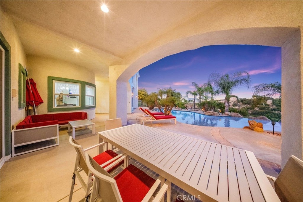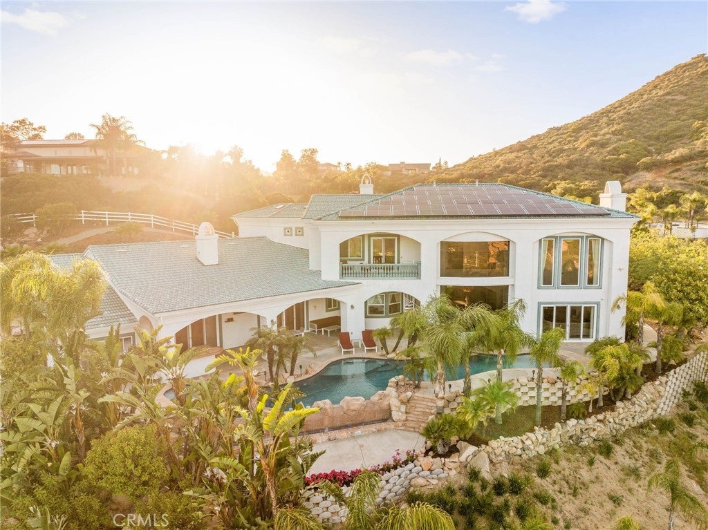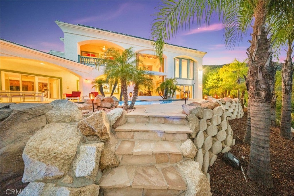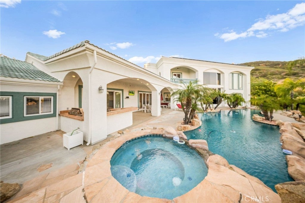Exquisite Custom Estate with Panoramic Views in Prestigious La Cresta. Discover one of the most extraordinary homes currently available in Murrieta, offering over 6,400 sq ft of refined luxury on more than 5 acres, nestled in the highly coveted La Cresta community. Boasting 4 spacious bedrooms and 4.5 bathrooms, this exceptional property delivers the perfect blend of elegance, comfort, and functionality. Enter through a private, gated driveway to a grand double-door entrance, where you're welcomed by soaring ceilings and a dramatic foyer with rich finishes. The open-concept layout is designed to highlight the sweeping 180-degree views of the Murrieta and Temecula Valleys, visible from nearly every room in the home. Walls of windows and glass doors seamlessly connect the indoor living space to the stunning backyard oasis. Step outside to experience true resort-style living with a sparkling pool and spa, built-in custom BBQ island, and a private guest cabana complete with its own bathroom and shower, ideal for hosting or extended stays. Entertain, relax, and soak in all this property offers. The gourmet chef’s kitchen is a culinary masterpiece, complete with high-end stainless steel appliances, granite countertops, custom cabinetry, a large center island with seating, and walk-in pantry. Entertain with ease in the formal living and dining rooms, breakfast nook, and expansive family room, all showcasing incredible views. A fully-equipped custom bar, complete with sink and mini fridge, anchors the impressive game room featuring a billiards table, shuffleboard, and a temperature-controlled wine cellar. Downstairs includes two private ensuite bedrooms, one is currently utilized as a home office with a separate entrance. Upstairs, two additional ensuite bedrooms with walk-in closets. The luxurious primary suite is a true retreat- enjoy sunrises from your private balcony, unwind in the jetted tub, sauna, or massive walk-in shower, and enjoy the expansive walk-in closet with built-in cabinetry and an adjacent private gym. Additional features include an attached 4-car garage with built-in storage, central vacuum system, water softener, security system with cameras, and a solar power system. Set within one of Murrieta’s most sought-after communities, this property offers tranquility, privacy, and easy access to top-rated schools, shopping, dining, and the renowned Temecula wine country. This one-of-a-kind estate is a rare opportunity-schedule your private tour today!