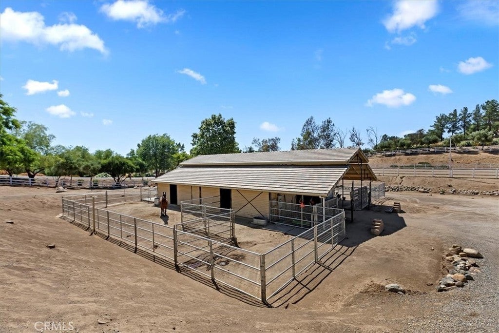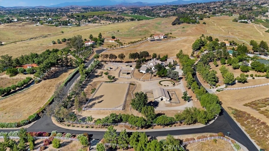 Beautiful custom estate nestled on 4.36 acres in the heart of Temecula Wine Country. Wrought iron gate entry leads to a circular drive with porte-cochere bridging main house with separate guest quarters, full bath and garage areas. This estate boasts 3,330 sq. ft of luxurious living. Main living is on the main floor with the master suite with retreat and fireplace. Jack & Jill bedrooms located at other end of home. An upstairs office or could be a bedroom with balcony. This beautiful home boasts 4 bedroom/3 bath, living room and family room with wood burning fireplace. The kitchen is well appointed with double ovens, lots of beautiful cabinetry, large island, stainless steel appliance, sub zero refrigerator and a walk in pantry. Fantastic outdoor covered living areas w/BBQ island overlooks pool with diving board and spa. Wifi remotely activated spa & pool controls. A separate guest house 750+- sq. ft. sleeps 4 with one bedroom and one bath, walk in closet, living room area with kitchenette. Wonderful covered patios in the front patio with a darling casita that sleeps 2 with 1 bedroom & 1 bath and walk in closet and garage. The horse facilites are fantastic with 6 stall barn with large breezeway, hay room, tack room and wash racks & grooming stalls. Huge working arena with lights approx. 100x200 ft. Large paddocks with covers. Lots of usable land with plenty of turnaround for trailers & RV's. RV pad with electricity, water and dumping station. All fenced and cross fenced with security gates. Centrally located with 1.5 hours to LA, San Diego, Orange County & Palm Springs. Temecula living at it's best!!