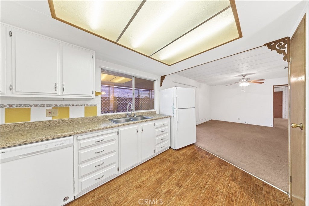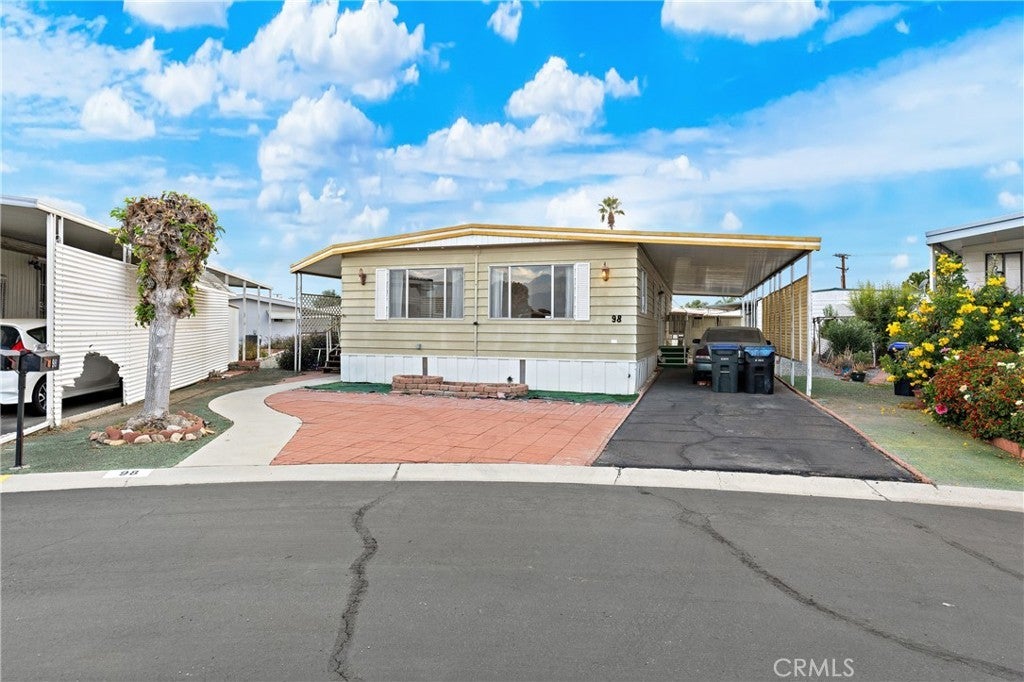 Large 2 bedroom 2 bath mobile in Golden Coach Manor senior rental park. Living room with ceiling fan and built-in china hutch. Kitchen has Formica counter tops, Stainless steal sink, 5-burner stove, breakfast bar, standing pantry, and laminated flooring. Family room with slider to covered porch. Primary bedroom has 2 mirrored wardrobes and a linen closet, dual-sink seated vanity, shower stall. Inside laundry. Wheel chair lift. 2 sheds. Close to dining and shopping options. Lovely park amenities.