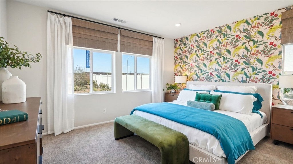 New Construction - This 1,576-square foot single-story home with [3] bedrooms and [2] full bathrooms. The exterior of the home is a California Spanish façade with a large back yard. The eat in kitchen island has Bianco Tiza QUARTZ counters, built-in stainless-steel appliances and a pantry closet. The interior comes complete with Crisp White shaker-style cabinetry throughout, lots of included recessed lighting, and upgraded flooring with plush carpet in bedrooms, closets, and stairs, and vinyl in main living areas. The primary bedroom has an ensuite bathroom with double sinks and a walk-in closet, and there are 2 additional bedrooms, a full bathroom, and laundry room. There is also a direct-access 2-car garage PRE-PLUMBED for an electric car! This truly modern home has all the Smart Home features you would expect and is landscaped and irrigated in the front yard. The Juniper community is situated close to park and freeway access. We anticipate a December move-in, This Home has Solar Included in the Price of the Home !