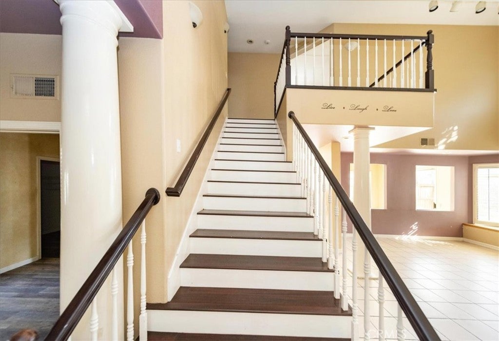 PAID OFF SOLAR!!! Tucked away in a peaceful cul-de-sac, this energy-efficient, solar-powered residence offers more than 2,600 square feet of thoughtfully designed living space. Featuring 5 bedrooms and 3 bathrooms, the home’s airy layout, soaring ceilings, and open-concept design make it ideal for gatherings and everyday comfort. Step through the impressive double doors into a bright entryway accented by 20-foot ceilings, stylish new tile flooring, warm neutral tones, and elegant wood shutters that let you control the natural light. Unlike many homes in the neighborhood, this one includes a versatile downstairs suite, perfect for guests, in-laws, or a private home office. The main level flows beautifully with a formal living and dining area leading into a cozy family room, breakfast nook, and a crisp white kitchen complete with a center island, walk-in pantry, and nearby laundry area for convenience. Upstairs, new flooring extends throughout the entire level. The expansive primary suite is truly a retreat featuring high ceilings, dual walk-in closets, a luxurious bathroom with his-and-hers vanities, soaking tub, separate shower, and private water closet. Three additional well-sized bedrooms and a full bath complete the upper floor, making it perfect for families who prefer all bedrooms close together. Outside, the front and backyards are landscaped with low-maintenance, drought-tolerant plants, blending beauty and sustainability. Come experience this exceptional home and imagine the lifestyle it offers!