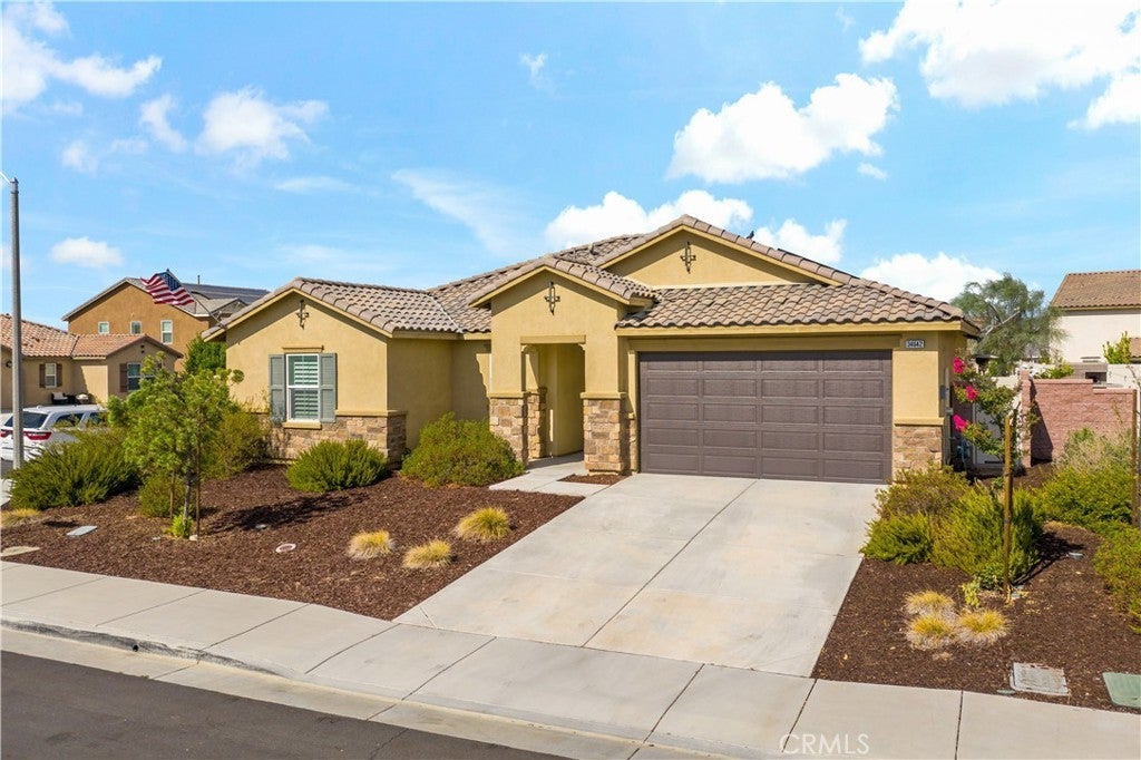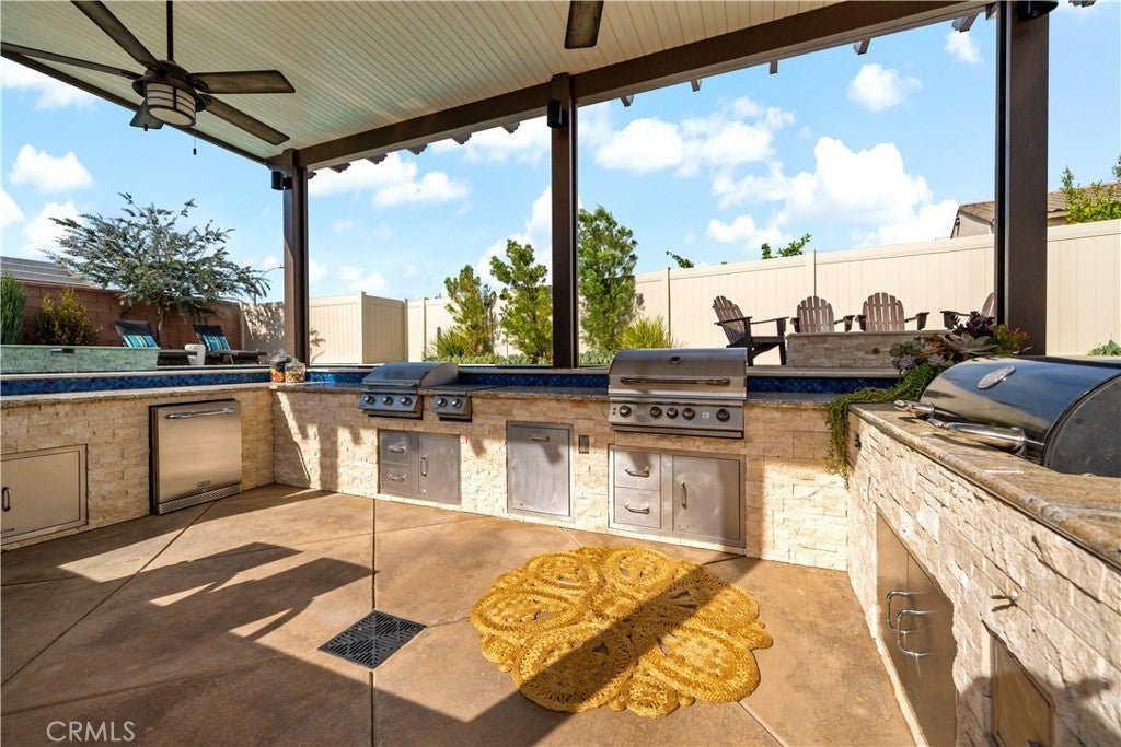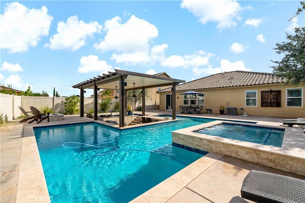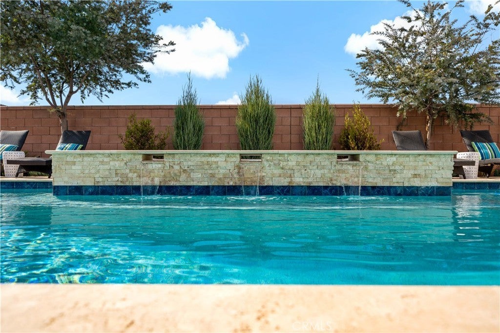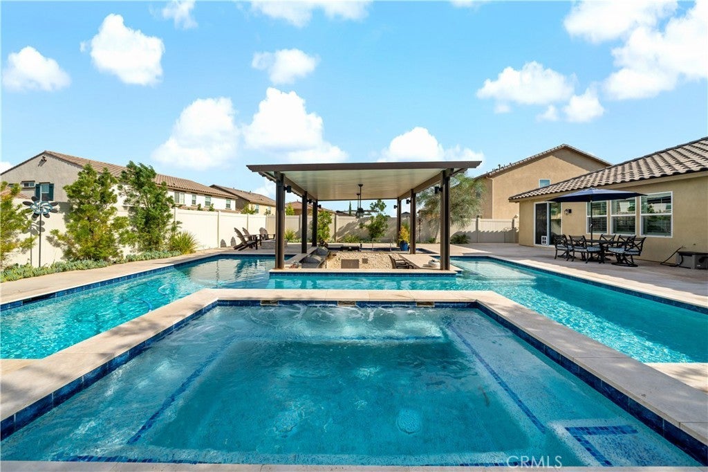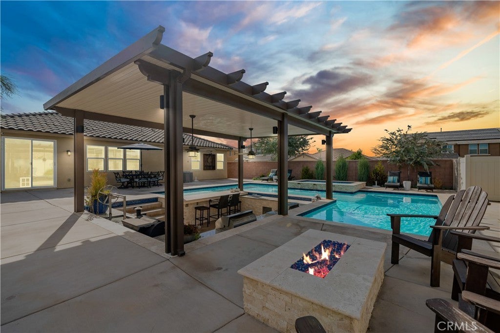 Stunning single-story pool home in Mahogany Hills and the backyard is the showstopper with over $200,000 in upgrades. The outdoor oasis hits you first: a flawless PebbleTec pool with abalone/sea-glass finish, oversized spa with stacked stone, water features, and a true resort-style swim-up bar. The sunken outdoor kitchen is next-level, fully loaded with a Bull BBQ, griddle, smoker, Santa Maria spit, burner stove, refrigerator, granite counters, ceiling fans, and tons of seating — all under a full Alumawood pergola. Evenings wrap perfectly around the gas fire pit. This yard is built for living. Inside, the home is just as dialed-in. A bright, open layout with a gourmet kitchen and great room flows effortlessly for everyday living and entertaining. The kitchen is a “10” oversized island with seating, modern white cabinetry with brushed nickel hardware, quartz counters, stainless appliances (including a new fridge) and a wide-open connection to the great room. The upgrades continue throughout: wood-style tile plank flooring, plantation shutters, oversized baseboards, and leased solar to keep monthly energy costs down. There’s also a versatile office/den that can easily convert to a 4th bedroom. Sitting on a private corner lot on a cul-de-sac with manicured trail access, this home gives you privacy, views, and convenience. Close to parks, an elementary school, interstates, shopping, dining, and local wineries. Bold, beautiful, and turnkey — don’t miss this spectacular home.