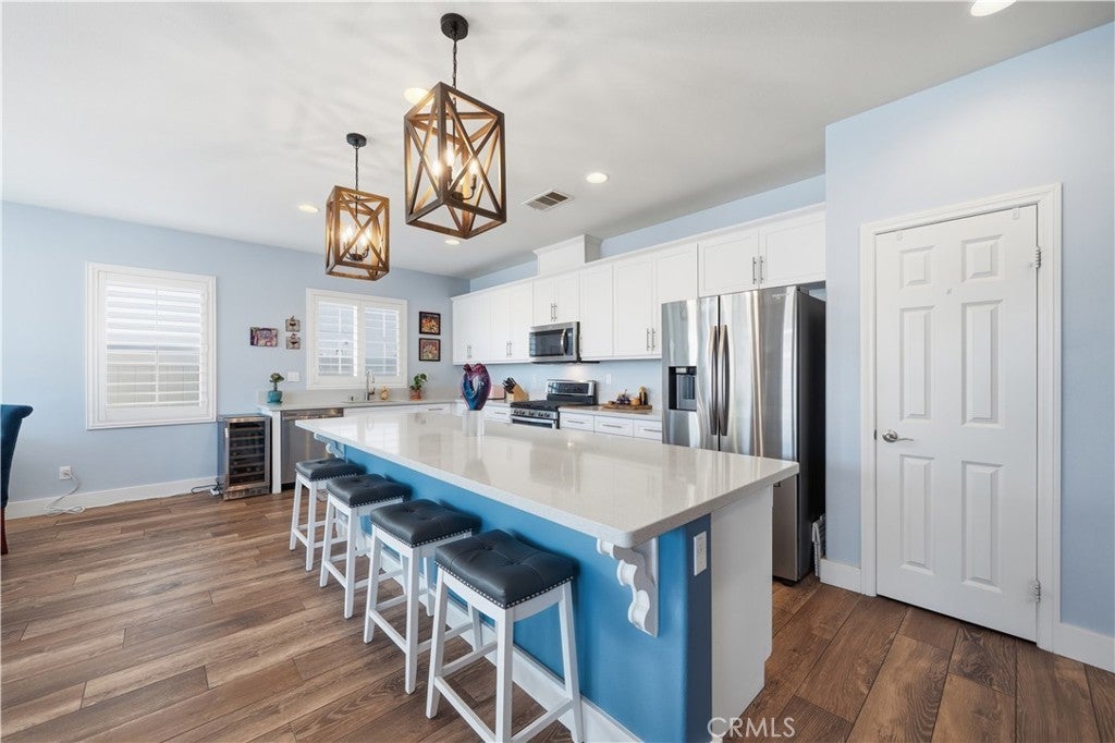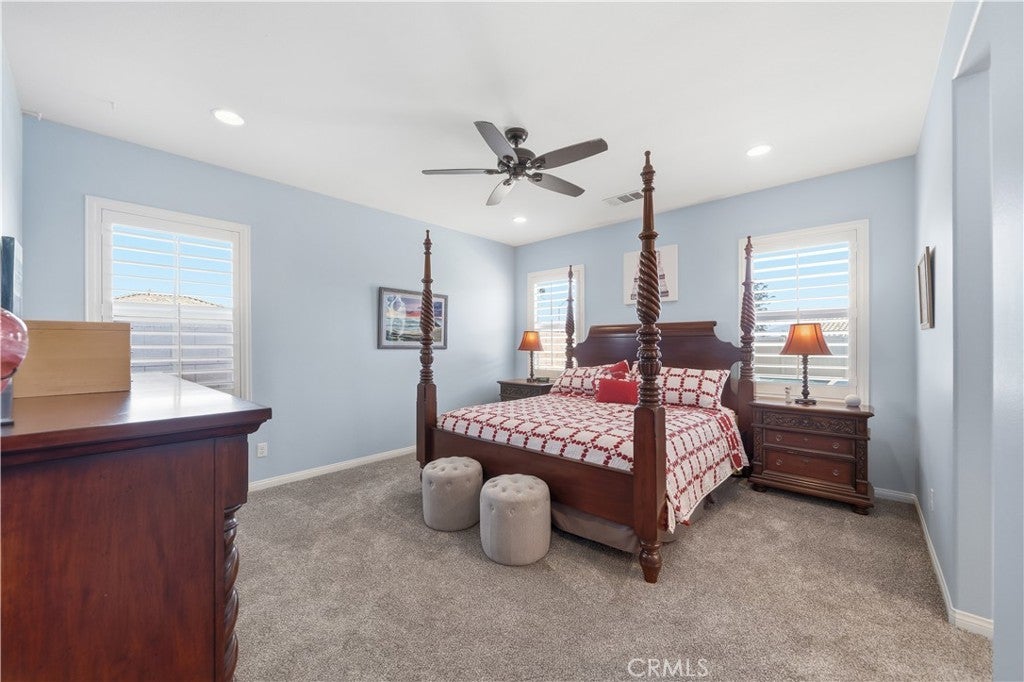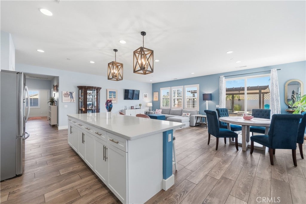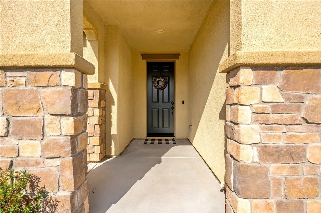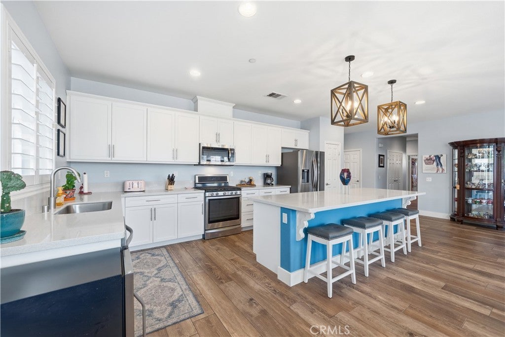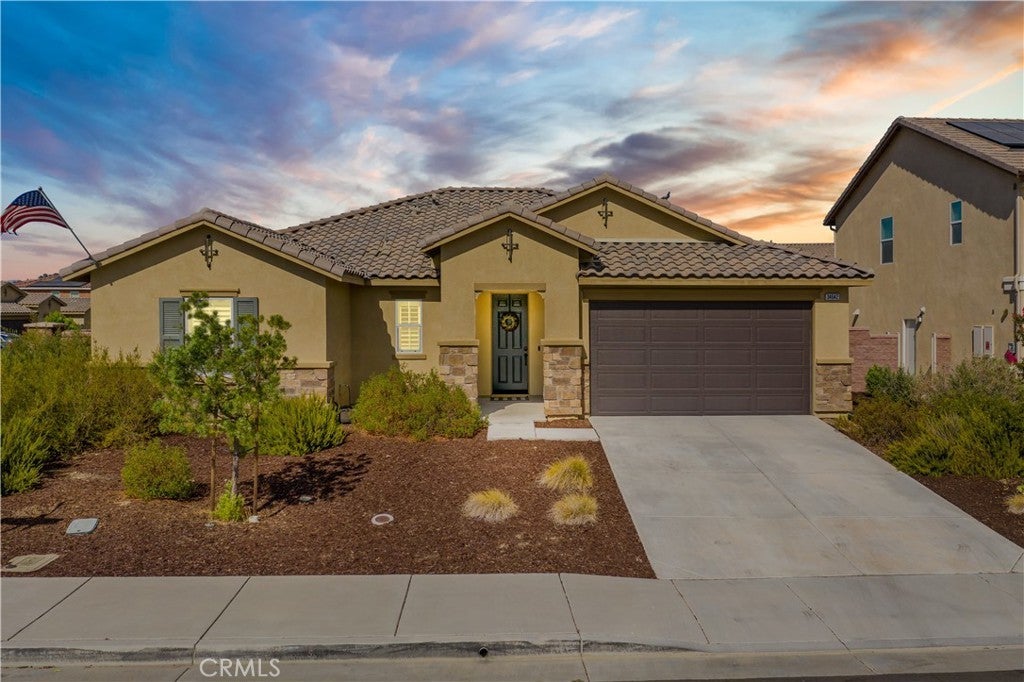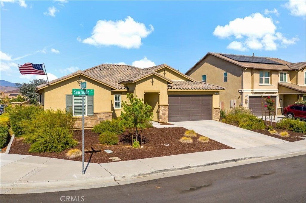 Stunning single-story pool home in Mahogany Hills and the backyard is the showstopper with over $200,000 in upgrades. The outdoor oasis hits you first: a flawless PebbleTec pool with abalone/sea-glass finish, oversized spa with stacked stone, water features, and a true resort-style swim-up bar. The sunken outdoor kitchen is next-level, fully loaded with a Bull BBQ, griddle, smoker, Santa Maria spit, burner stove, refrigerator, granite counters, ceiling fans, and tons of seating — all under a full Alumawood pergola. Evenings wrap perfectly around the gas fire pit. This yard is built for living. Inside, the home is just as dialed-in. A bright, open layout with a gourmet kitchen and great room flows effortlessly for everyday living and entertaining. The kitchen is a “10” oversized island with seating, modern white cabinetry with brushed nickel hardware, quartz counters, stainless appliances (including a new fridge) and a wide-open connection to the great room. The upgrades continue throughout: wood-style tile plank flooring, plantation shutters, oversized baseboards, and leased solar to keep monthly energy costs down. There’s also a versatile office/den that can easily convert to a 4th bedroom. Sitting on a private corner lot on a cul-de-sac with manicured trail access, this home gives you privacy, views, and convenience. Close to parks, an elementary school, interstates, shopping, dining, and local wineries. Bold, beautiful, and turnkey — don’t miss this spectacular home.