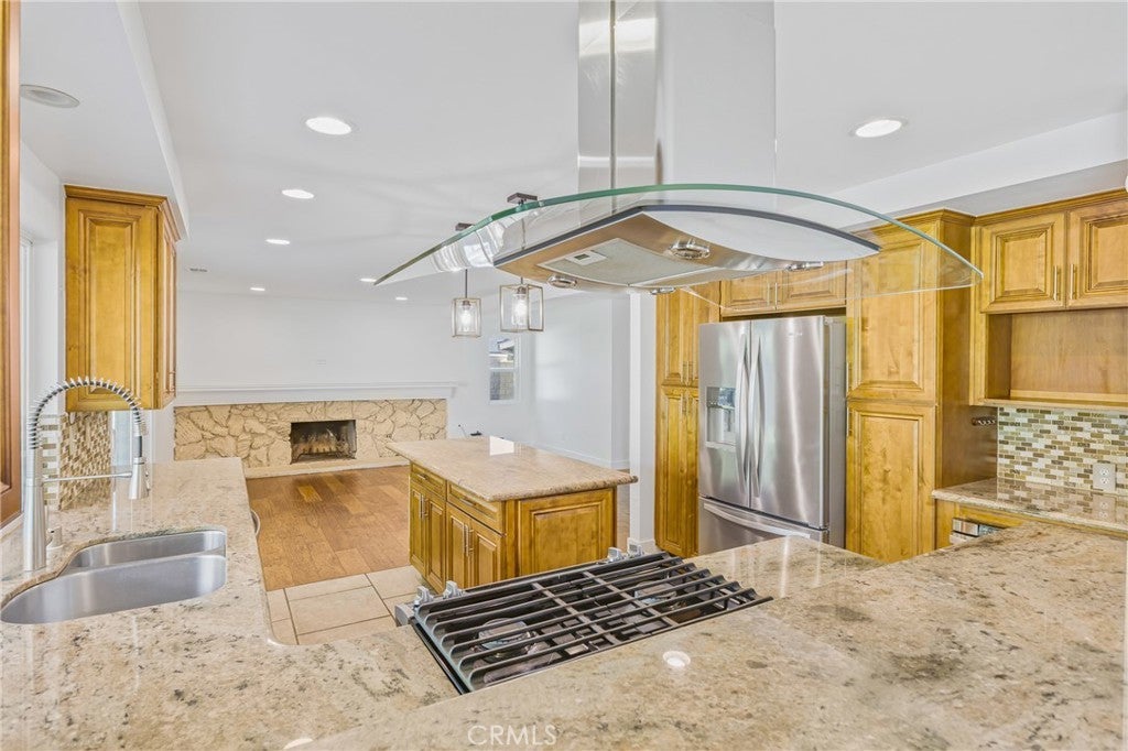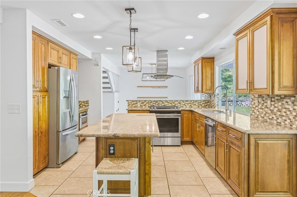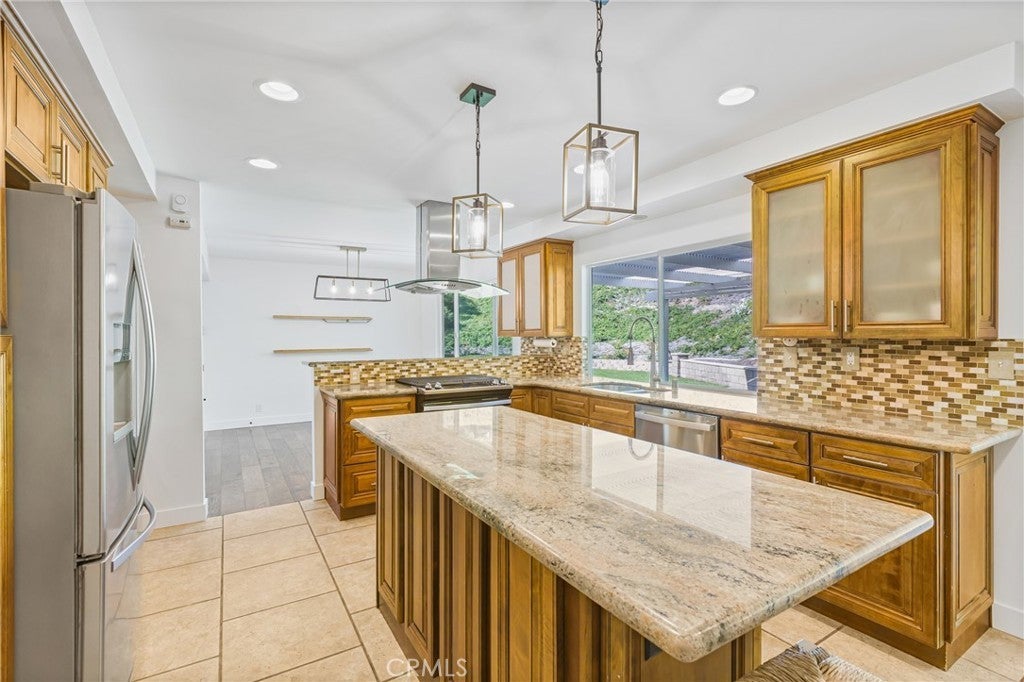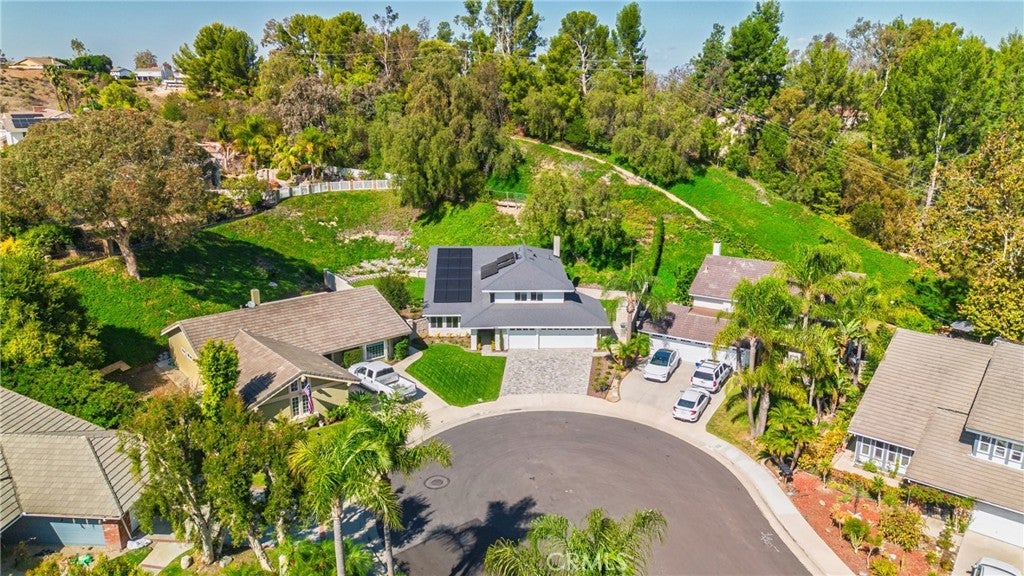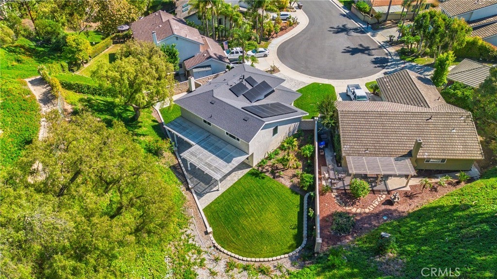 Welcome to this stunning, turnkey four-bedroom home on an expansive pie-shaped lot at the end of a quiet cul-de-sac in the heart of Anaheim Hills—close to top-rated schools, shopping, dining, and convenient freeway access. Perfectly remodeled inside and out, this home blends modern sophistication with timeless comfort in a prime location. Step through custom wood double entry doors into a bright, open floor plan with soaring vaulted ceilings and an abundance of natural light. The spacious living and family rooms feature a beautiful stone fireplace and seamless flow into the remodeled kitchen—an entertainer’s dream with granite slab countertops, full-height custom stone backsplash, rich wood cabinetry, stainless steel appliances, a large breakfast counter, and custom range hood. Recessed lighting and new contemporary fixtures enhance the inviting atmosphere throughout. Extensive hardwood flooring runs across both levels, accented by new baseboards, door casings, and hardware. The home includes energy-efficient dual-pane windows, custom window coverings, and ceiling fans for year-round comfort. A conveniently located indoor laundry room connects directly to the finished three-car garage with sectional roll-up doors. Upstairs, the reimagined primary suite offers a luxurious spa-inspired retreat featuring a soaking tub, walk-in shower with multiple shower heads—including a rain shower—frameless glass enclosure, and custom stone dual vanity. A large walk-in closet with built-in cabinetry completes this elegant space. The exterior is equally impressive, boasting a limestone-clad façade, extensive paver stone driveway, walkways and rear patio, well manicured landscaping, and a large private backyard. The expansive covered patio and adjoining lawn create the perfect setting for outdoor entertaining or peaceful relaxation. Additional features include block and garden walls, paid solar system, and low taxes with a low HOA. From the impeccable craftsmanship to the thoughtful upgrades and flexible layout, this Anaheim Hills gem truly has it all—comfort, style, and exceptional value in one of the area’s most sought-after neighborhoods.