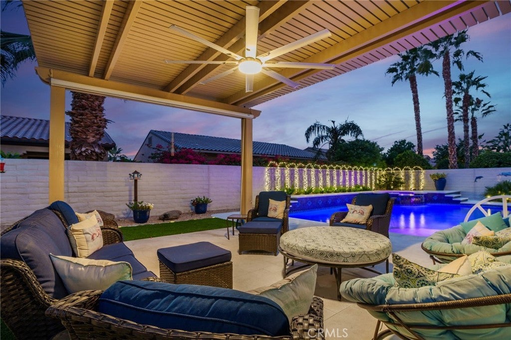 ***DON’T MISS THIS STUNNING CASTELLANO-MODEL POOL HOME—OVER $211,000 IN RECENT UPGRADES—IN THE HIGHLY DESIRABLE SUN CITY SHADOW HILLS COMMUNITY! Premium Quality, Absolutely Immaculate, and Truly Move-In Ready!***This beautifully maintained 2,230 sq. ft. single-story residence offers 2 bedrooms, 2.5 baths, and a spacious bonus office/den, all wrapped in an inviting open-concept design with travertine flooring and plantation shutters throughout. The brand-new gourmet kitchen is a chef’s delight, showcasing premium granite countertops, an enlarged center island, a 7-person breakfast bar, stainless steel appliances, five-burner gas cooktop, double ovens, under-cabinet lighting, and soft-close pull-out cabinetry. A generous dining area complements the kitchen, while the formal dining room—currently used as a sewing room—features a unique built-in shelf encircling the space. The expansive great room opens to your private desert oasis: a completely redesigned backyard with a new saltwater pool and spa, travertine decking (cooler underfoot in hot temps), fresh landscaping, a covered dining area, and an extended covered patio with a retractable movie screen—perfect for both relaxation and entertaining. The luxurious primary suite offers a large walk-in closet, dual vanities, a Roman soaking tub, and an oversized walk-in shower. The privately located secondary bedroom—with an adjacent full bath—is ideal for guests or multi-generational living. A stylish powder room is conveniently positioned off the main living area as well as a laundry room with sink and bonus cabinetry. The 2-car garage enjoys an additional 3rd golf-cart garage...the garage features insulated roll-up doors, overhead storage and a mini-split heating and air-conditioning unit (to moderate temperatures in summer and winter). Enjoy resort-style living in Sun City Shadow Hills, an active adult community featuring two golf courses with lakes, multiple clubhouses, fitness centers, indoor and outdoor pools/spas, pickleball, tennis, bocce, shuffleboard, table tennis, billiards, dining options, and countless clubs and activities. HOA dues even include internet! There is way too much to list everything that this property has to offer in this description! With exceptional upgrades and a brand-new pool and spa, this home truly defines desert living at its finest.