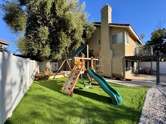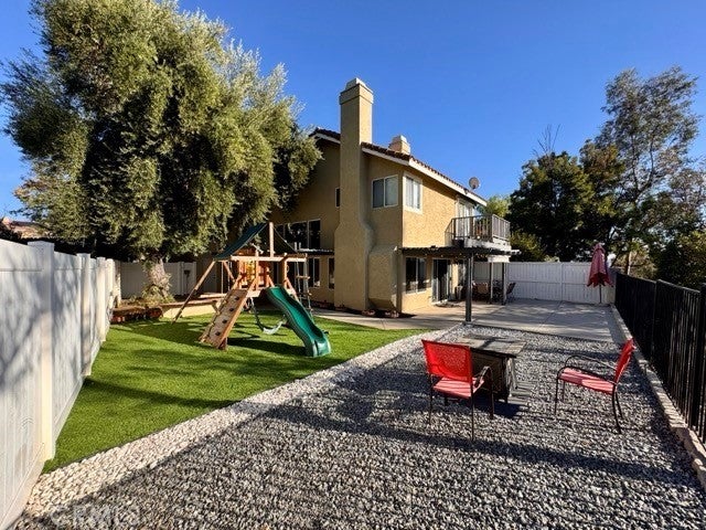 Welcome to this beautiful 4 bedroom, 3 bathroom home with Solar INCLUDED located in the desirable Malaguena community of Murrieta. This inviting residence offers an open and airy atmosphere, enhanced by abundant natural light streaming through numerous windows. The home features a blend of wood, tile, and carpet flooring throughout. Upon entry, you’re greeted by a cozy living room that flows seamlessly into the formal dining area, perfect for gatherings. Adjacent is the family room, complete with a fireplace and open access to the kitchen. The kitchen boasts dark cabinetry with ample storage, granite countertops, and a breakfast bar for casual dining. The main level also includes a bedroom, a full bathroom, and a convenient laundry room. Upstairs, you’ll find the remaining bedrooms and bathrooms, thoughtfully positioned for privacy. The spacious primary suite offers a peaceful retreat with its own fireplace, private balcony with scenic views, and an ensuite bathroom featuring dual sinks, a vanity, soaking tub, glass-enclosed shower, and a large walk-in closet. The backyard is ideal for relaxation and entertaining, featuring two separate covered patios, a firepit, artificial turf with rock landscaping, a playground, and beautiful surrounding views. Additional highlights include a three car garage and a prime location near freeway access, shopping, dining, and more, providing both comfort and convenience. Schedule a showing today and make this exceptional home yours!