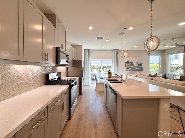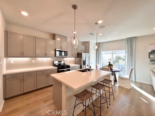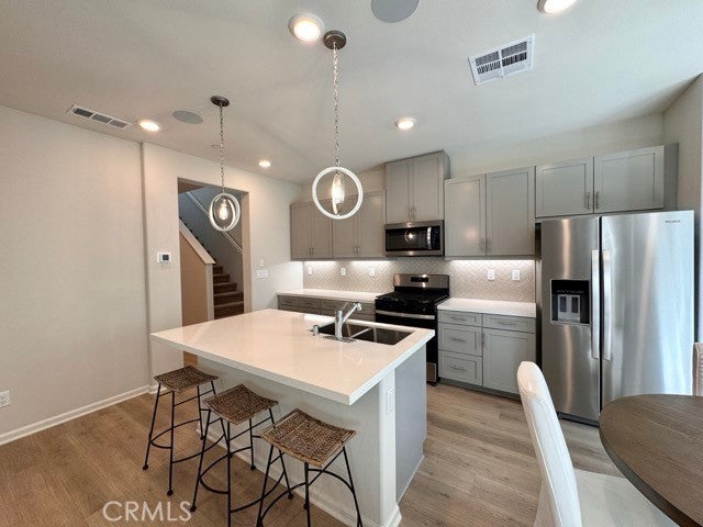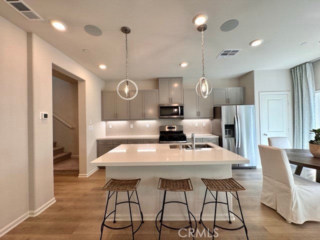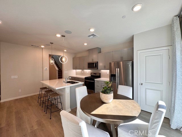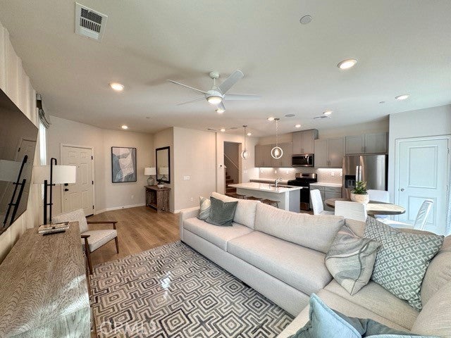 Welcome to this beautifully designed, brand new 4 bedroom, 3 bathroom home with solar included! Offering 2,049 square feet of modern living space staged to perfection, this stunning property is located within a gated community in Moreno Valley. Enter inside to discover an open-concept layout filled with natural light and stylish finishes throughout. The spacious living room seamlessly connects to a contemporary kitchen featuring granite countertops, stainless steel appliances, and ample cabinet space. Just off the kitchen is a bright dining area. Down the hall, you’ll find a convenient half bathroom and a versatile den, ideal for a home office or playroom. Upstairs, a welcoming landing area is staged as a study/workspace, offering additional flexibility. All bedrooms are located upstairs, including a luxurious primary suite complete with a spacious bedroom, en suite bathroom with dual sinks, a soaking tub, separate shower, and a large walk-in closet. The upstairs laundry room adds extra convenience. Enjoy the outdoors in your private, fenced-in backyard with fresh landscaping, perfect for relaxing. Additional features include a two-car garage, solar panels, and a tankless water heater for energy efficiency. Located close to schools, shopping, and freeway access, this home combines comfort, style, and convenience all in one! Don’t miss your chance to make this brand-new home yours, schedule a showing today!
