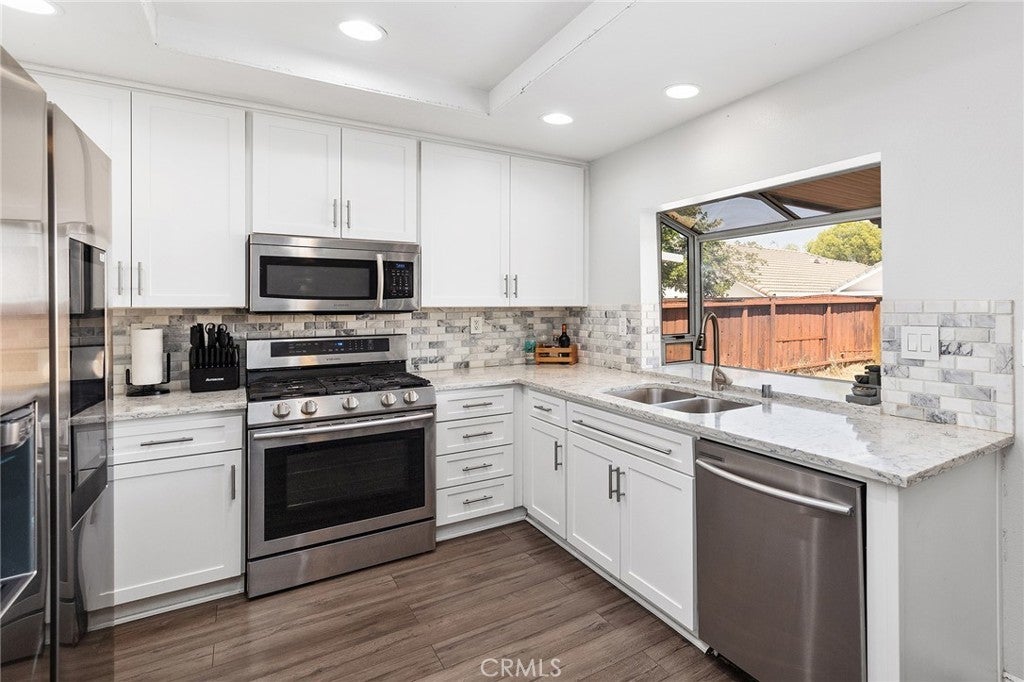 YOU FOUND YOUR NEXT RENTAL! Beautifully updated single-story home in the desirable Menifee Lakes community, just one block from the lake. This 2-bedroom, 2-bath residence offers approximately 1,255 sq ft of open, light-filled living space with vaulted ceilings, a cozy fireplace, and wood-laminate flooring throughout—no carpet. The remodeled kitchen features quartz countertops, white cabinetry, custom backsplash, and a garden window overlooking the backyard. Both bedrooms are on the main level, including a spacious primary suite and a secondary bedroom ideal for guests or a home office. Enjoy outdoor living in the private backyard with fresh landscaping and an alumawood patio cover with ceiling fans. Additional highlights include a two-car attached garage, newer A/C, and a well-maintained neighborhood with low HOA dues. Conveniently located near shopping, dining, and scenic lake walks—this home offers comfort, style, and easy living in a sought-after community.