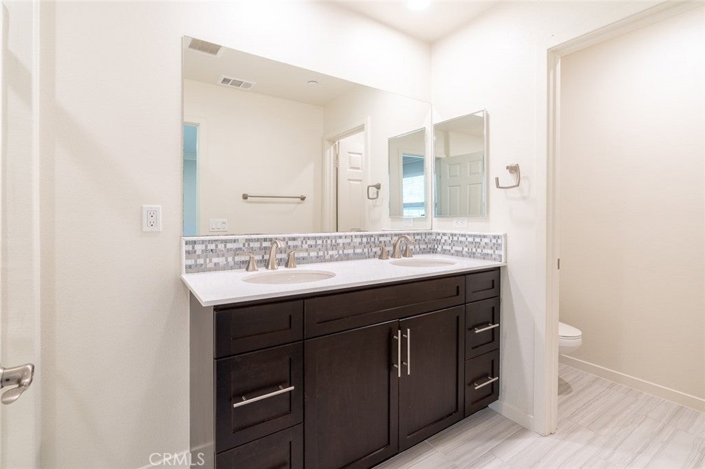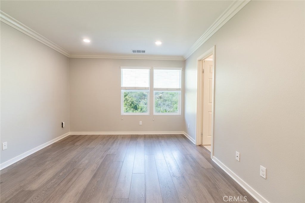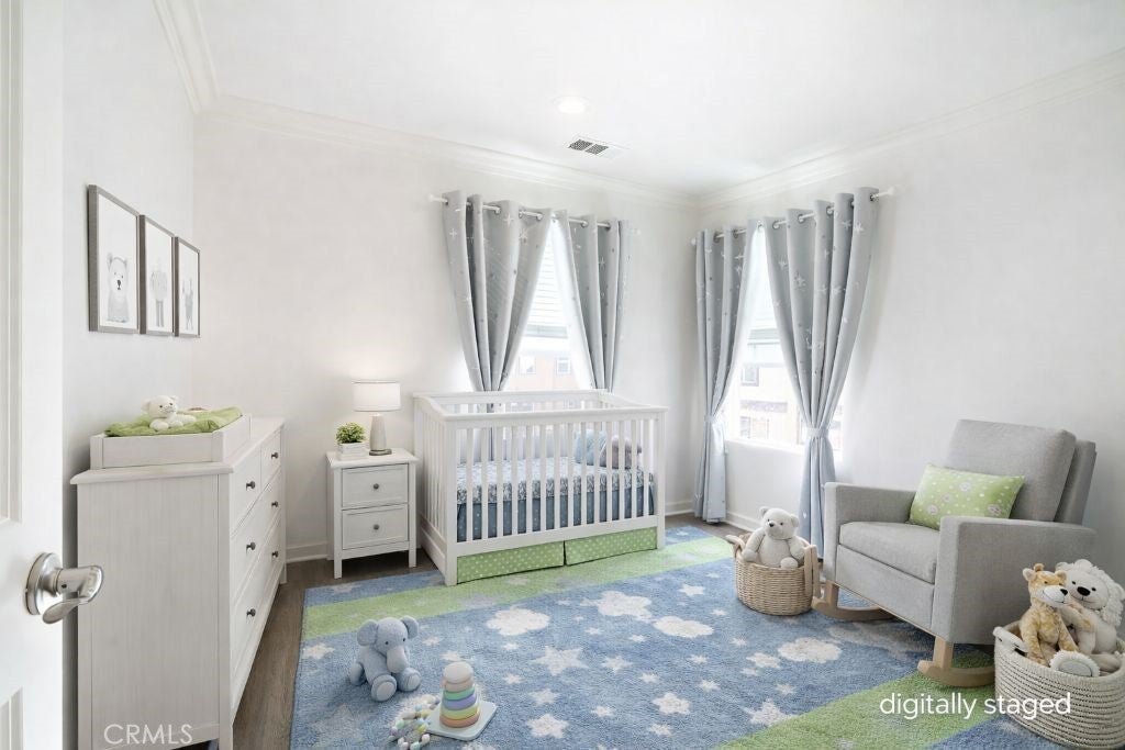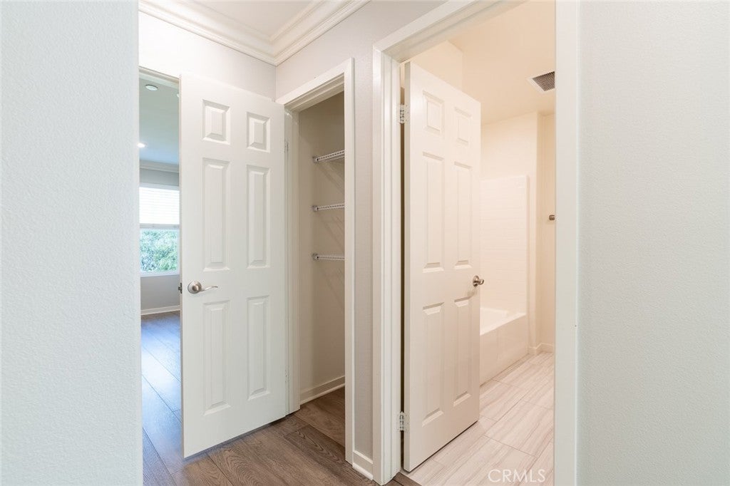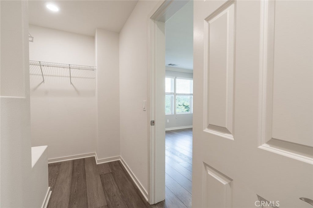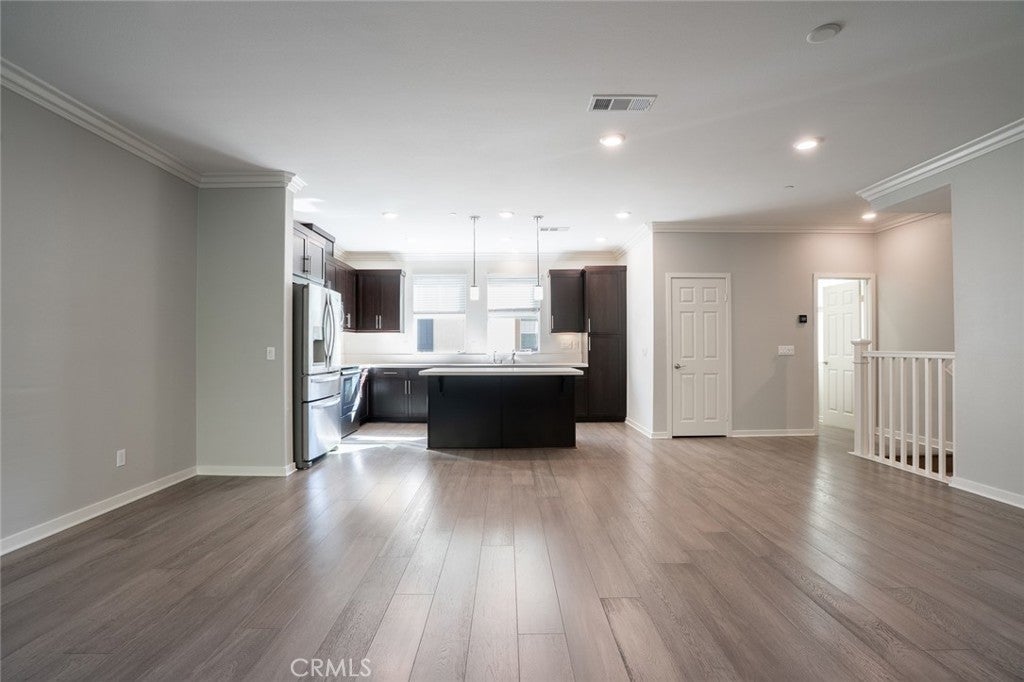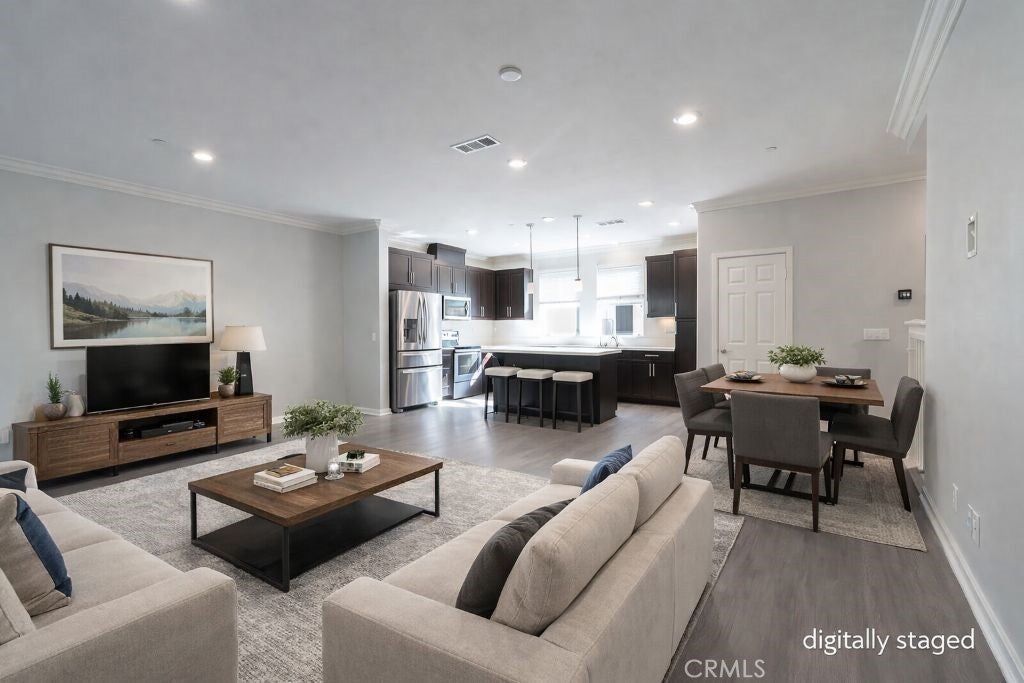 Tri-level townhome in San Marcos featuring PAID solar, central heating and air conditioning, whole house fan, and an EV-ready 2-car attached garage with overhead and standing storage racks. The second-floor main living area offers an open layout with a full kitchen, center island, quartz countertops, and included appliances: refrigerator, range, microwave, dishwasher, washer, and dryer. Additional features include a spacious living area, half bathroom, storage closet, and access to a private balcony. The third floor includes all three bedrooms, a laundry area, and additional storage. Two bedrooms feature mirrored closet doors, and the primary suite offers a walk-in closet. Interior upgrades include hardwood flooring, crown molding, recessed lighting, new carpet on stairs, and an alkaline water system under the kitchen sink. Electrical outlets with built-in USB ports are installed in the kitchen, living area, and bedrooms. Community amenities include BBQ and picnic areas and a playground. Conveniently located near shopping, dining, freeway access, and Kaiser medical facilities.