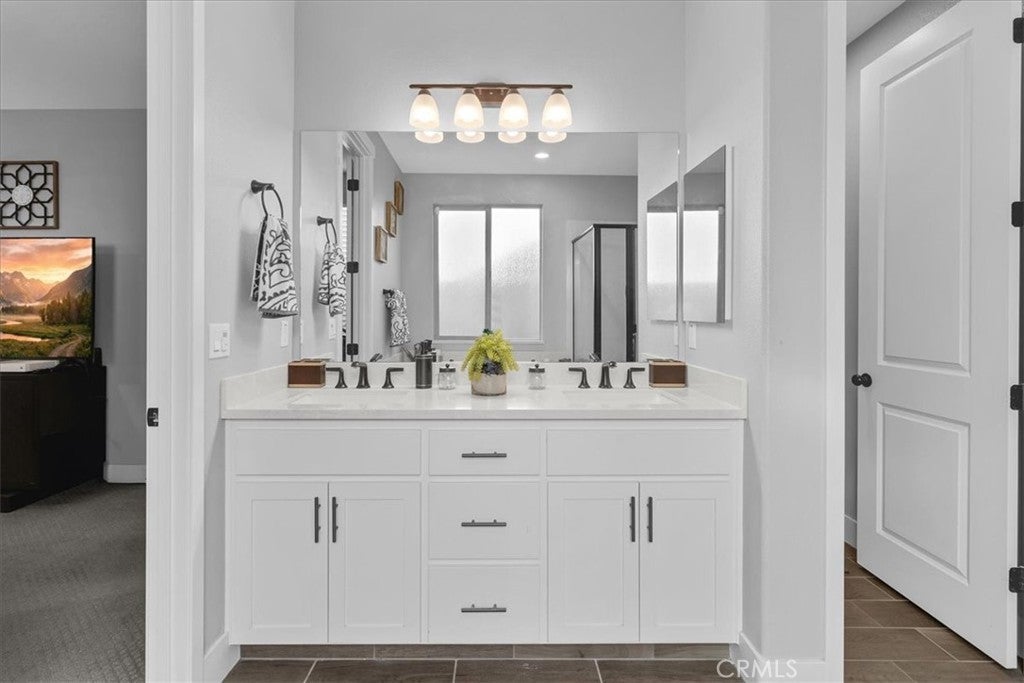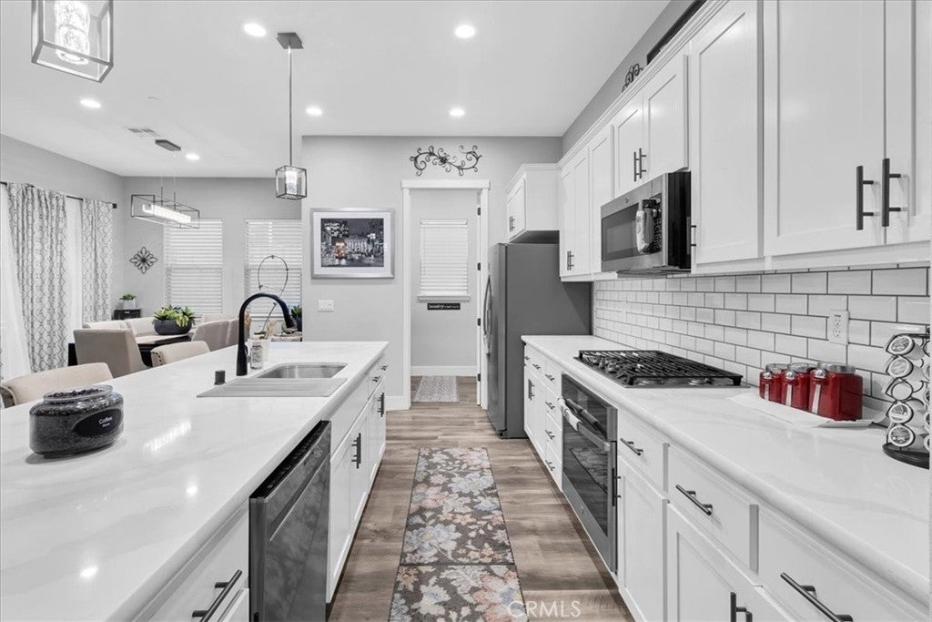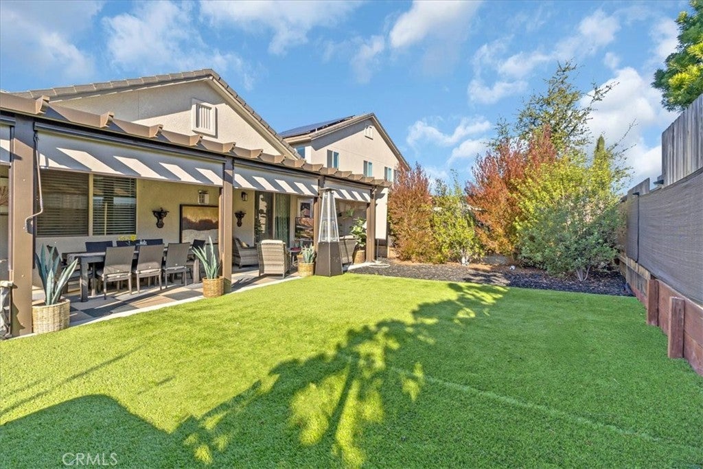 This completely upgraded single-story home offers modern style, thoughtful design, and an entertainer’s dream backyard. The open-concept living area features a spacious great room with abundant natural light, LVP flooring, and a seamless flow into the gourmet kitchen. The kitchen boasts white shaker cabinets, sleek quartz countertops, stainless steel appliances, a subway tile backsplash, and an oversized island with bar seating—perfect for hosting and everyday living. Just off the side of the kitchen, you'll find a dedicated laundry room offering added convenience, extra storage, and easy access without disrupting the home's main living spaces. The luxurious primary suite includes a spa-inspired bathroom with a relaxing soaking tub, a spacious walk-in shower, and walk-in closet. Two additional bedrooms provide comfort and flexibility, ideal for family, guests, or a home office. Step outside to your newly designed backyard oasis, complete with a full-length patio awning, roll-down privacy shades, low-maintenance turf, and an impressive outdoor kitchen setup, offering multiple built-in stainless steel appliances and extensive counter space. Whether relaxing or entertaining, this space is built to enjoy year-round. Additional features include upgraded lighting, custom window treatments, ample storage, and a clean, modern aesthetic throughout. Move-in ready and truly turnkey—this home combines comfort, luxury, and convenience in every detail. *Solar panels are leased, 12 panels* @ $97.73 per month