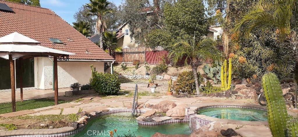This single-story Solar Powered Home is located in the” Victorian Estates Community”. It’s situated on a .46-acre lot in one of the most desirable neighborhoods of Wildomar. NO HOA and LOW PROPERTY TAX 3-bedroom 2-bath, 1812 sq ft home is the perfect combination of functionality, and charm. Enjoy the open floor plan, high beam ceilings, spacious living and dining room, Pot shelfs throughout the home to show off your pretty collectable. Designer ceiling fans and light fixtures, professionally laid tile floors and whole interior has been freshly painted. Lots of natural light in kitchen with huge windows, newer custom hickory cabinets, large breakfast bar, colorful pendent lights and a cozy bonus room with brick fireplace which leads out to the patio and swimming pool. Backyard has a variety of mature trees and flowers for a park like setting, custom tile patio with a gazebo and lots of steppingstones leading to the pool and different areas of the yard. Completely fenced with gate entrance for possible RV parking and four sheds for storage. New carpet in all three bedrooms. The master has 2 large closets and patio glass doors leading out to the pool. The spacious attached bathroom has custom tile designs in this large walk in shower and a colorful slate floor. Three car garage has lots of room for storage in the high ceiling rafters and washer and dryer hookups. Minutes to the 15 Freeway, with quick access to shopping, schools, hospitals, restaurants and the famous Lake Elsinore which is the largest freshwater lake in Southern CA, with boating, fishing, and water sports.