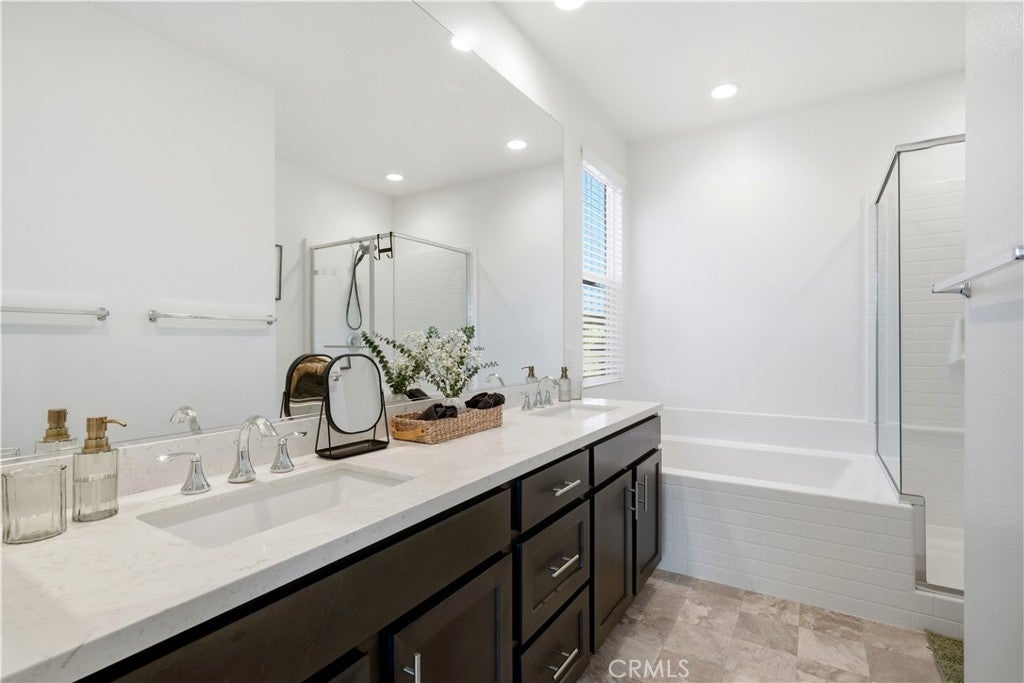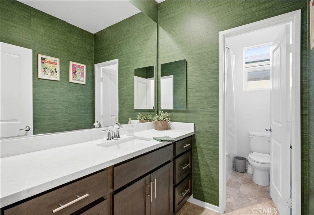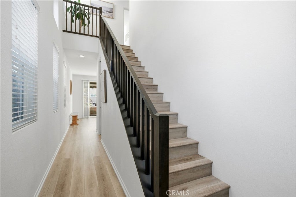 This move-in-ready home features an open floor plan, modern upgrades, and a low-maintenance outdoor living space. The kitchen includes espresso cabinetry, granite countertops, stainless-steel appliances, an oversized island with bar seating, and upgraded pendant lighting. The layout connects the kitchen, dining area, and living room, and includes an additional sliding glass door that increases natural light and access to the backyard. Interior upgrades include laminate flooring installed at purchase, updated light fixtures, a living room ceiling fan, and multiple TV mounts. The property is also equipped with 11 solar panels for improved energy efficiency. The second level offers spacious secondary bedrooms with large windows and ample closet space. The shared bathroom includes a dual-sink vanity with quartz counters and a separate shower and toilet room. The primary suite includes an ensuite bathroom with dual sinks, quartz countertops, and modern fixtures. An upstairs laundry room with a utility sink and storage cabinetry provides additional convenience. The backyard includes an aluminum patio cover with recessed lighting and ceiling fans, artificial turf, extended concrete work, a retaining wall, landscaping with trees, and a separate seating area with a firepit. The garage features a 240-volt electric vehicle charging outlet and overhead storage racks. Located within a well-maintained residential community with access to nearby parks, walking paths, shopping centers, schools, and commuter routes. This property provides a combination of functional upgrades and a flexible floor plan suitable for various living needs.