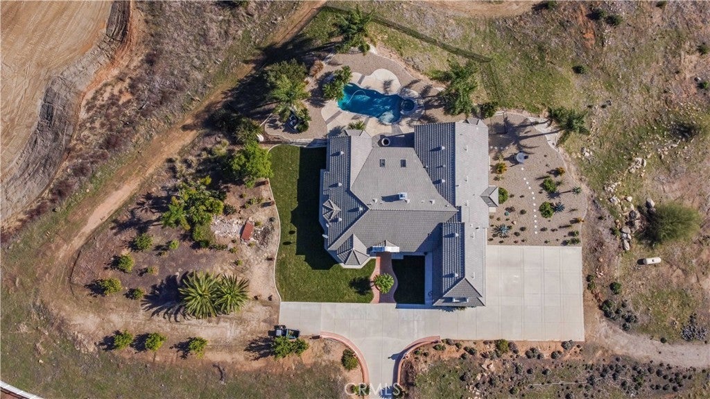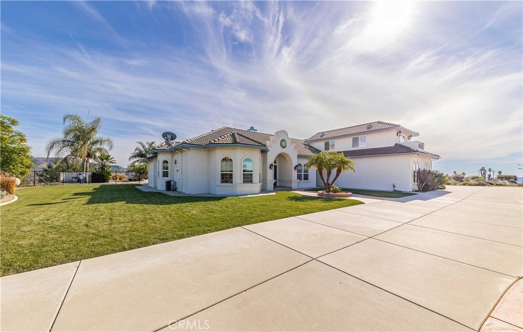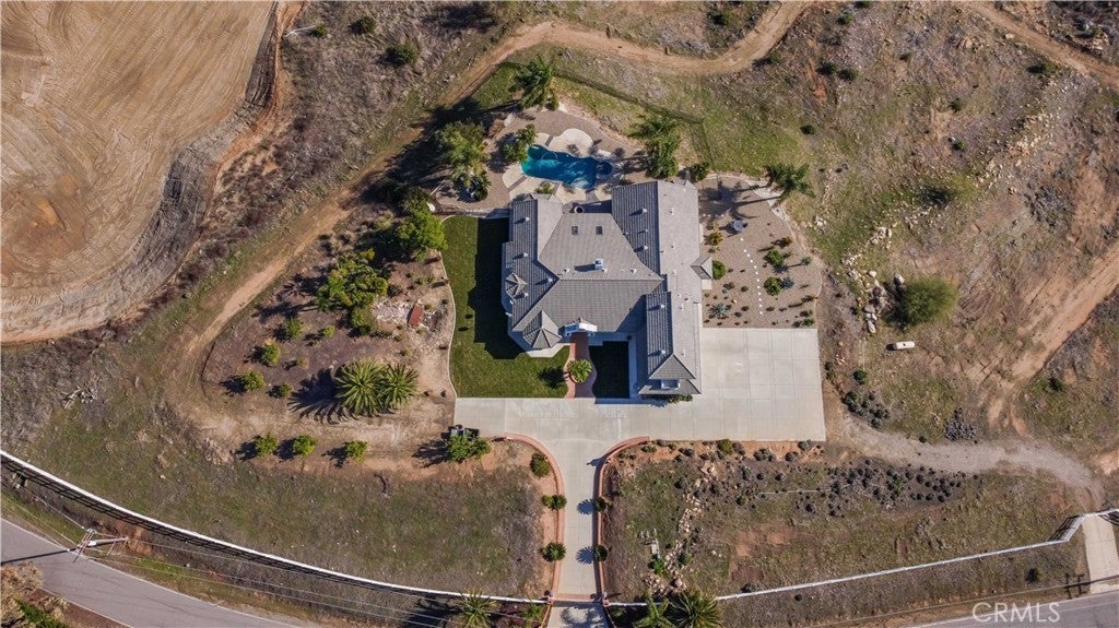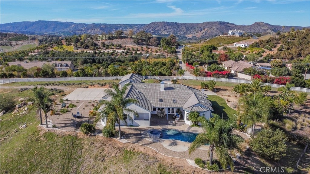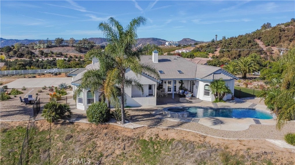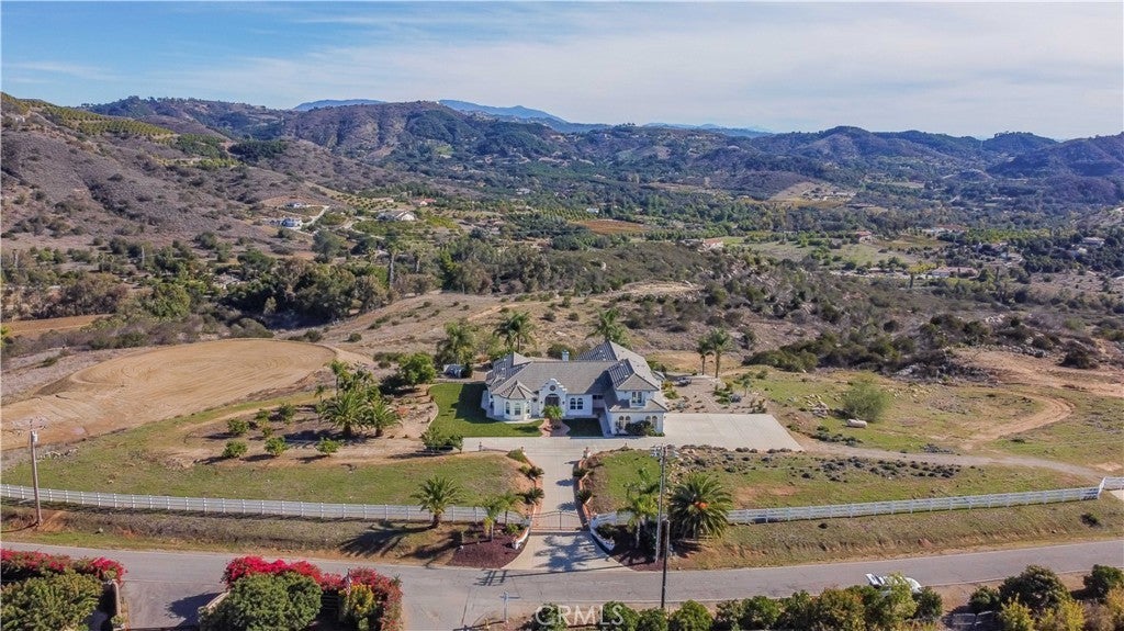 Welcome to 25025 Las Palmeras Drive, a commanding Mediterranean estate perched atop nearly five acres within the unmatched De Luz community of Temecula. From the moment you pass through the dual-gated entry and travel up the long, palm-lined driveway, this property delivers an extraordinary sense of arrival. Perfectly positioned on a hilltop with panoramic views of rolling hills, lush groves, and the entire De Luz valley, this home offers unmatched privacy, incredible scale, and the ultimate Southern California lifestyle. Built with timeless craftsmanship and meticulously maintained, the residence spans 4,275 sq. ft. and features soaring 11–12 foot coffered ceilings, extensive crown molding, solid oak flooring, and natural light flooding in from every angle. The grand foyer opens to formal living spaces anchored by a two-sided fireplace, French doors, and expansive windows framing the breathtaking views. The chef’s kitchen is both elegant and functional, offering granite countertops, custom white oak cabinetry, high-end appliances, a pot filler, double ovens, two islands, a veggie sink, and abundant storage—perfect for both everyday living and large-scale entertaining. All bedrooms are located on the main level, each oversized, ensuite, and beautifully appointed. The primary suite is a true retreat, complete with an enormous walk-in closet, luxurious soaking tub, spa-like shower, and private access to outdoor patios. Upstairs, a spectacular game room and wet bar serve as the ultimate entertainment space, complete with its own full bath and a balcony overlooking some of the most stunning vistas in all of Temecula. The outdoor living experience is resort caliber. A custom pool with spa and waterfall sits at the edge of the property, capturing sweeping hilltop views. The outdoor kitchen, fire pit, shaded lounge areas, and expansive patio space make this estate ideal for gatherings of any size. The grounds also feature low-maintenance landscaping, Birds of Paradise, manicured lawns, RV parking, space for 20+ vehicles, multiple flat pads ideal for an ADU or future development, and a charming walking path with a wooden bridge over a seasonal ravine. Located just minutes from Old Town Temecula, Wine Country, and the I-15, this home offers the best of privacy, convenience, and the coveted De Luz lifestyle. 25025 Las Palmeras Drive is a rare hilltop sanctuary offering space, elegance, and spectacular views in one unforgettable package.