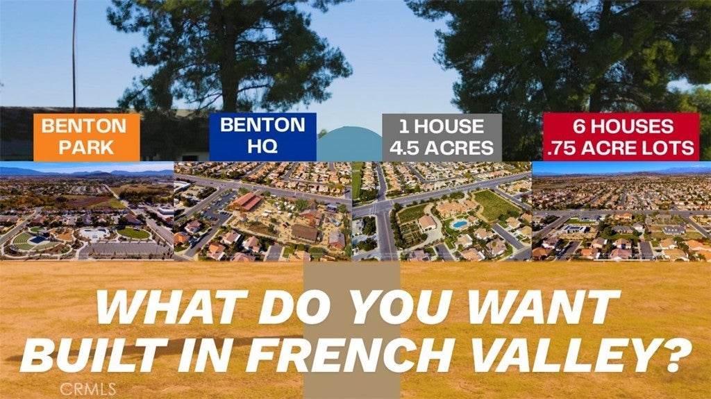The Sunset Ranch on Benton provides ample opportunities. Currently zoned for a single-family home on 4.36 Acres, this property may present an opportunity for rezoning through the county of Riverside. Whether you are potentially subdividing into several smaller lots, hoping for a live and work environment, looking at the Sunset Ranch for the next city or county development project, or for the possibility of commercial revenue, The Sunset Ranch on Benton is centrally located on Benton Rd, the closest thing to a “Main Street” in French Valley. Benton Rd runs through French Valley, becoming Clinton Keith at the 79S, eventually hitting both the 215 and 15 Freeways.The property is also close to housing, shopping, and commercial development, and is mostly flat and usable. It sits in the heart of French Valley, on the Main Street, in an unincorporated community of Winchester, California. This area sits in the highly desirable Temecula Valley Unified School District.Here are some possibilities to consider if rezoning is achieved through the county. Renderings have been provided in the pictures. Option 1: “Benton Park” would follow the layout of several 5-acre parks throughout the country, with an amphitheater, playground, walking trails, and a skate park. This would be a great place for French Valley residents to gather with friends and family, or for community events. I’d love to see the County of Riverside, or the City of Temecula, make this possible. Option 2: I call it “Benton Headquarters”, a shopping center like Vail Headquarters in Southern Temecula, which features several smaller local shops, bringing back opportunities for residents, local shopping, food, fun, performances, and music. Building community and memories, while generating commercial revenue for ownership. Or Option 3: “Housing” Keep this as a single-family home for one family on a large lot, or multiple families, subdividing into 6 lots, each about ¾ of an acre. These homes would feature Temecula Valley Schools, large flat usable lots, and would be walking distance from parks, restaurants, and shopping. Perfect for a family compound, or a smaller developer. For a property like this one, the possibilities are endless. Everything would have to be approved, permitted, and rezoned with the county, but an opportunity like this only comes along - once in a great while…It would be nice to see something good for French Valley, and the people who live here.