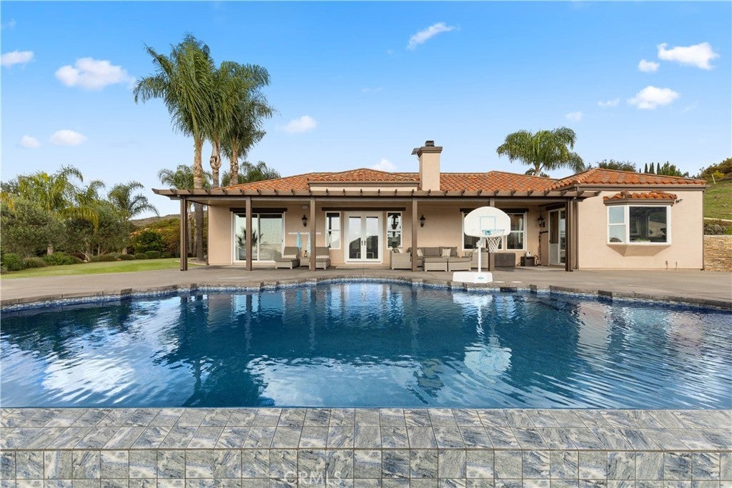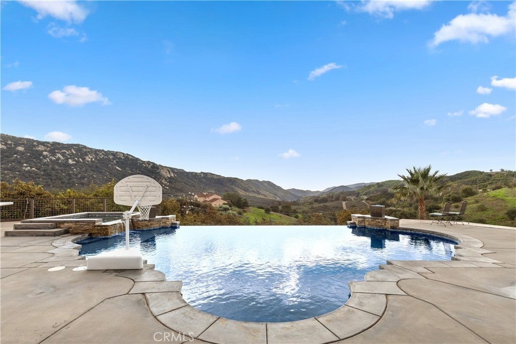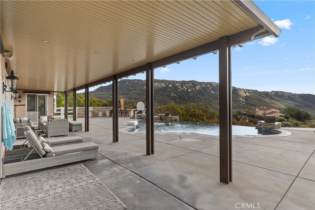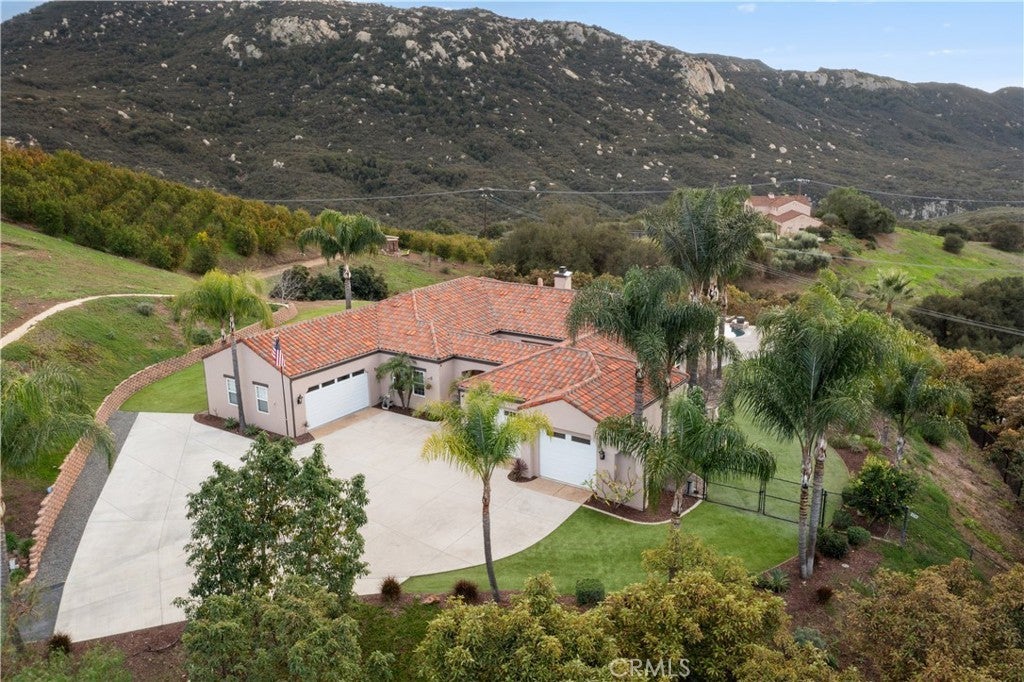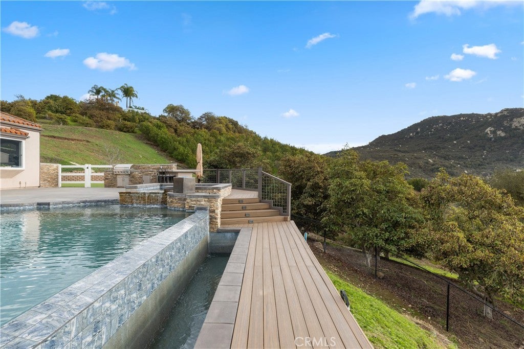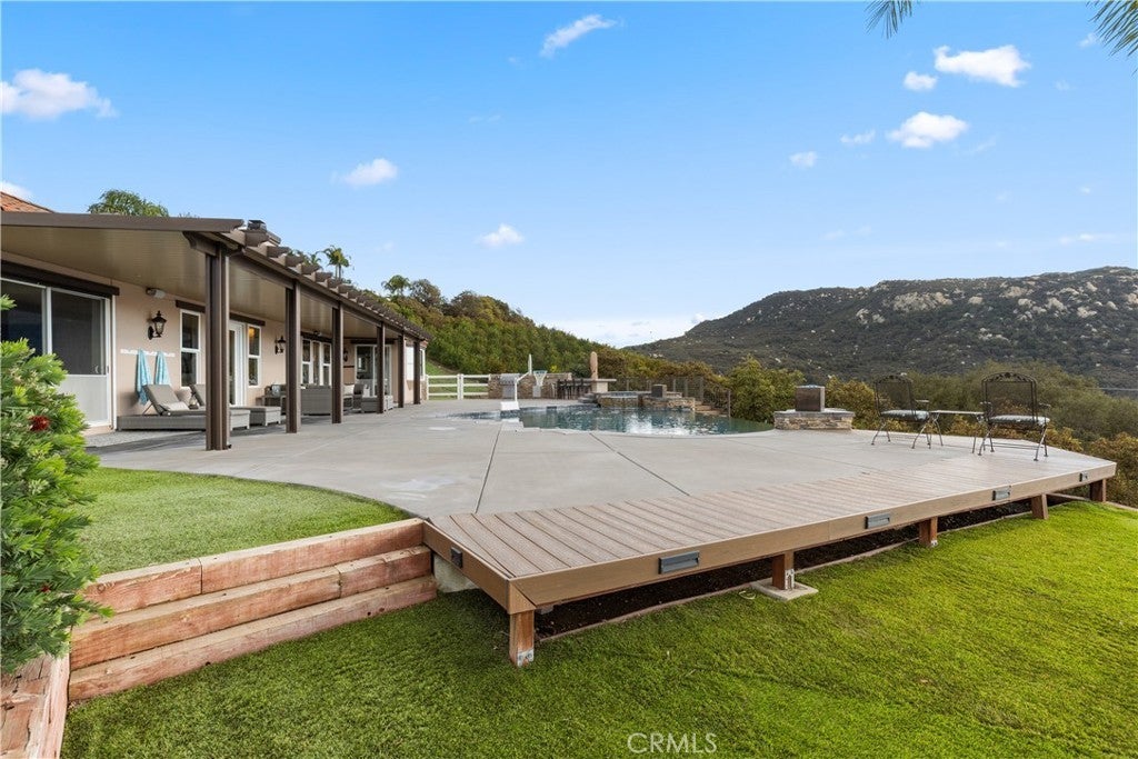 Incredible canyon and sunset views set the stage for this luxury De Luz estate pool home, perched at the end of a private cul-de-sac on over 4.55 acres of productive orchard land overlooking the protected Santa Margarita Preserve. This 4-bedroom, 3.5-bath, 3,272 sq ft residence offers the perfect blend of privacy, elegance, and resort-style living, complete with a breathtaking saltwater infinity-edge pool and spa framed by sweeping hillside vistas. A palm-lined paved driveway leads to a charming courtyard and oversized leaded double doors opening to a light-filled, open floor plan designed for entertaining. Interior features include new interior paint, crown molding, smooth hand-textured walls, graded baseboards, ceiling fans, exterior electric window shades, and carpeted bedrooms. Formal living and dining rooms flow into a welcoming family room with fireplace and a gourmet kitchen featuring a six-burner Viking stove, double KitchenAid ovens, quartz countertops, Bosch dishwasher, walk-in pantry, built-in buffet with wine refrigerator, breakfast bar, and eat-in dining area. The primary suite is a private retreat offering a walk-in closet, spa-style bath with dual sinks, vanity, jetted tub, walk-in shower, and a private office located just off the suite. Two guest bedrooms share a Jack-and-Jill bathroom with dual sinks, providing comfort and functionality. Outdoor living is exceptional with a custom deck surrounding the infinity pool and spa, an Alumawood-covered patio, built-in BBQ, two blue bowl fire pits, outdoor refrigerator, and expansive entertaining spaces ideal for enjoying unforgettable sunsets. The property includes over 200 avocado trees and more than 340 tangerine trees, along with fig, lemon, lime, pomegranate, Asian pear, and olive trees. Additional features include RV parking, room for an ADU, custom chicken coop with run, whole-house fan, dedicated laundry room, ample storage, and a charming half bath with custom wine barrel sink. Located just minutes from Old Town Temecula, wine country, golf, dining, and Pechanga Resort & Casino. Unincorporated Riverside County offers lower tax rates and the option for Temecula or Murrieta schools. A rare opportunity to own a true luxury orchard estate with views, privacy, and lifestyle.