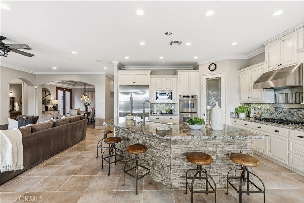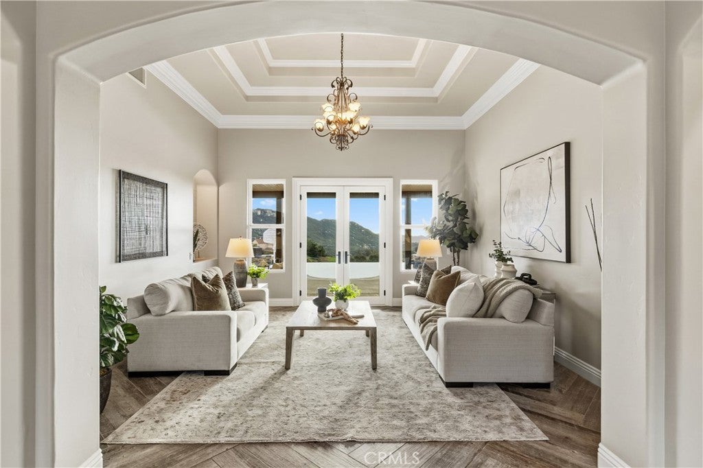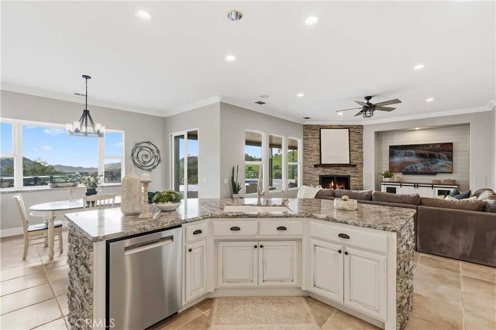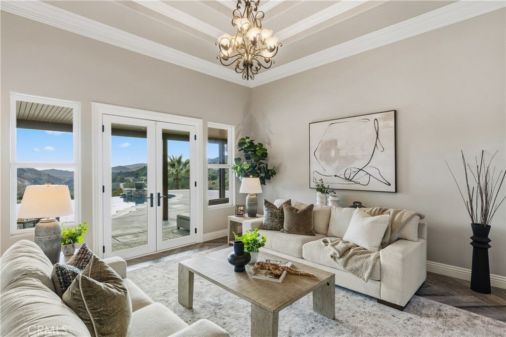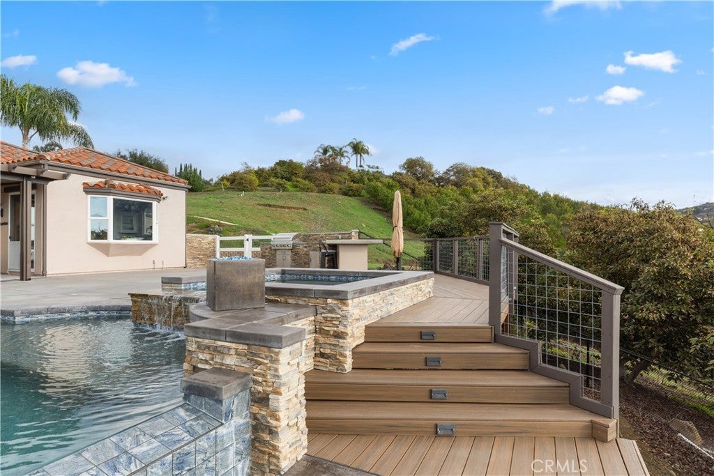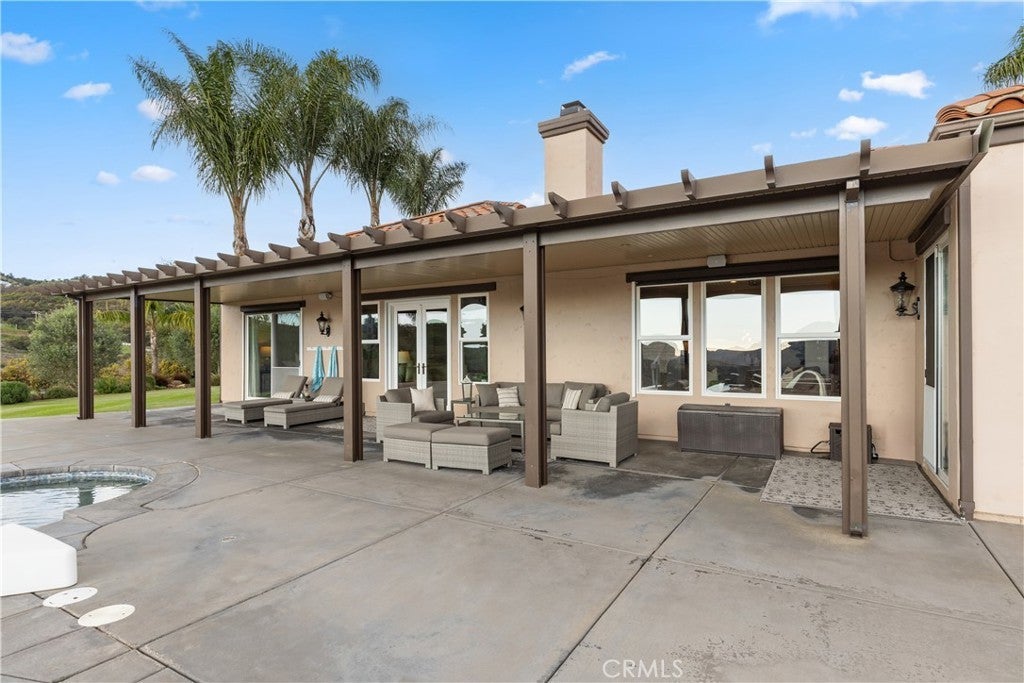 Incredible canyon and sunset views set the stage for this luxury De Luz estate pool home, perched at the end of a private cul-de-sac on over 4.55 acres of productive orchard land overlooking the protected Santa Margarita Preserve. This 4-bedroom, 3.5-bath, 3,272 sq ft residence offers the perfect blend of privacy, elegance, and resort-style living, complete with a breathtaking saltwater infinity-edge pool and spa framed by sweeping hillside vistas. A palm-lined paved driveway leads to a charming courtyard and oversized leaded double doors opening to a light-filled, open floor plan designed for entertaining. Interior features include new interior paint, crown molding, smooth hand-textured walls, graded baseboards, ceiling fans, exterior electric window shades, and carpeted bedrooms. Formal living and dining rooms flow into a welcoming family room with fireplace and a gourmet kitchen featuring a six-burner Viking stove, double KitchenAid ovens, quartz countertops, Bosch dishwasher, walk-in pantry, built-in buffet with wine refrigerator, breakfast bar, and eat-in dining area. The primary suite is a private retreat offering a walk-in closet, spa-style bath with dual sinks, vanity, jetted tub, walk-in shower, and a private office located just off the suite. Two guest bedrooms share a Jack-and-Jill bathroom with dual sinks, providing comfort and functionality. Outdoor living is exceptional with a custom deck surrounding the infinity pool and spa, an Alumawood-covered patio, built-in BBQ, two blue bowl fire pits, outdoor refrigerator, and expansive entertaining spaces ideal for enjoying unforgettable sunsets. The property includes over 200 avocado trees and more than 340 tangerine trees, along with fig, lemon, lime, pomegranate, Asian pear, and olive trees. Additional features include RV parking, room for an ADU, custom chicken coop with run, whole-house fan, dedicated laundry room, ample storage, and a charming half bath with custom wine barrel sink. Located just minutes from Old Town Temecula, wine country, golf, dining, and Pechanga Resort & Casino. Unincorporated Riverside County offers lower tax rates and the option for Temecula or Murrieta schools. A rare opportunity to own a true luxury orchard estate with views, privacy, and lifestyle.