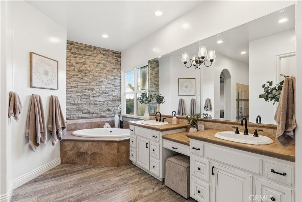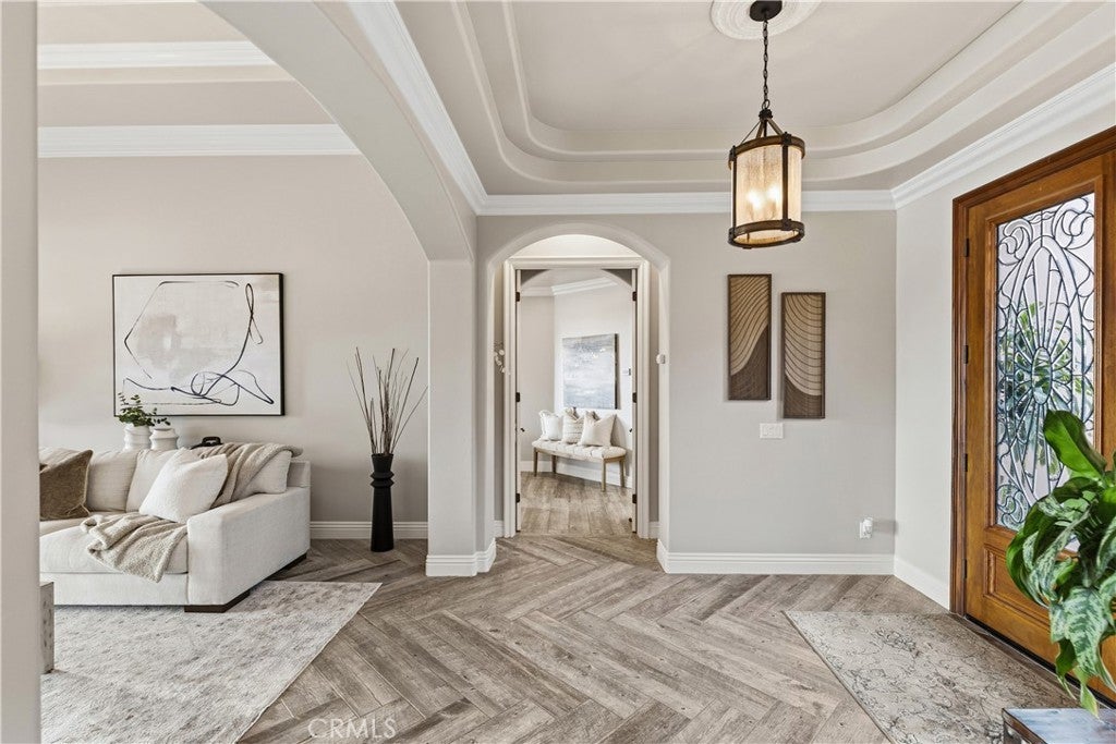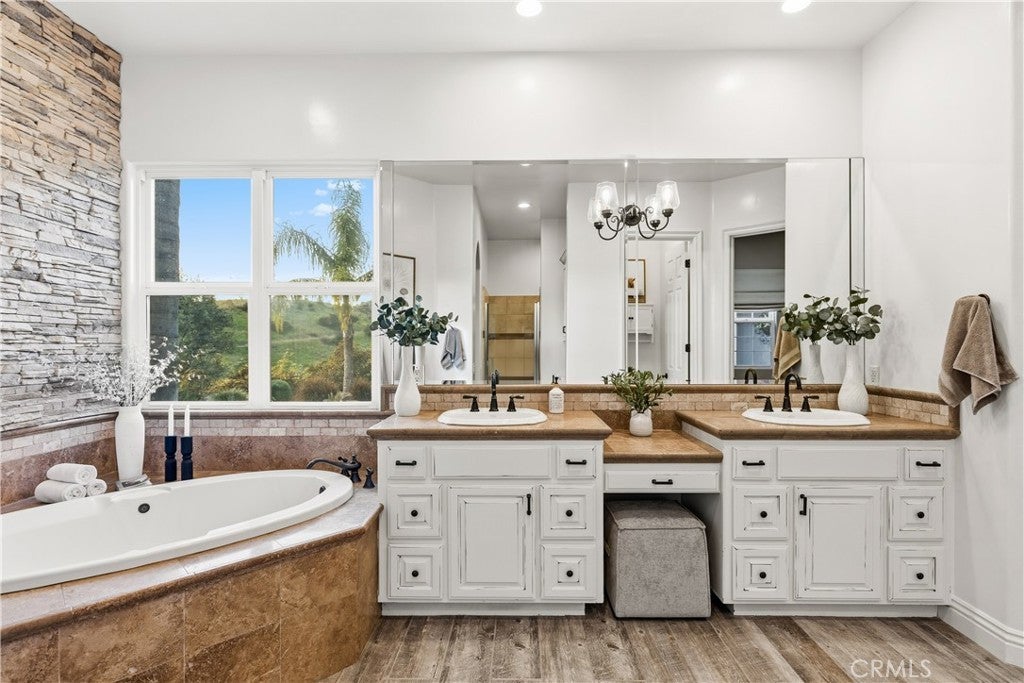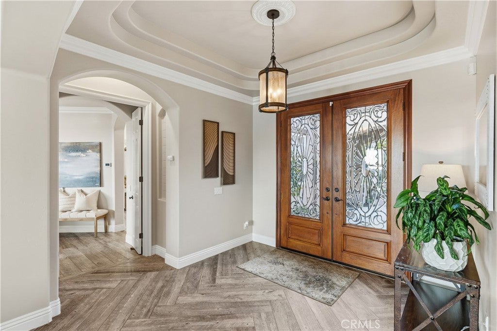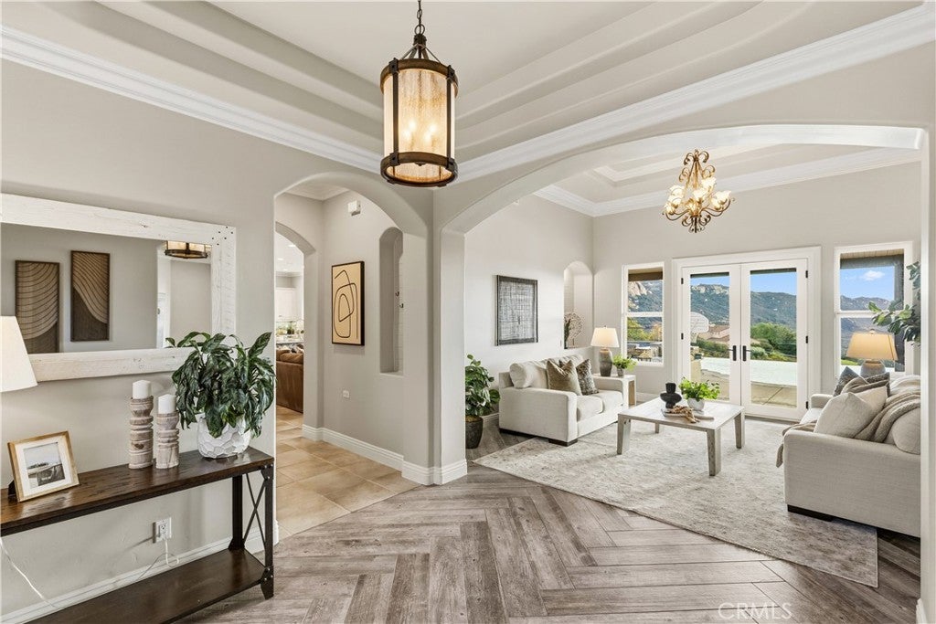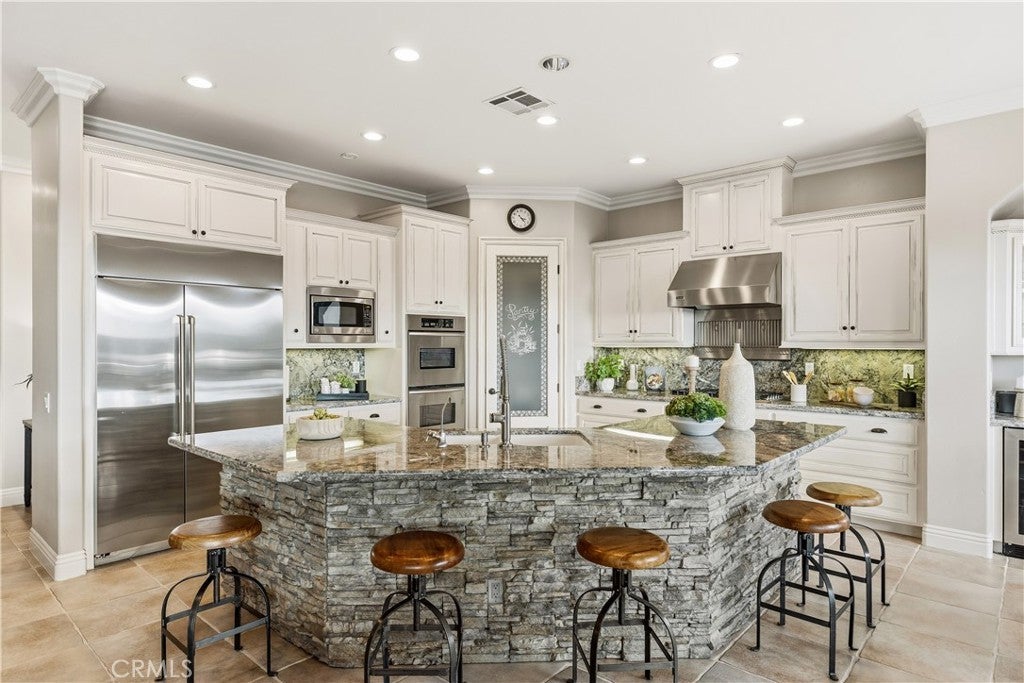 Incredible canyon and sunset views set the stage for this luxury De Luz estate pool home, perched at the end of a private cul-de-sac on over 4.55 acres of productive orchard land overlooking the protected Santa Margarita Preserve. This 4-bedroom, 3.5-bath, 3,272 sq ft residence offers the perfect blend of privacy, elegance, and resort-style living, complete with a breathtaking saltwater infinity-edge pool and spa framed by sweeping hillside vistas. A palm-lined paved driveway leads to a charming courtyard and oversized leaded double doors opening to a light-filled, open floor plan designed for entertaining. Interior features include new interior paint, crown molding, smooth hand-textured walls, graded baseboards, ceiling fans, exterior electric window shades, and carpeted bedrooms. Formal living and dining rooms flow into a welcoming family room with fireplace and a gourmet kitchen featuring a six-burner Viking stove, double KitchenAid ovens, quartz countertops, Bosch dishwasher, walk-in pantry, built-in buffet with wine refrigerator, breakfast bar, and eat-in dining area. The primary suite is a private retreat offering a walk-in closet, spa-style bath with dual sinks, vanity, jetted tub, walk-in shower, and a private office located just off the suite. Two guest bedrooms share a Jack-and-Jill bathroom with dual sinks, providing comfort and functionality. Outdoor living is exceptional with a custom deck surrounding the infinity pool and spa, an Alumawood-covered patio, built-in BBQ, two blue bowl fire pits, outdoor refrigerator, and expansive entertaining spaces ideal for enjoying unforgettable sunsets. The property includes over 200 avocado trees and more than 340 tangerine trees, along with fig, lemon, lime, pomegranate, Asian pear, and olive trees. Additional features include RV parking, room for an ADU, custom chicken coop with run, whole-house fan, dedicated laundry room, ample storage, and a charming half bath with custom wine barrel sink. Located just minutes from Old Town Temecula, wine country, golf, dining, and Pechanga Resort & Casino. Unincorporated Riverside County offers lower tax rates and the option for Temecula or Murrieta schools. A rare opportunity to own a true luxury orchard estate with views, privacy, and lifestyle.