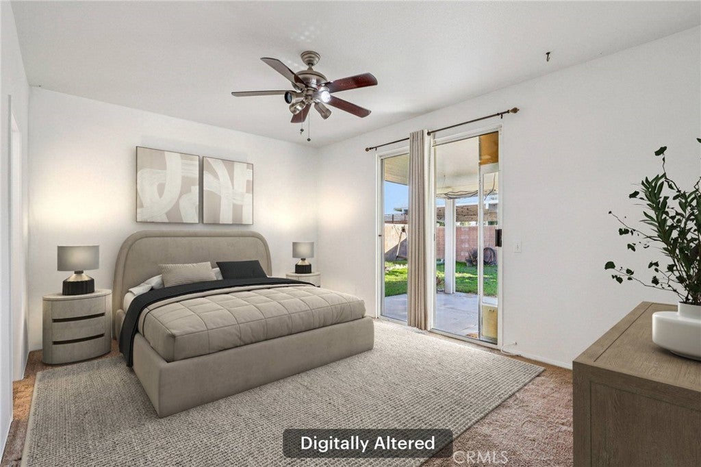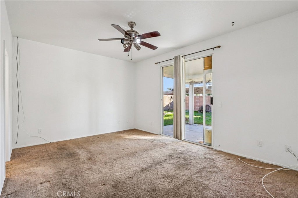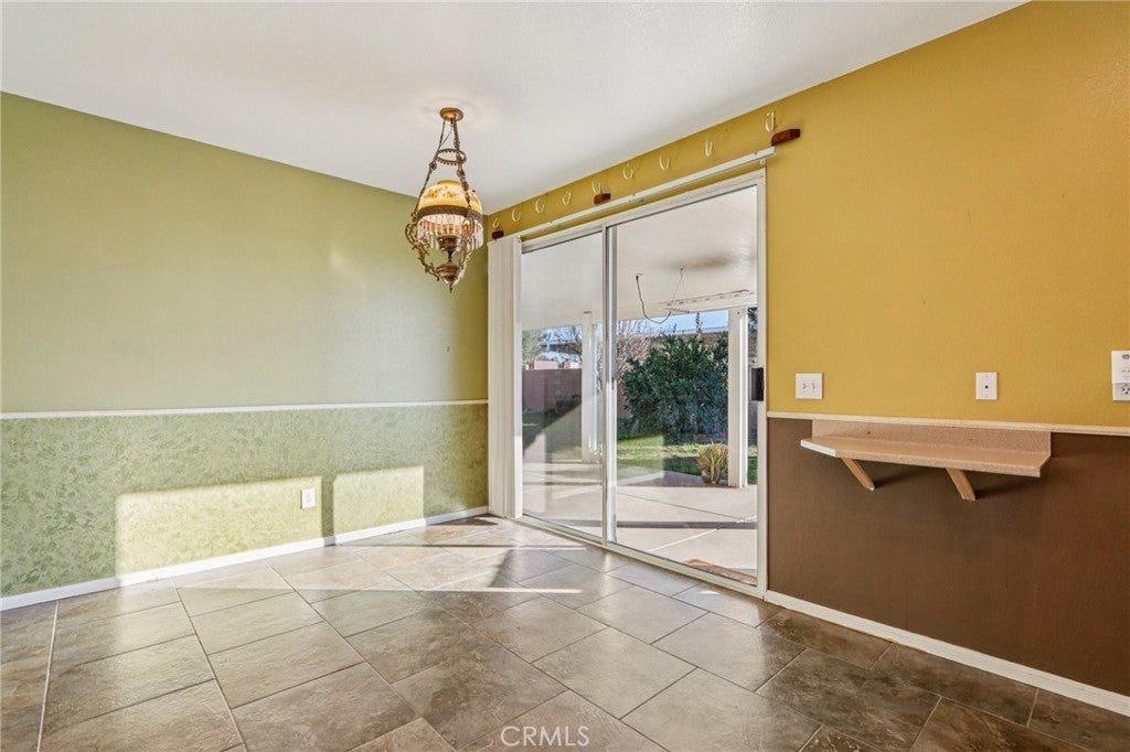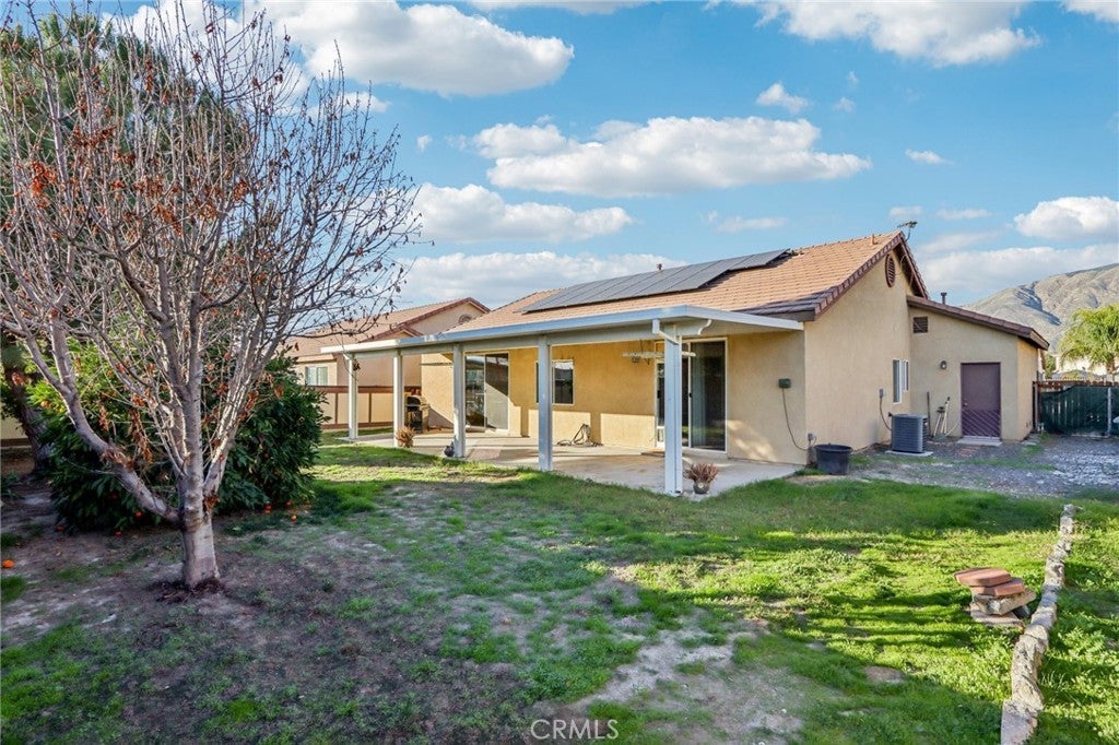 Single-story home with mountain views at the front and an owned solar system, offering bright living spaces and a functional, well-designed layout. Go inside to a welcoming living room filled with great natural light and finished with durable wood look ceramic tile flooring. The open kitchen and dining area feature tile flooring, a pantry for added storage, and a sliding glass door that opens directly to the backyard—perfect for indoor-outdoor living. The spacious backyard includes a covered patio ideal for relaxing, entertaining, or enjoying evening meals outdoors. The private primary suite offers a peaceful retreat with its own sliding glass door to the patio, a generous en suite bathroom complete with dual sink vanity, soaking tub, separate shower, and a walk-in closet. Two additional bedrooms and a full bathroom provide flexibility for guests, family, or a home office. Conveniently located at the end of the hallway, is a spacious laundry room and direct access to the 3-car garage—ideal for vehicles, storage, or hobbies. Situated close to local markets and dining options, this move-in-ready home combines comfort, efficiency, and scenic surroundings for everyday living.