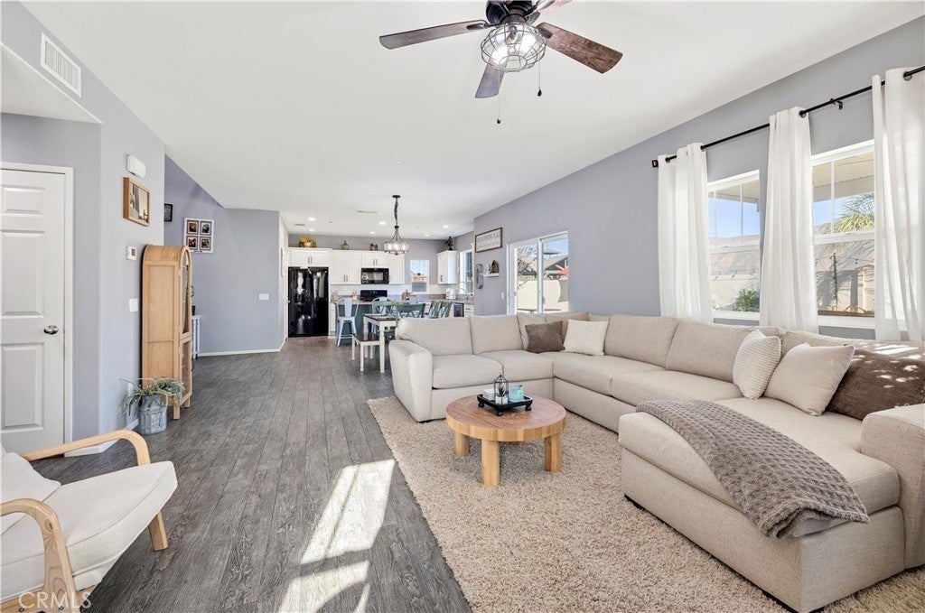 Spacious five-bedroom, three-bathroom home for sale in San Jacinto, California, offering a versatile floor plan, upgraded interior finishes, and scenic mountain views. This well-maintained property features a two-car attached garage plus an additional separate one-car garage, providing flexible space for parking, storage, or other uses. The home welcomes you with high ceilings at the entry and a bright, open layout. The upgraded kitchen includes modern finishes and ample cabinetry, flowing seamlessly into the main living areas for comfortable everyday living. A full bedroom and full bathroom are conveniently located on the main level, offering flexibility for a variety of living arrangements. Upstairs, the primary bedroom features two closets and an en-suite bathroom. Tile flooring throughout the downstairs provides durability and easy maintenance. A glass door opens to the backyard, where you’ll enjoy mountain views, no rear neighbors, and a sense of openness. The property also offers potential RV parking. Located in a desirable San Jacinto neighborhood near shopping, parks, and commuter routes, this home combines space, privacy, and location. Buyers are encouraged to verify all information, including square footage, lot features, and parking options.