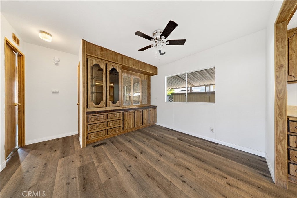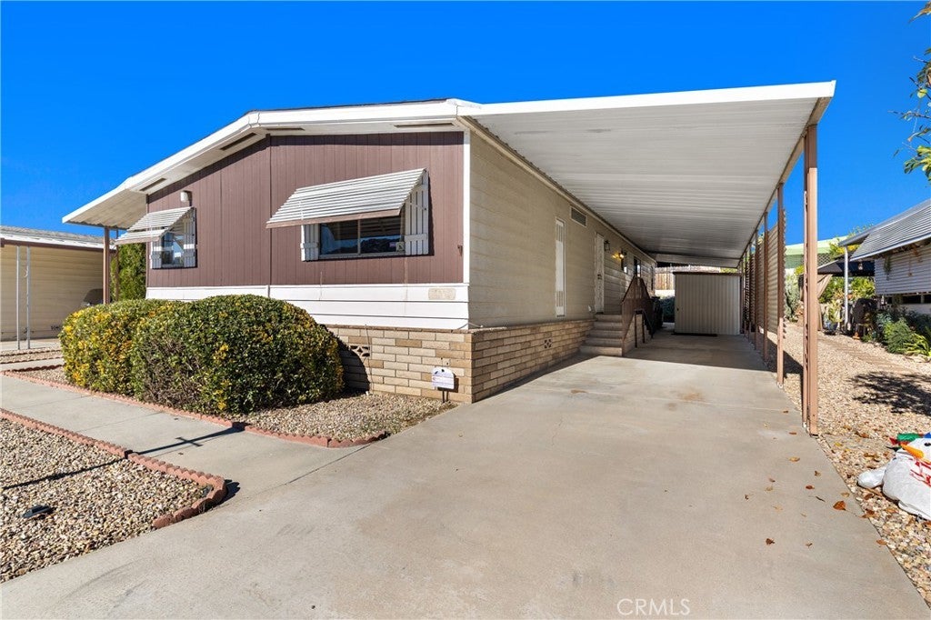 Spacious, split floor plan manufactured home in own-your-own lot Highland Palms 55+ Senior Estates boasts a bedroom and bath at opposite ends of the home for maximum privacy. Formal entry with coat closet. Living room/dining room "L" has ceiling fan, built-in buffet and china hutch with loads of cabinets. Large family room and built-in cabinet and shelves. Kitchen has 5-burner gas stove, stainless sink, newer oven, breakfast bar, and butler's pantry. Primary bedroom has carpet, sunken tub, separate shower, and Walk-in closet. Inside laundry with gas dryer hookups. Guest bedroom/bath has large vanity and tub/shower. Laminated flooring t/o most of the main living area, vertical blinds, ceiling fans, and loads of extra linen/closet space. Block-work steps and skirting, security door. Large aluminum awning covered front porch and patio. 2 sheds (1 with electrical), peach tree. Extra high carport will accommodate taller vehicles. Association fee $144/mo. Amenities include 9-hole executive golf course, clubhouse, swimming pool, spa, sauna, fitness center, library, card room, billiards, a large full kitchen and bar area, Veterans Memorial, a sun deck, outdoor picnic area, barbecue area, and more!